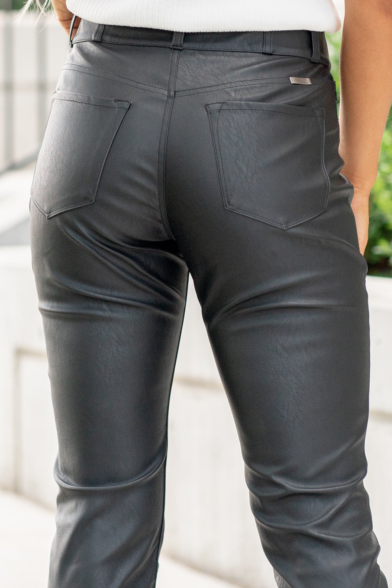 These high-rise skinny straight jeans in a black pleather offer both style and comfort. They come with a wide waistband and double buttons for a secure fit, and their comfort stretch ensures a relaxed feel. With a zipper fly, fake pocket details, and a regular hem, they're a versatile addition to your wardrobe, perfect for various occasions.