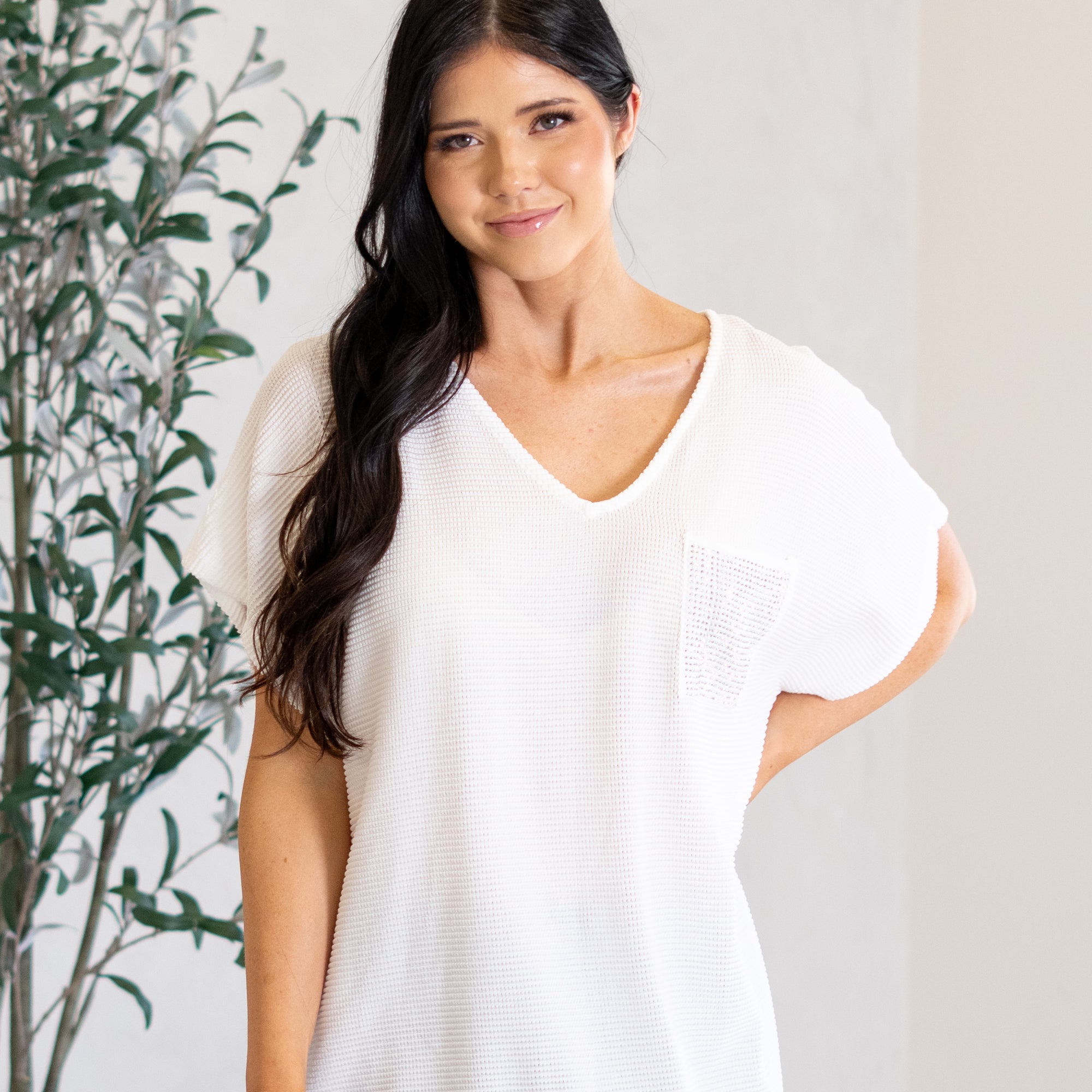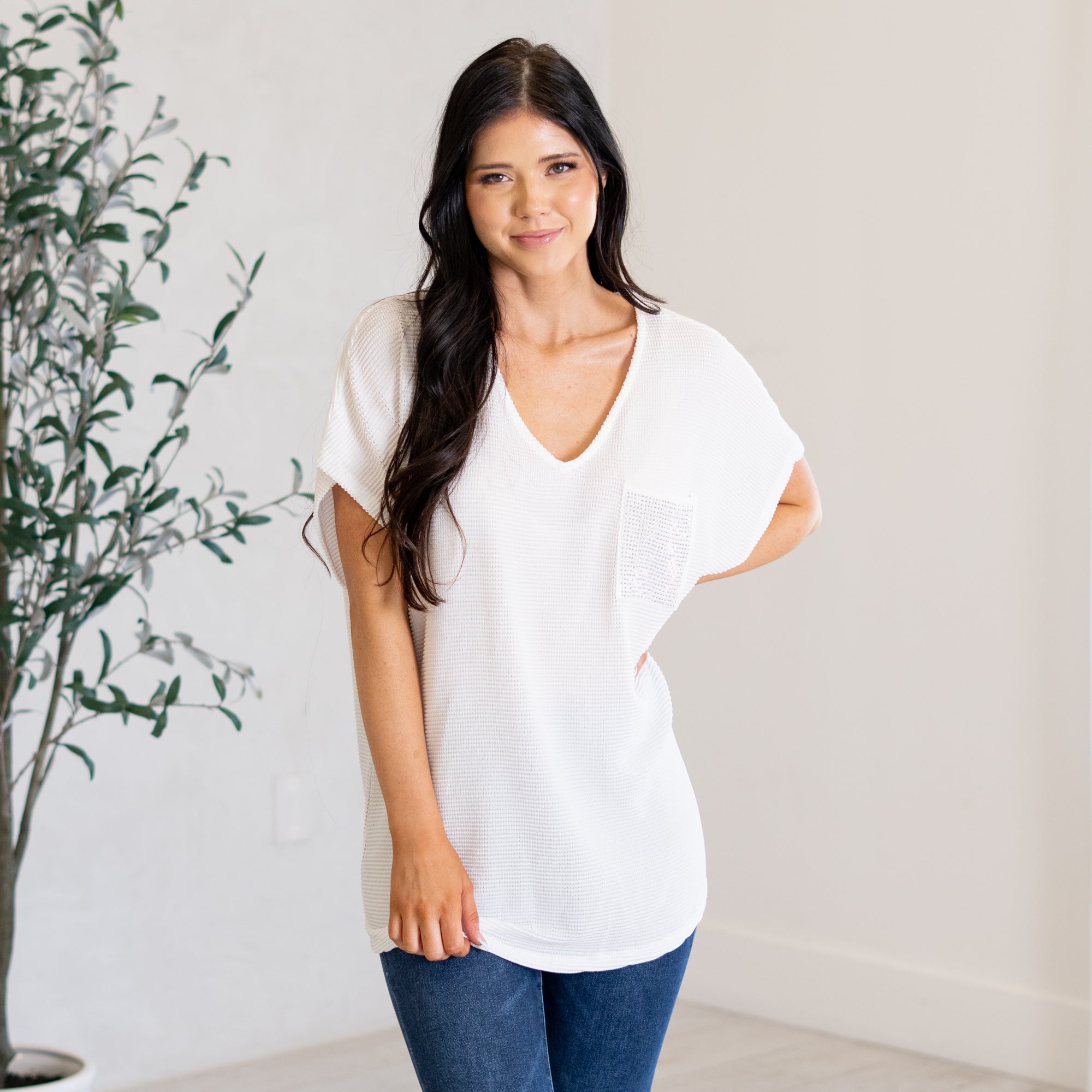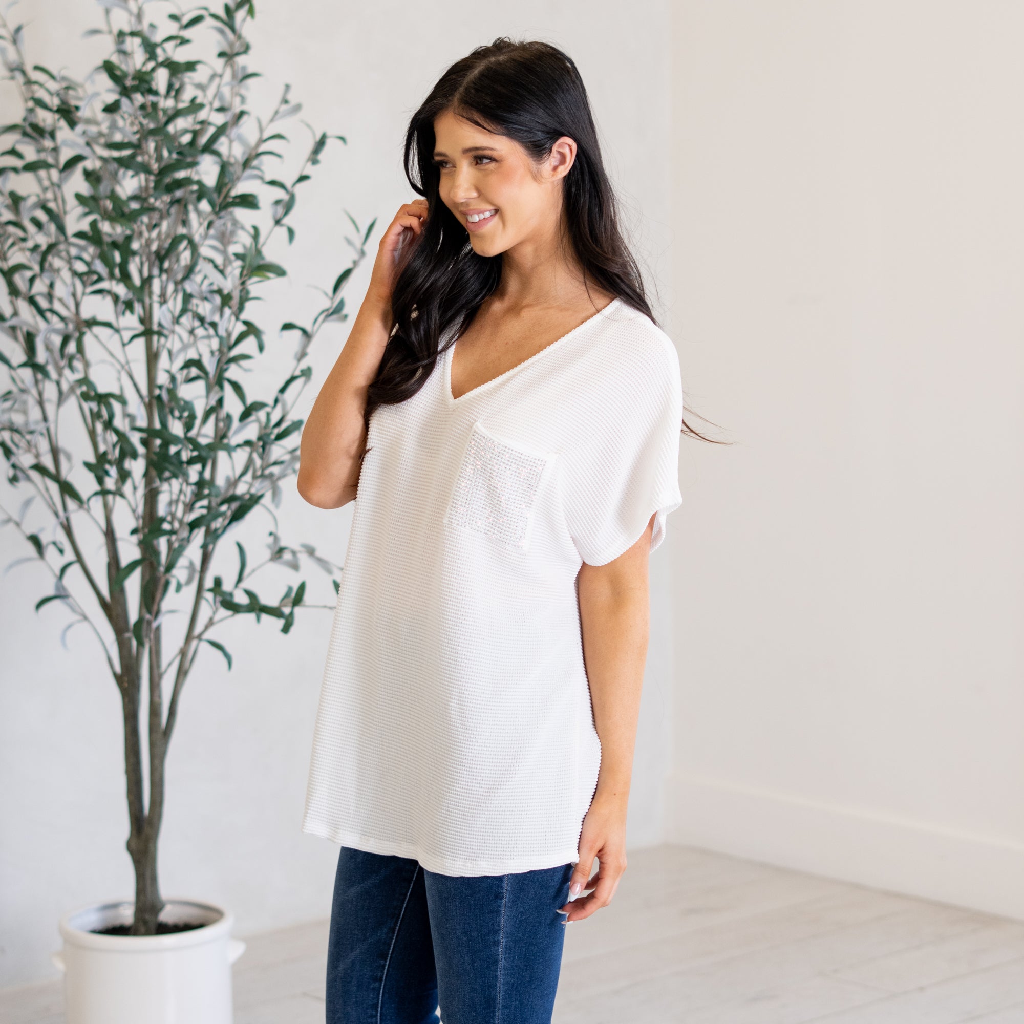 Sparkle Pocket V Neck Top