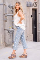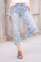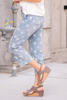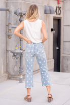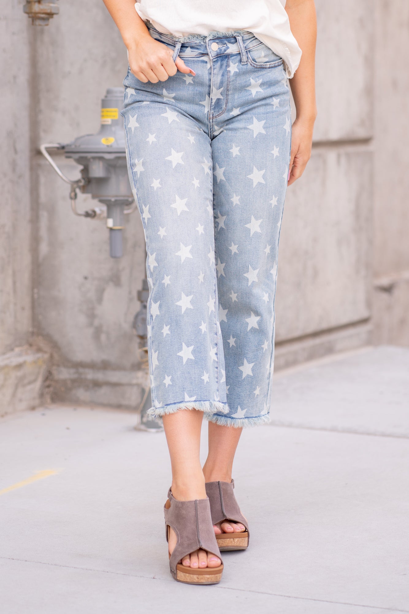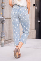 These light blue straight leg styled jeans feature a high-rise and a straight leg design with a cropped hem. They're made of 4-way stretch denim for maximum comfort and flexibility.
