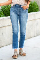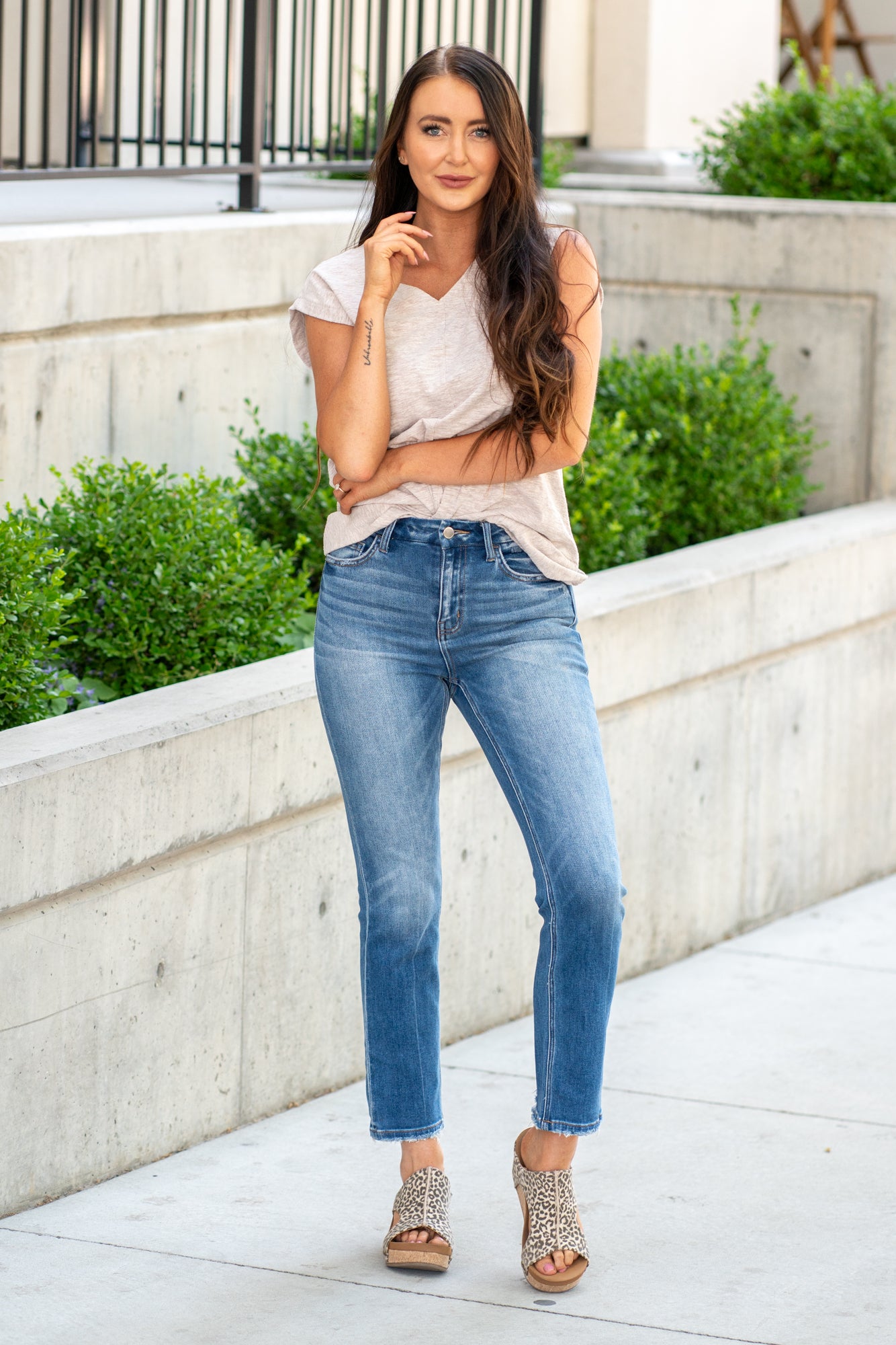 The Posed straights are high-rise comfort stretch denim with a medium blue wash and timeless fit.