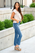 Alexis wears a size 25 in jeans, a small in tops, and 7 in shoes. She is wearing size 25 in these jeans.