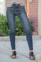 These mid-rise cut hem skinny jeans are designed for both style and comfort. The cut hem adds a trendy touch, while the 4-way stretch fabric ensures a flexible and comfortable fit. Whether you're dressing up or going for a casual look, these jeans offer versatility and fashion-forward appeal.