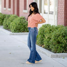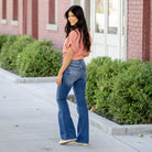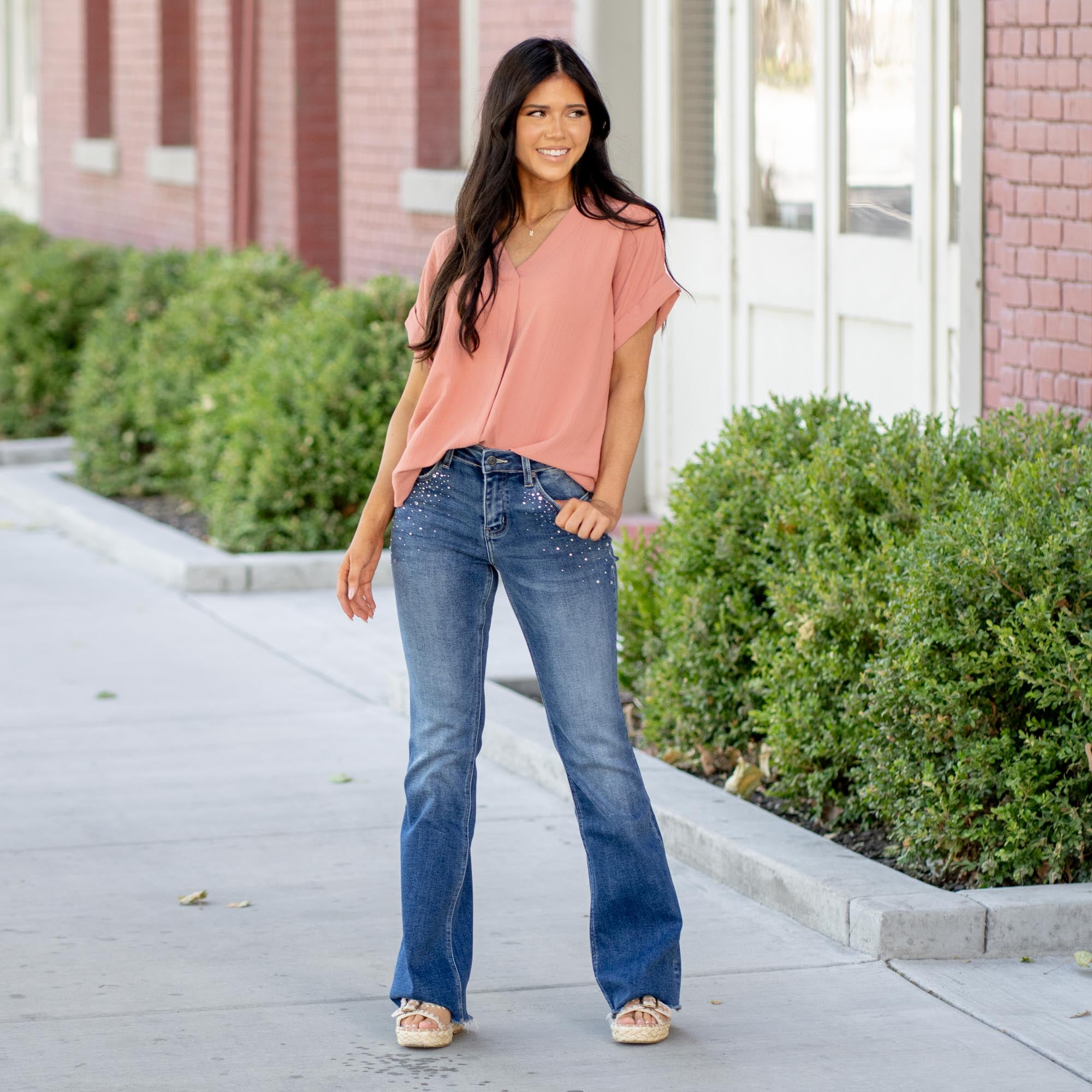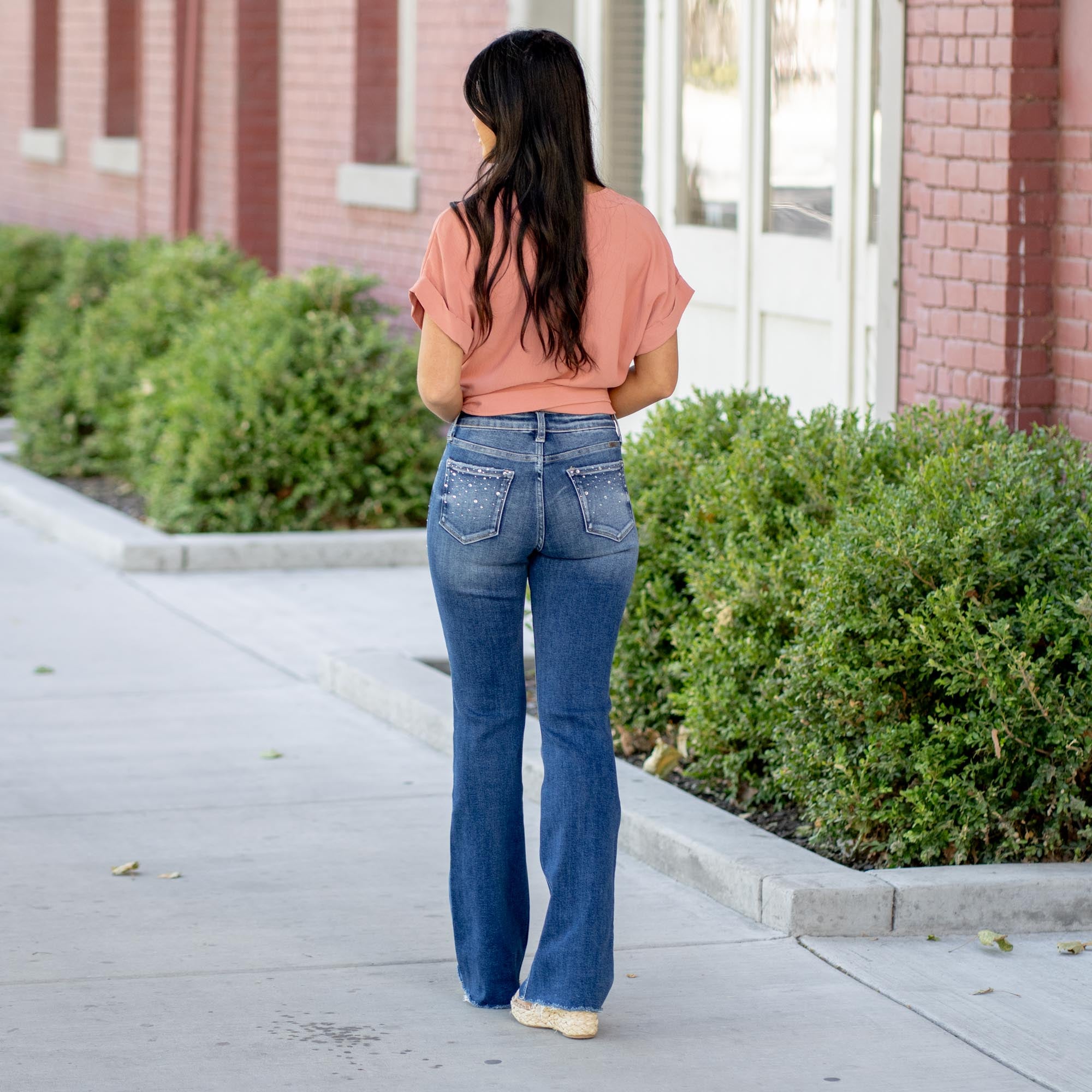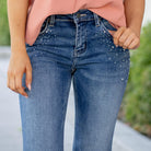 Make a statement with the Shimmer Mid Rise Flare Jeans, designed in a rich dark wash and adorned with just the right amount of sparkle. Rhinestone studs trace the front pockets, cascading toward the thigh, while the back pockets are finished with matching crystal accents for a touch of glam from every angle.