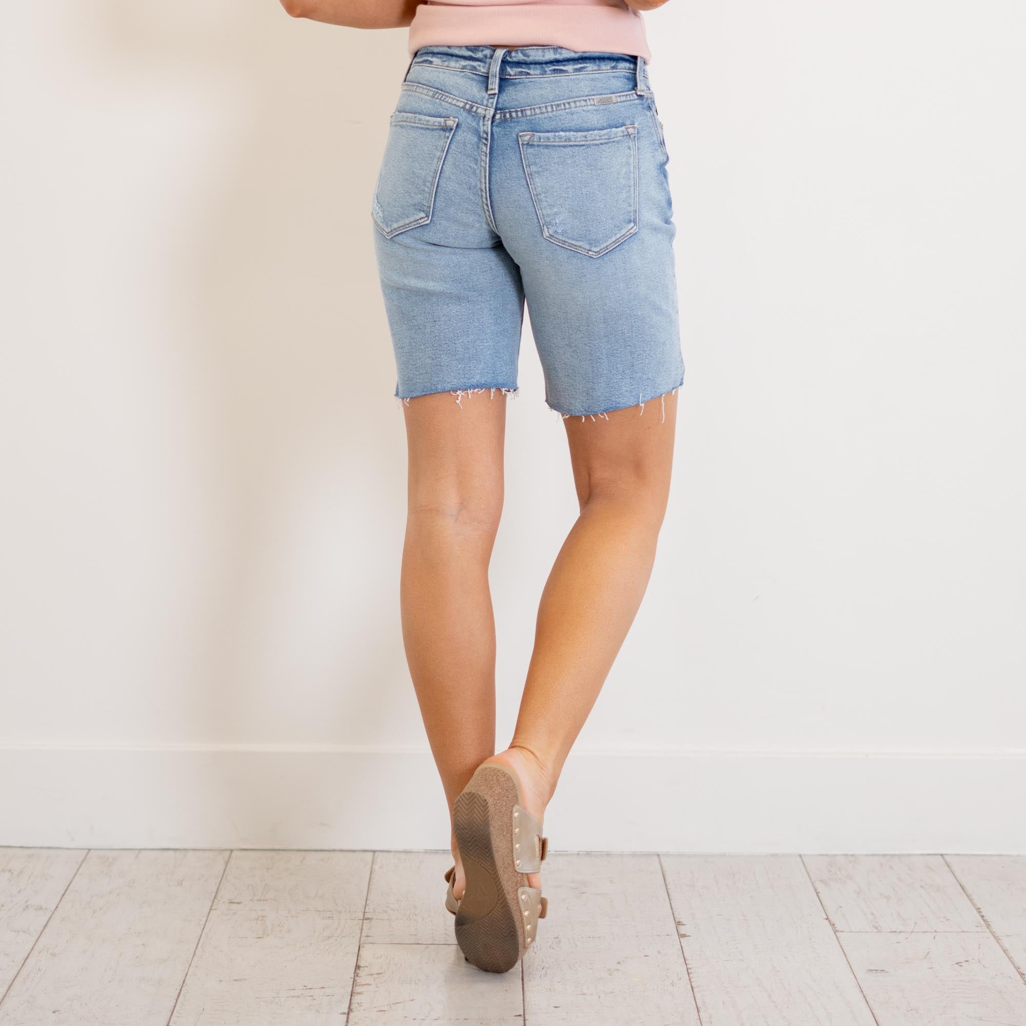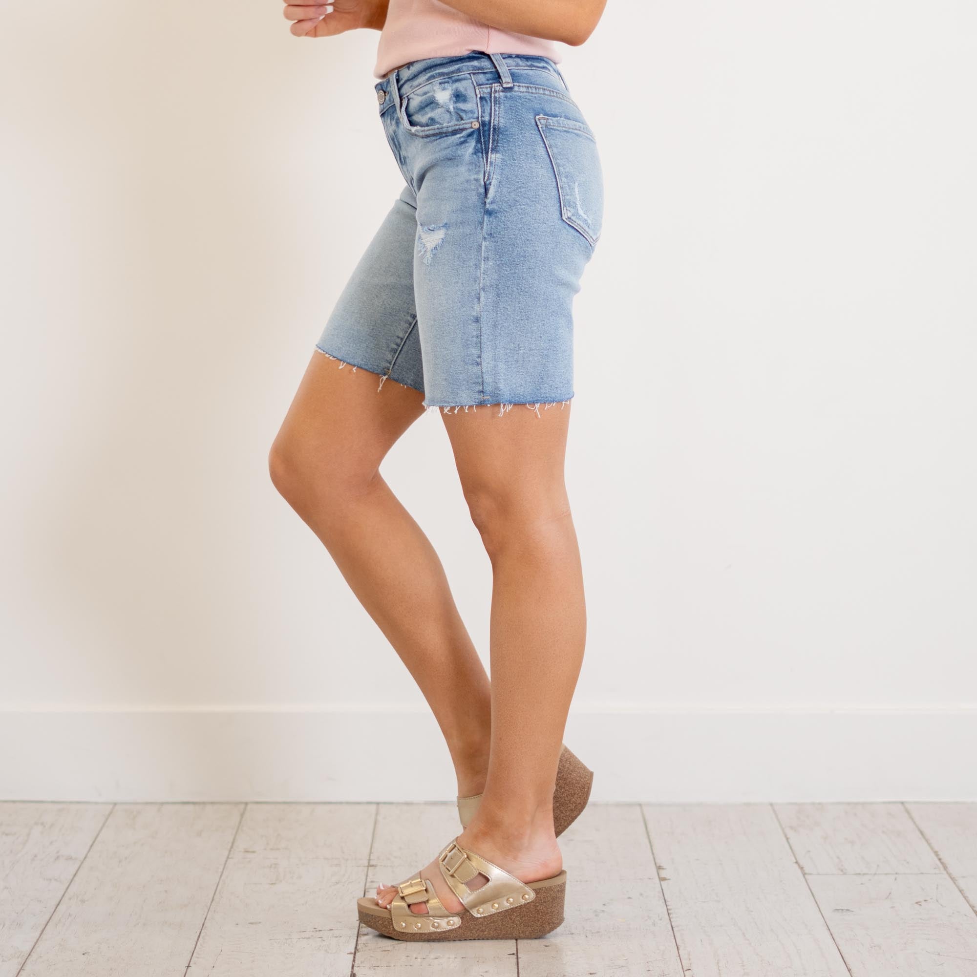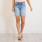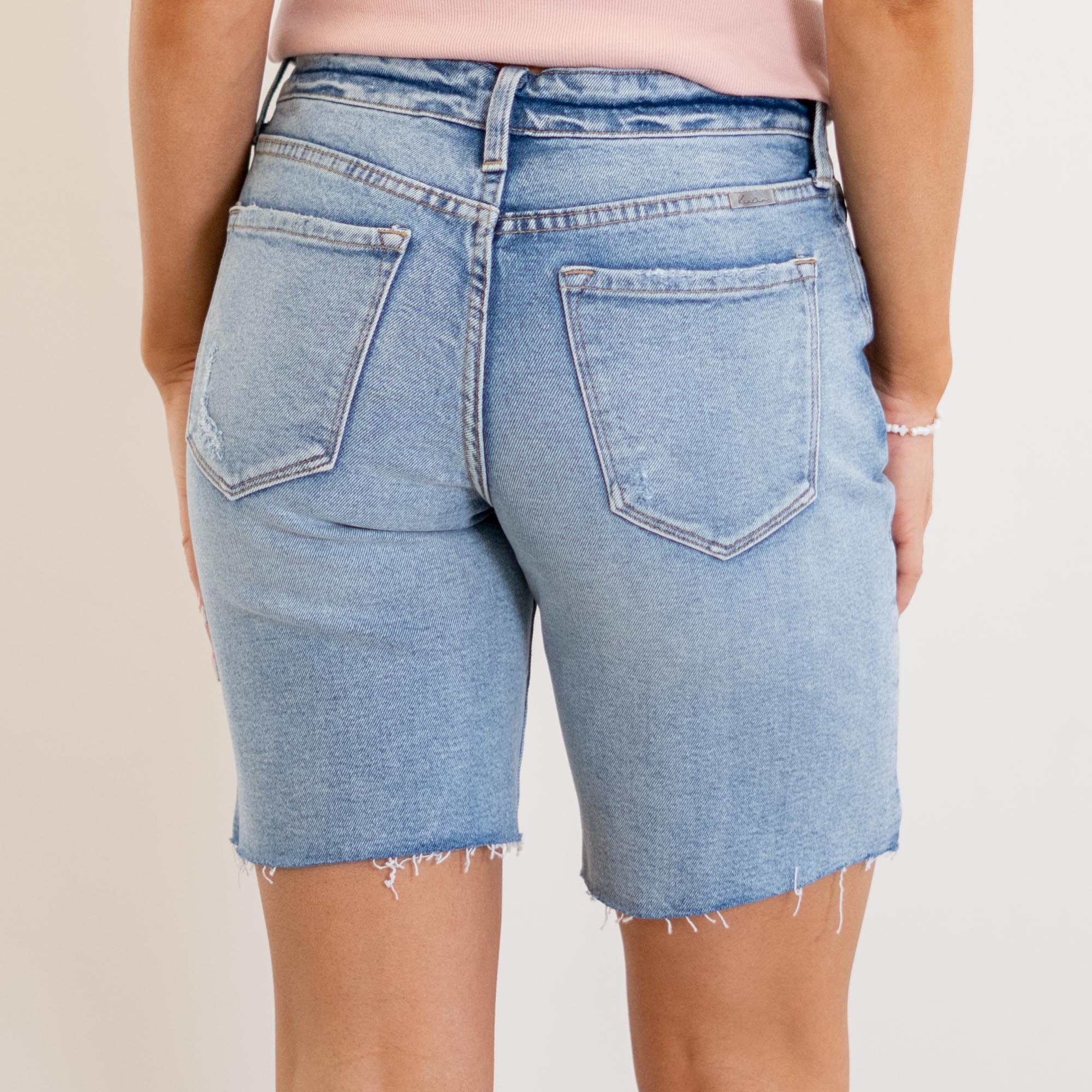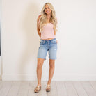 Your new everyday essential. The Talia Mid Rise Bermuda Shorts feature a classic medium wash and a flattering mid-rise fit that sits comfortably just below the waist for an easy, relaxed feel.