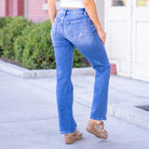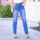 A timeless fit with just the right touch of edge, our Quicker jeans are made for everyday wear. Designed with a flattering mid rise waist and a full-length straight leg, this pair gives you a clean, easy silhouette that never goes out of style. The medium dark wash makes them easy to dress up or down, while the comfort stretch denim keeps them feeling flexible and comfortable throughout the day. Finished with lightly distressed detail, a clean hem, and classic 5-pocket styling, these jeans are an effortless staple for any season.