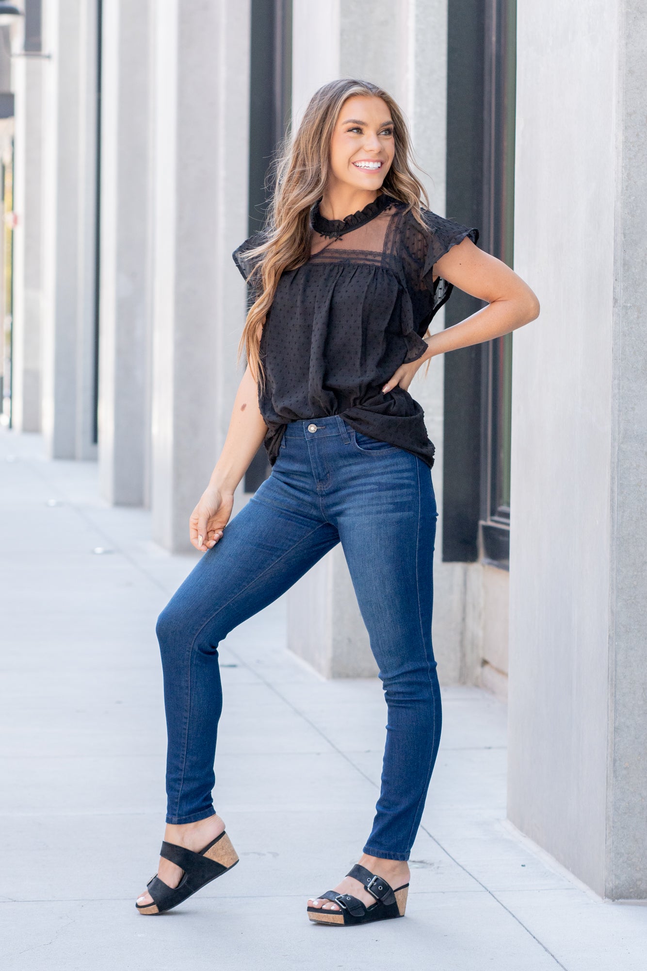 Alyssa wears a size 25 in jeans, a small in tops, and 8 in shoes. She is wearing size 3 in these jeans.