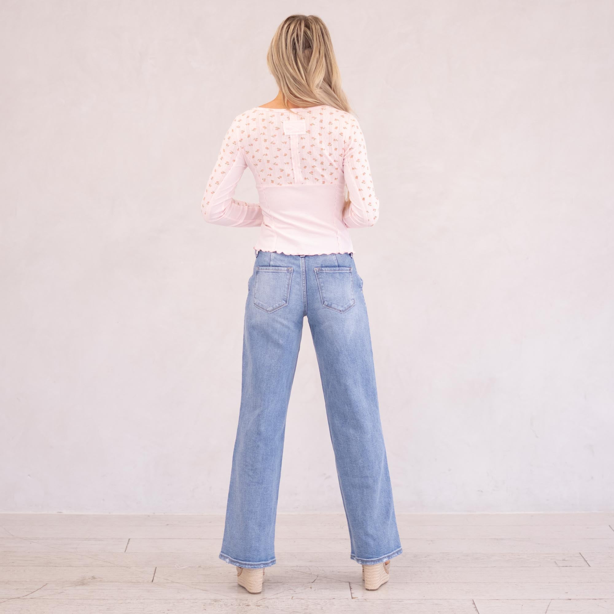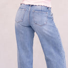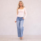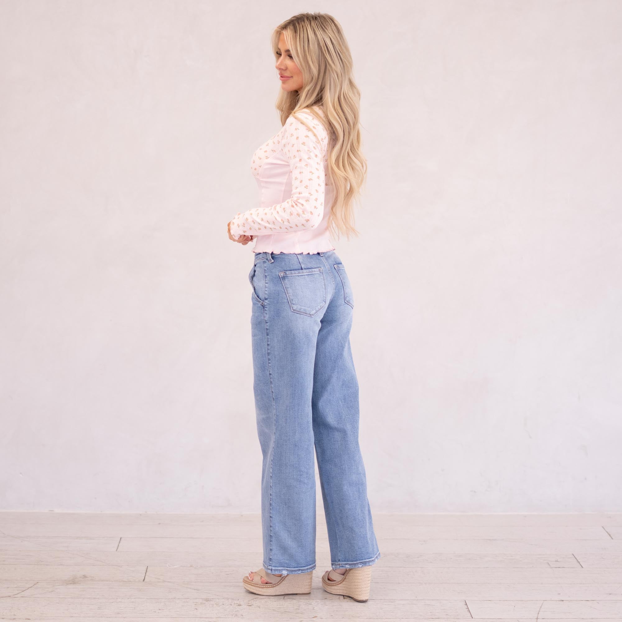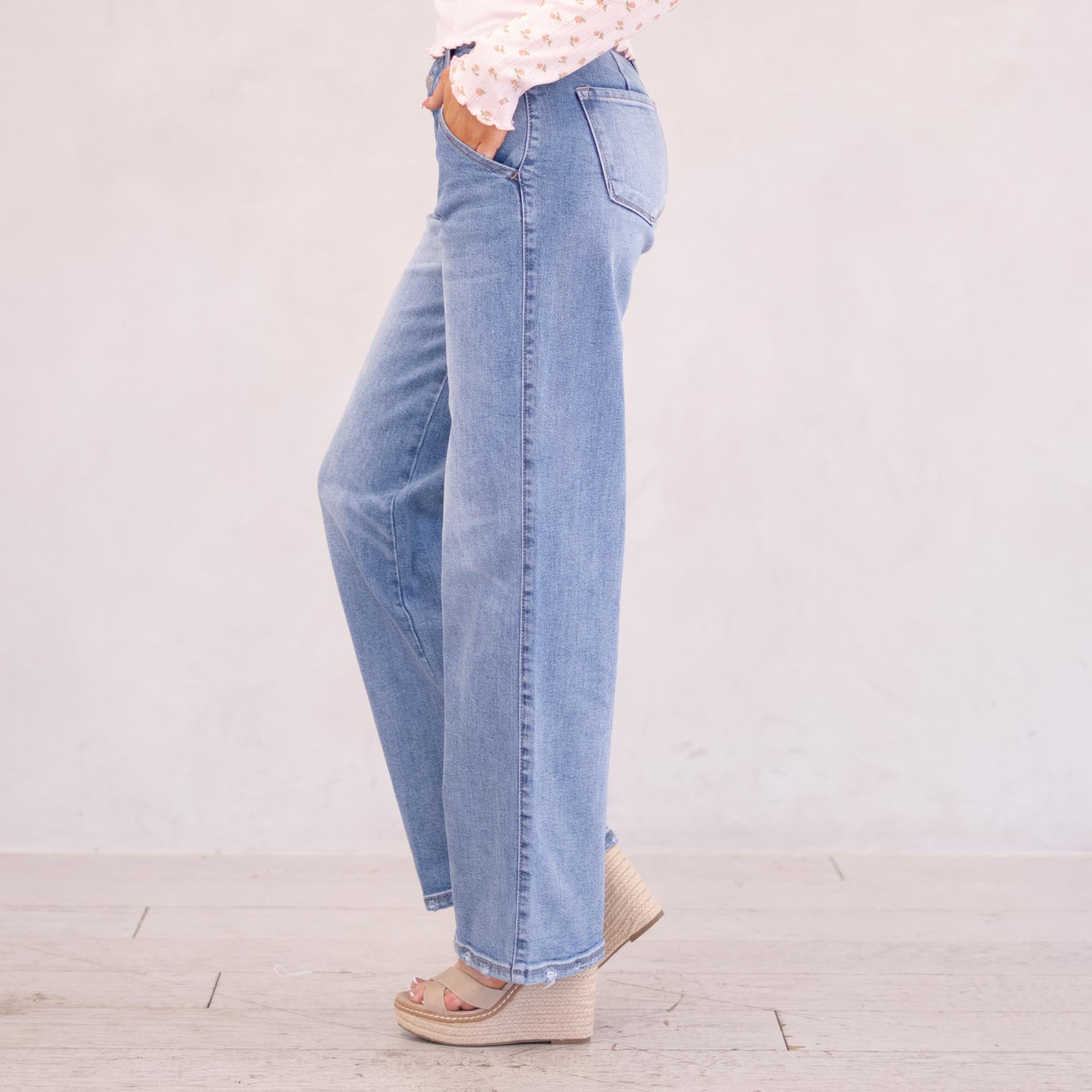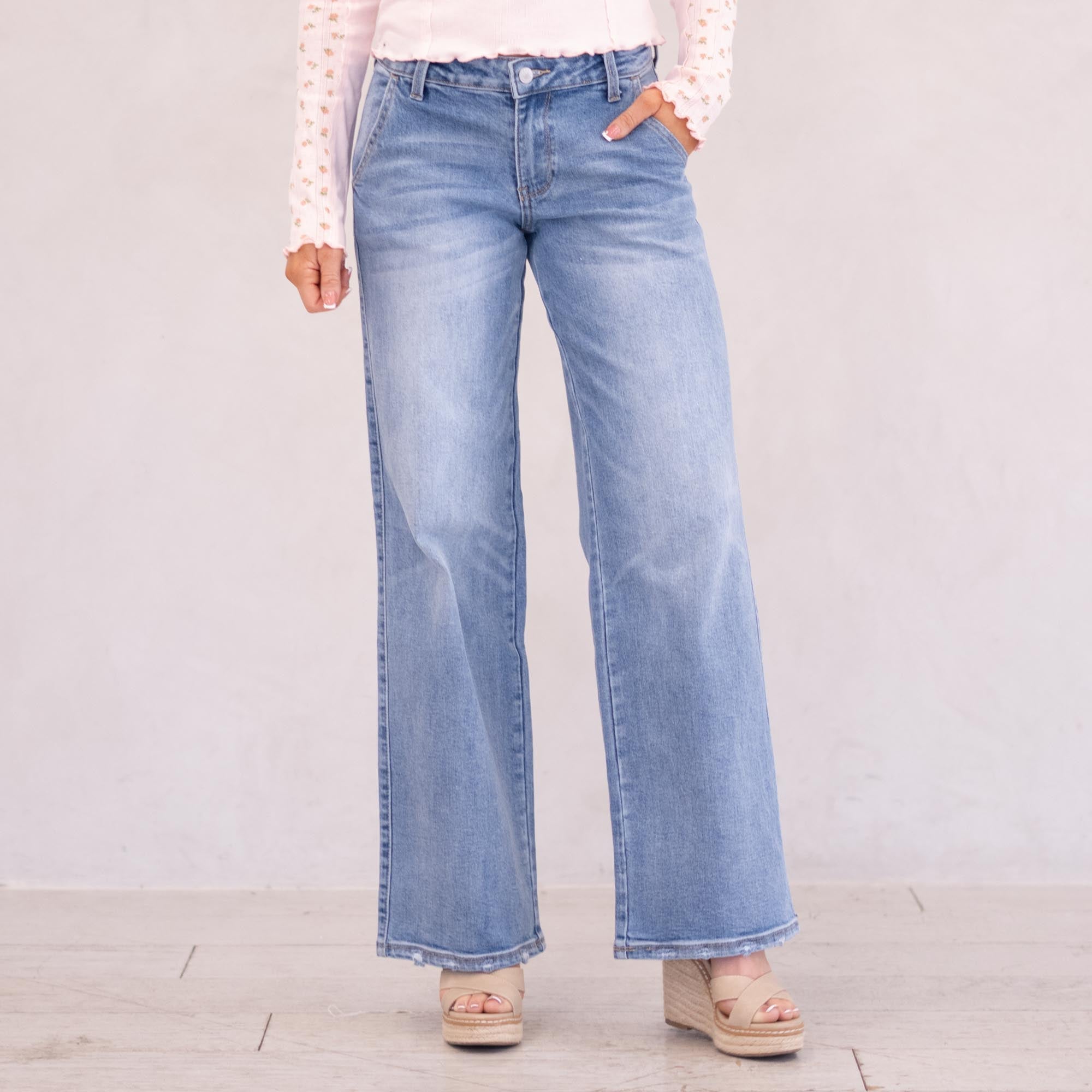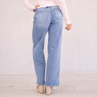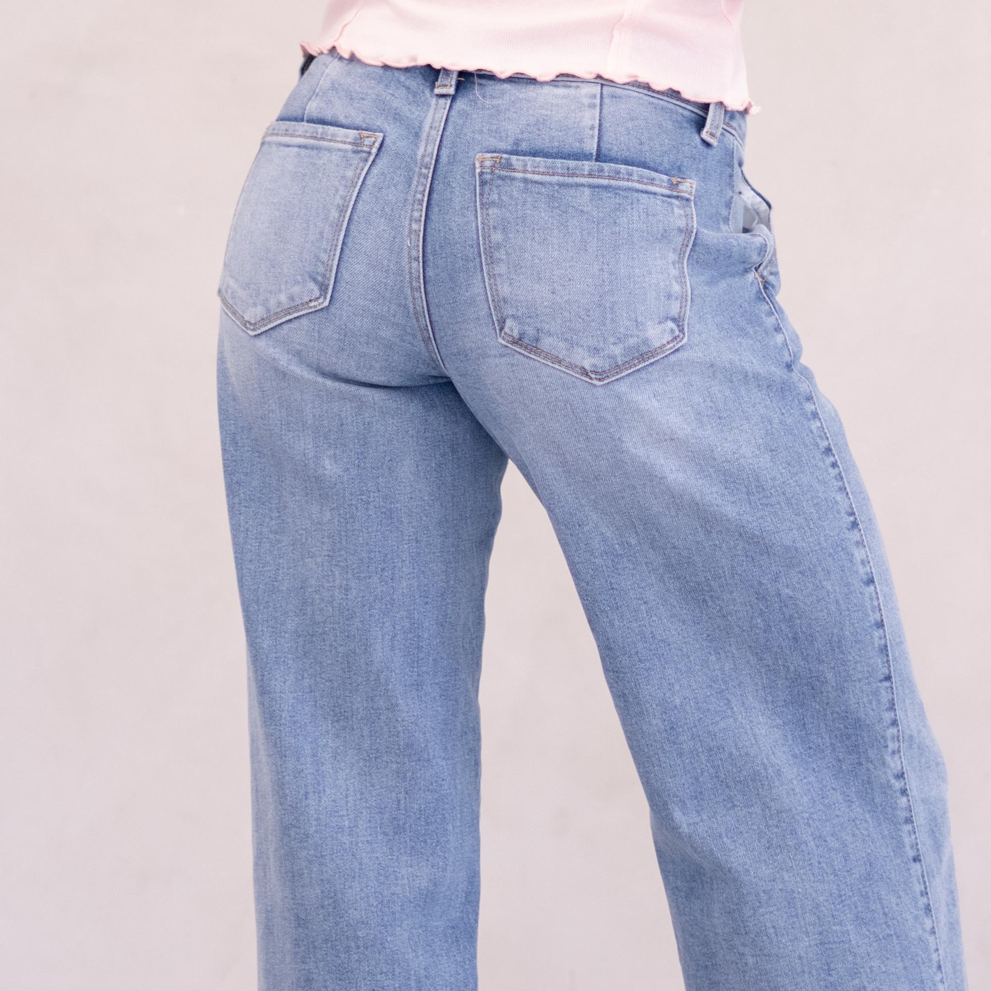The Alma Essentials Mid Rise Wide Leg Trouser comes in a soft light wash for a fresh, modern finish. Designed to sit slightly below the waist, this flattering silhouette flows into a wide trouser leg for an effortlessly elongated look. Crafted from a thicker, structured fabric that holds its shape wear after wear, it offers lasting comfort without sacrificing polish. Subtle whiskering, front slant pockets, back patch pockets, and refined dart detailing complete the look, finished with a classic single button closure and zip fly for a timeless, tailored feel.