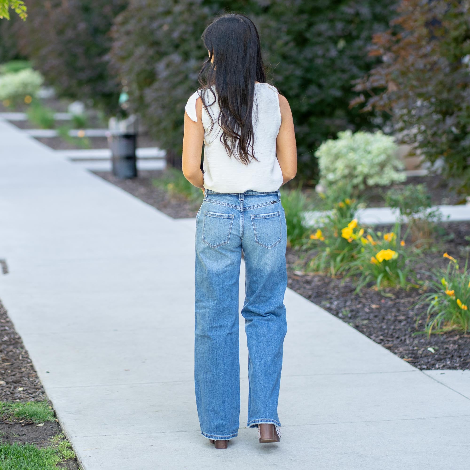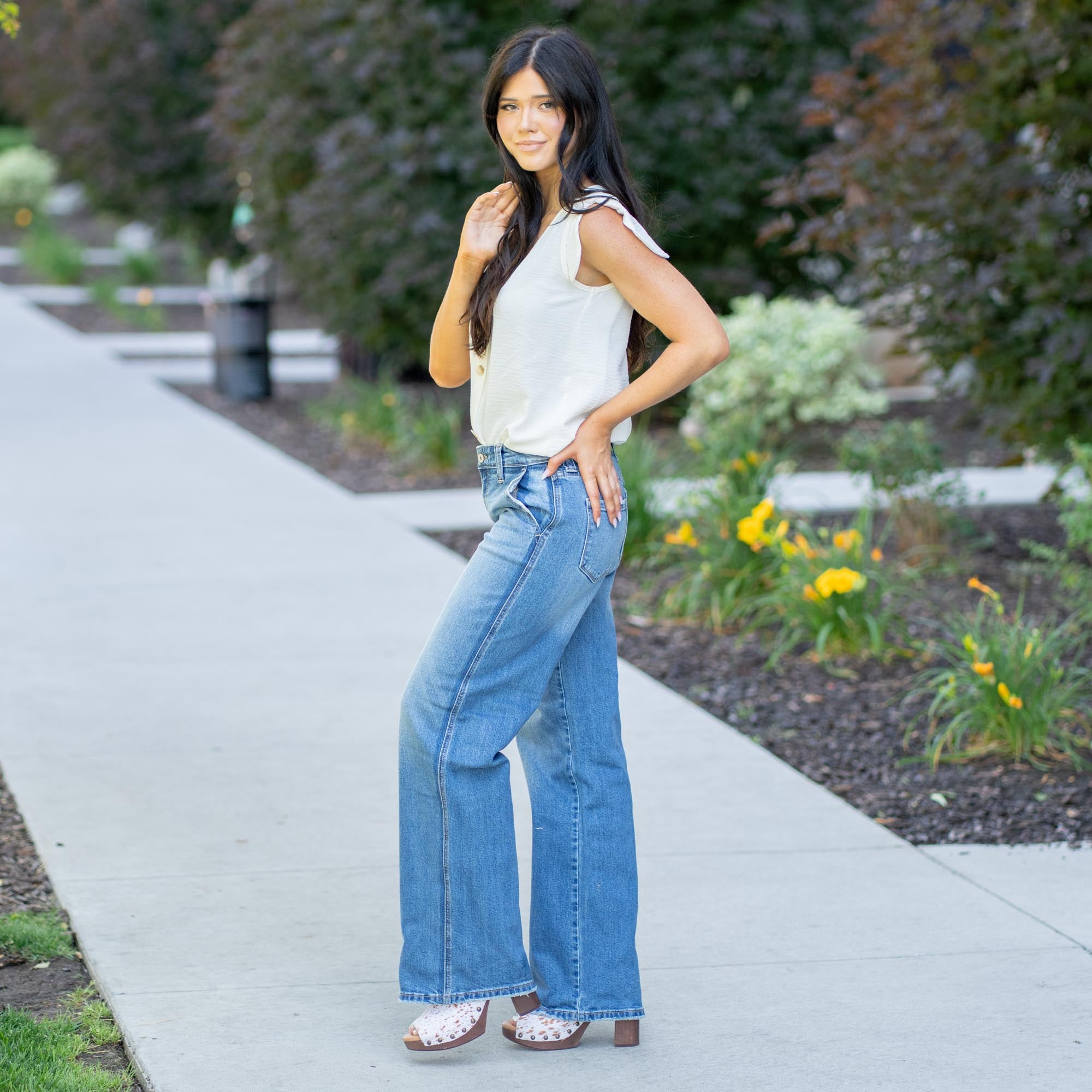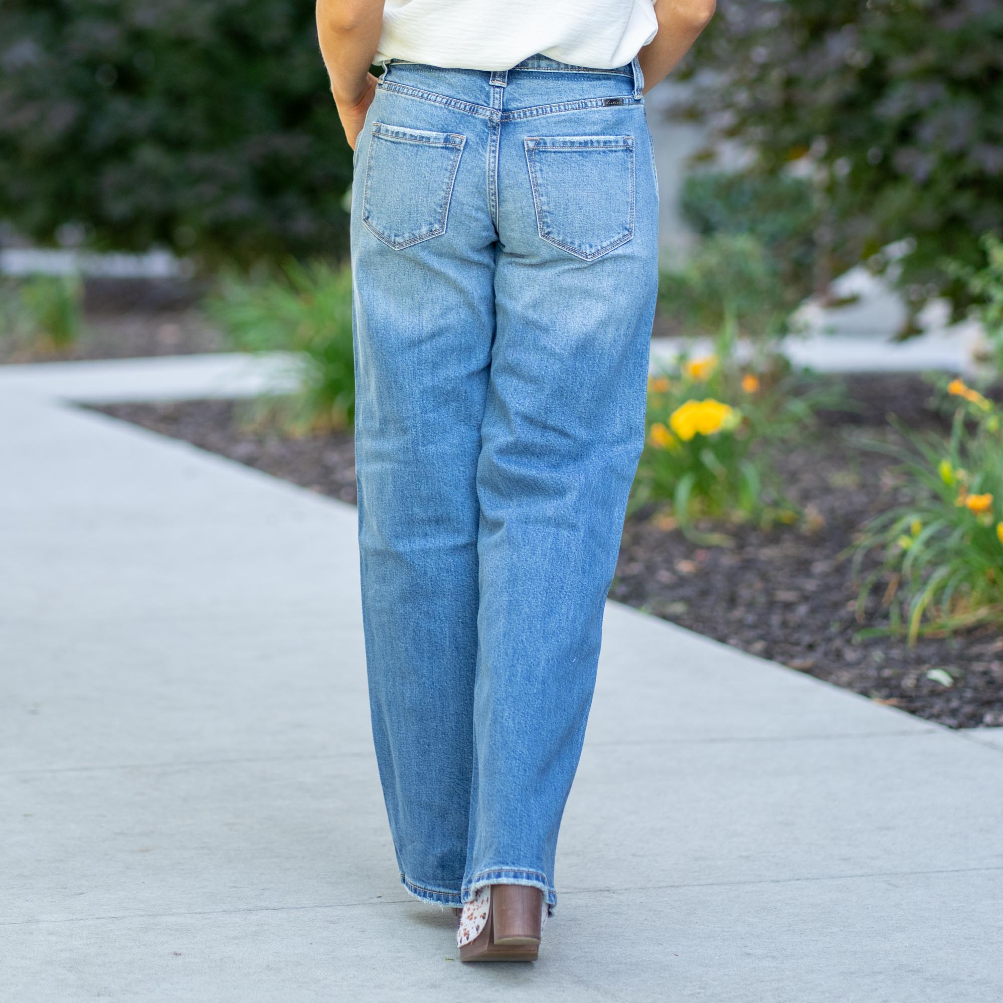 Make a statement with the Bram Mid Rise Wide Leg Jeans. In a standout medium wash with subtle two-tone detailing, this pair sits just below the waist for a flattering mid-rise fit. Tapered through the hips and flaring into a bold wide leg, it’s the perfect mix of modern and retro. Finished with slant front pockets, light whiskering, and a classic 4-pocket design, complete with a zip fly and single-button closure. A fresh take on everyday denim.