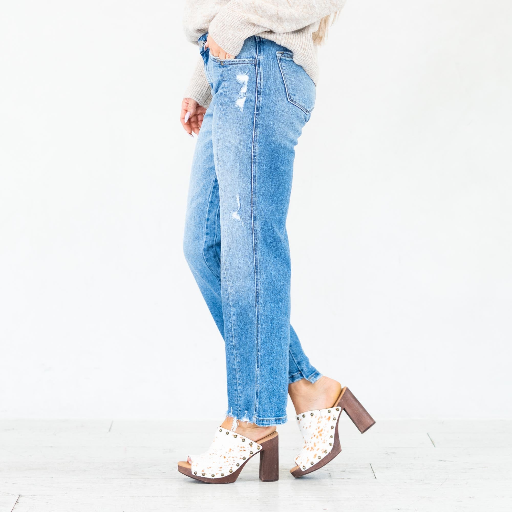 Crafted from comfort stretch denim, the Kells offers a flattering fit that moves with you while keeping its shape. The medium wash gives a classic, versatile appeal that pairs perfectly with everything from tees to blouses. Finished with an uneven frayed hem for a little extra personality, these jeans strike the perfect balance between polished and playful.