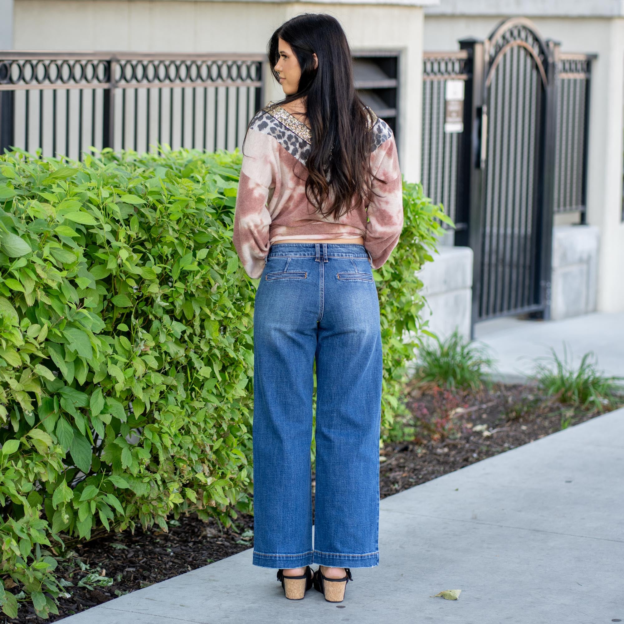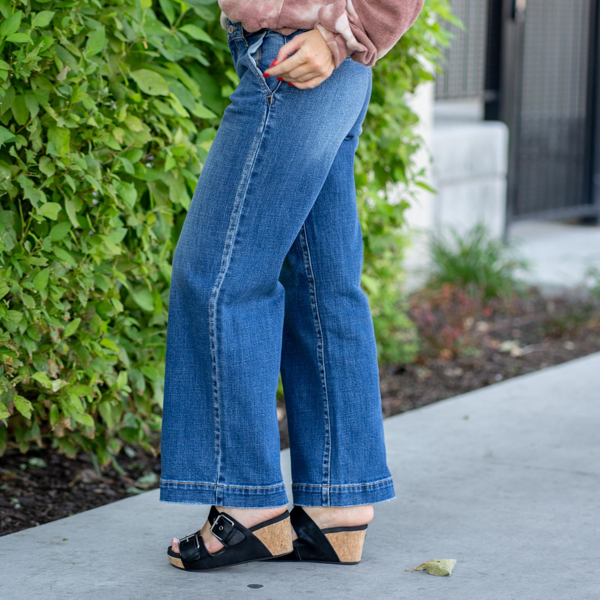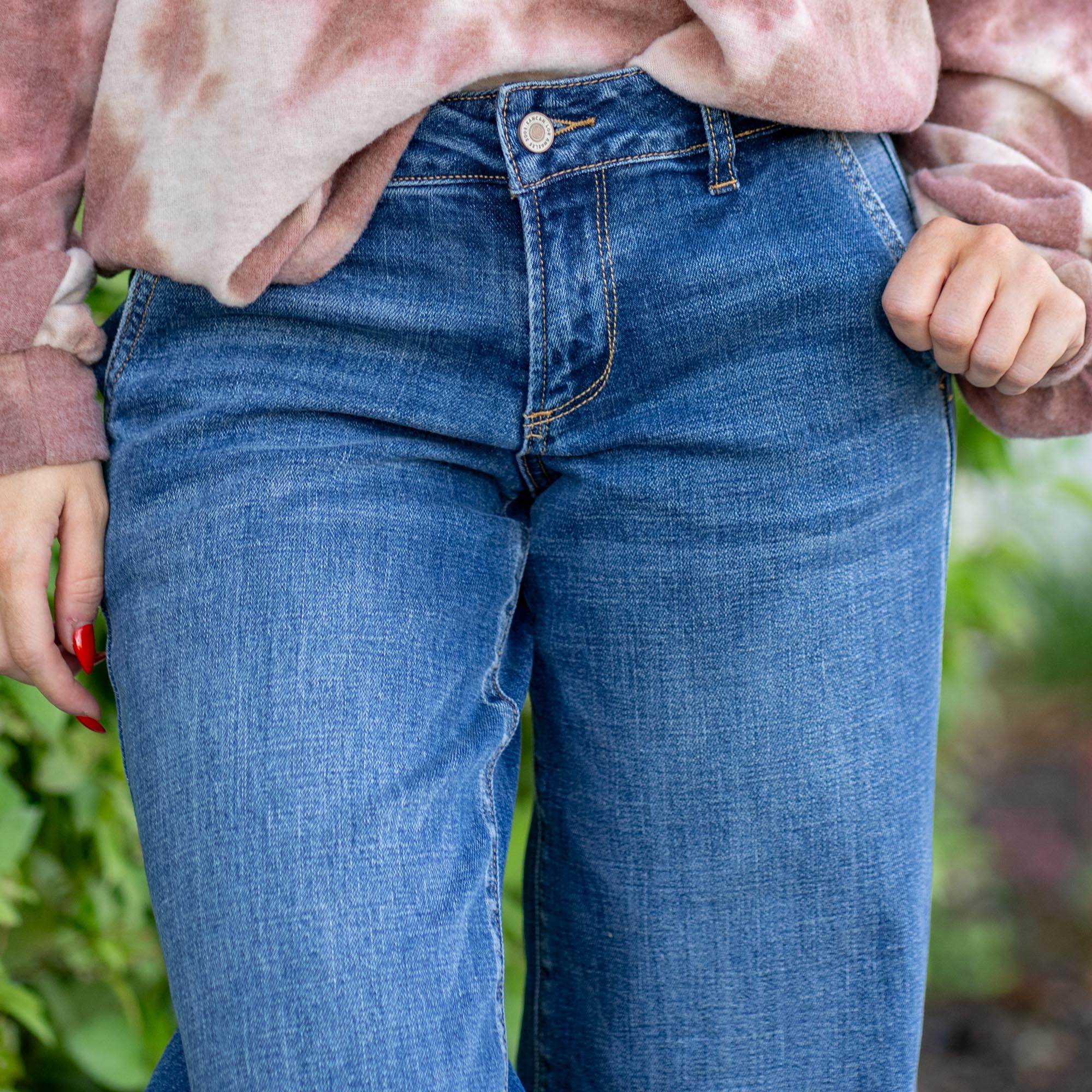 KanCan Petite Tara Mid Rise Trouser Wide Leg Jean Medium Blue