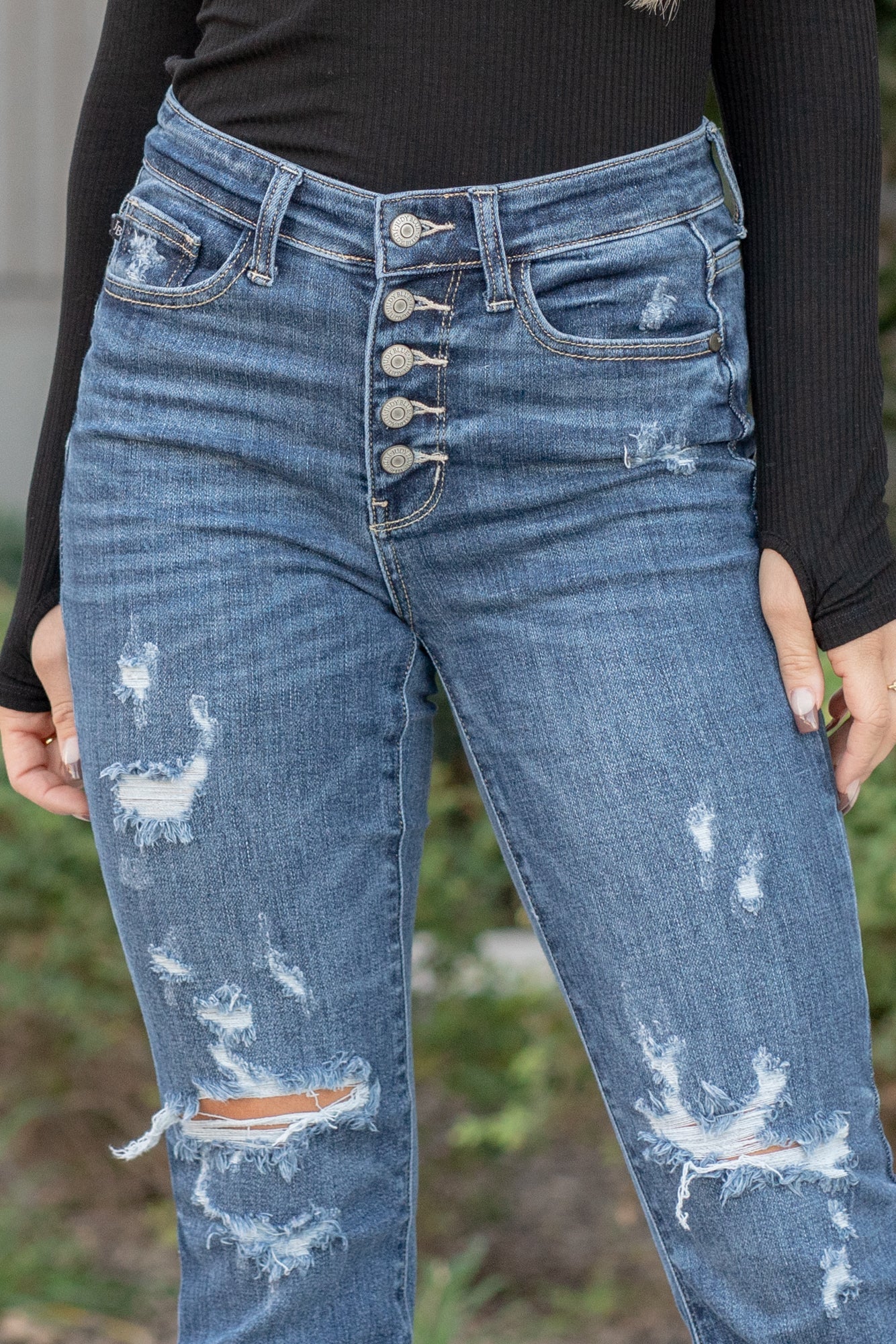 Judy Blue Jasper Mid Rise Distressed Button Fly Flare Regular & Plus Sizes