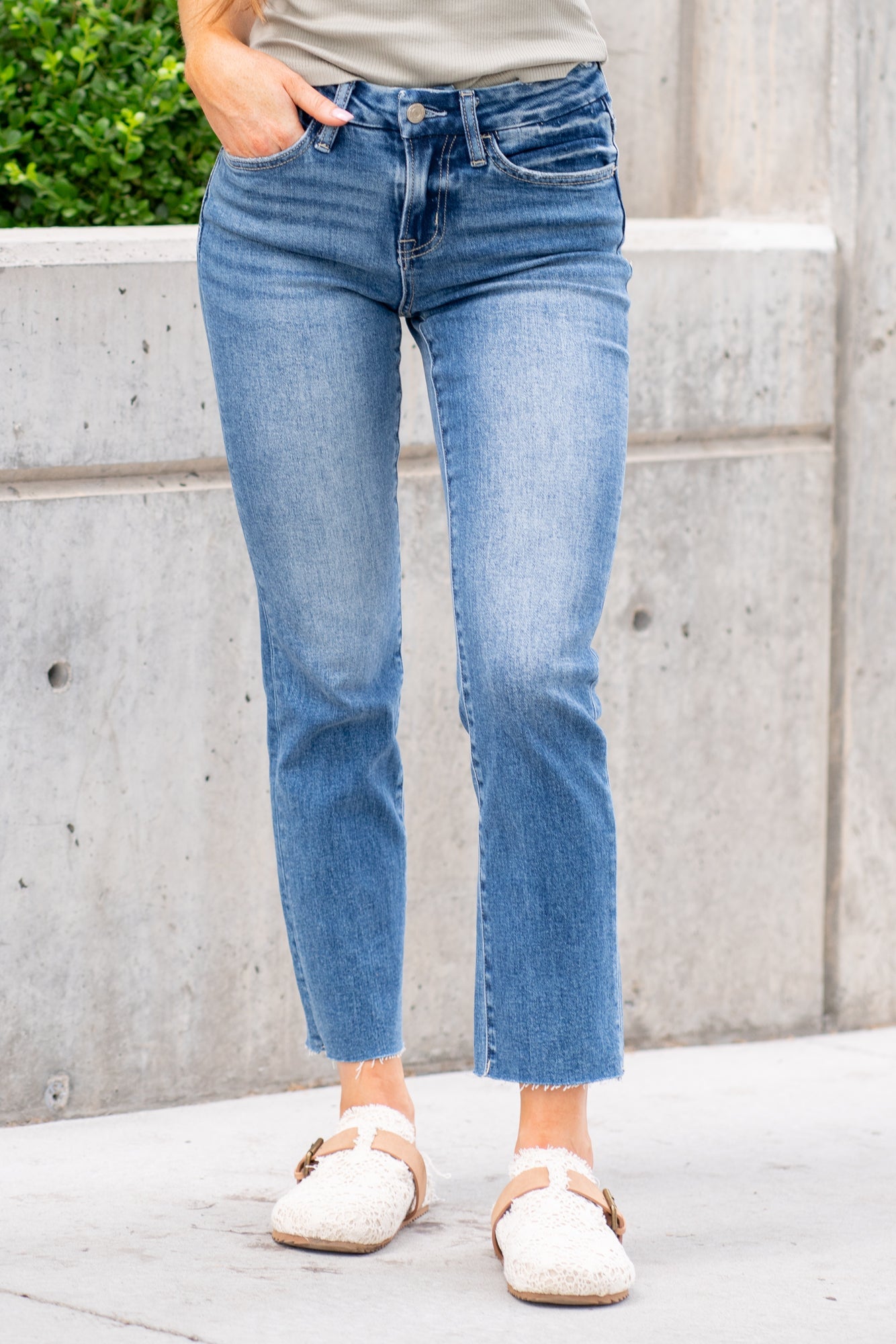 These jeans are the perfect combination of style and comfort. With a high-rise fit and straight leg, they provide a flattering silhouette, while the hem detail adds a touch of edge. Whether you're running errands or going out for the night, these jeans will have you looking and feeling your best.