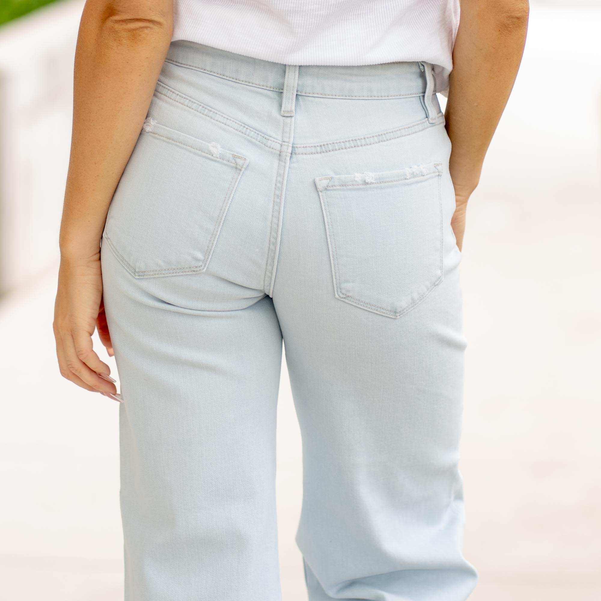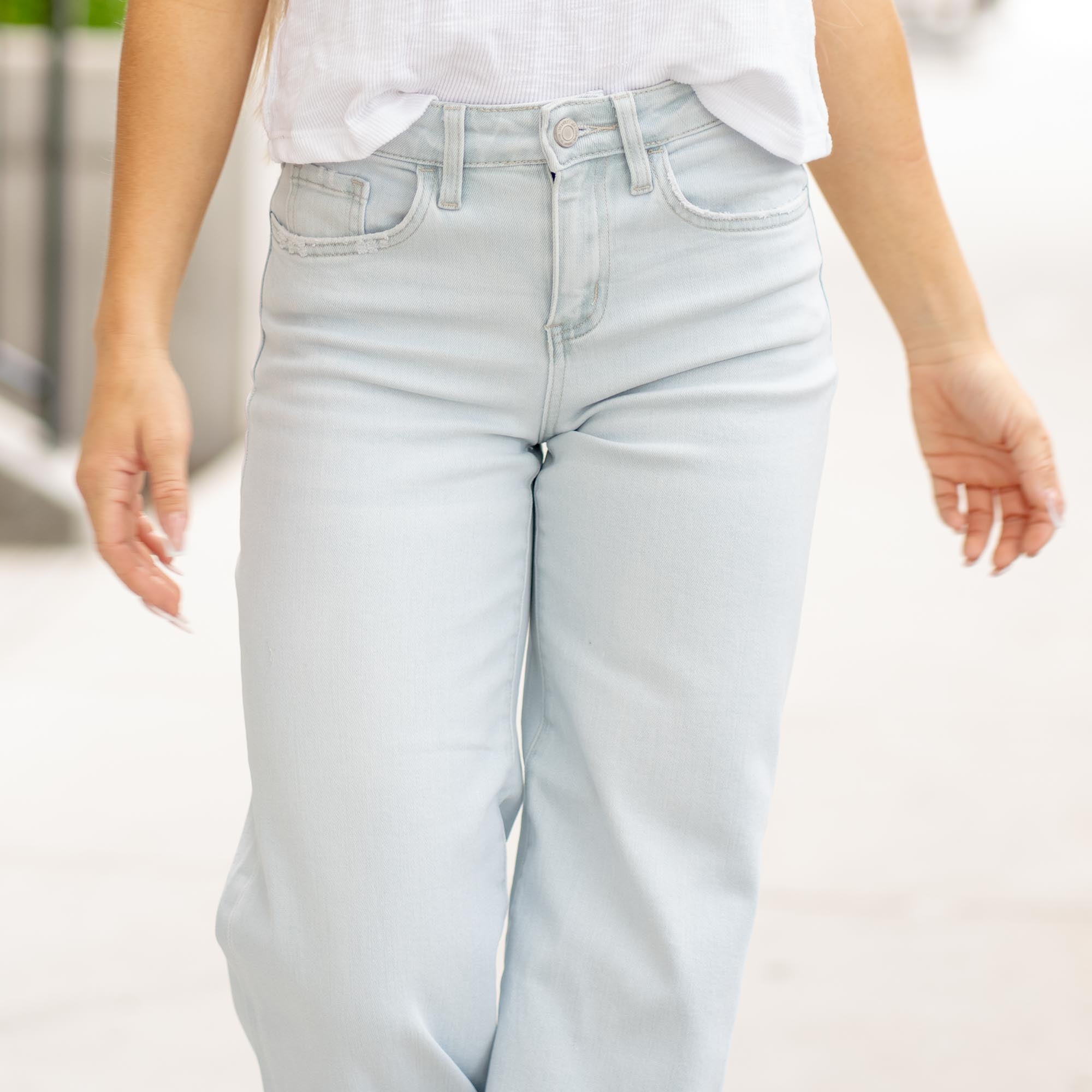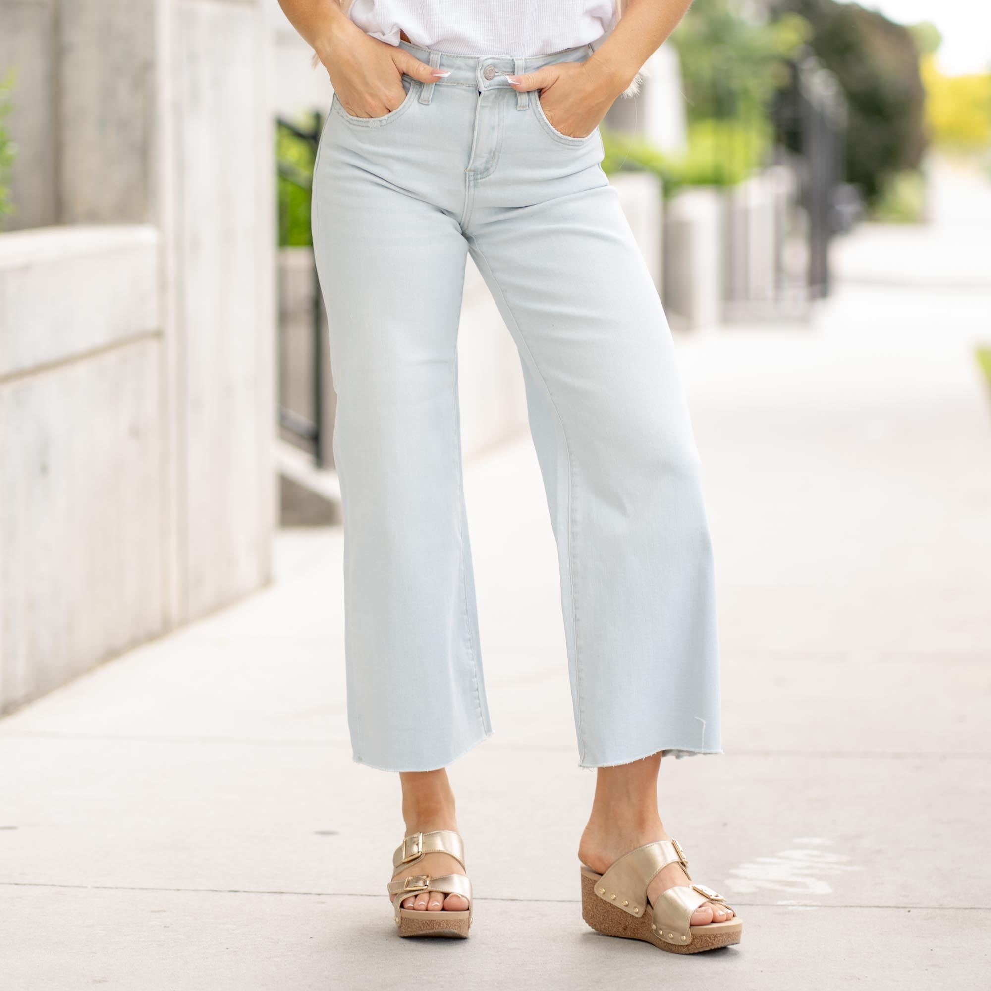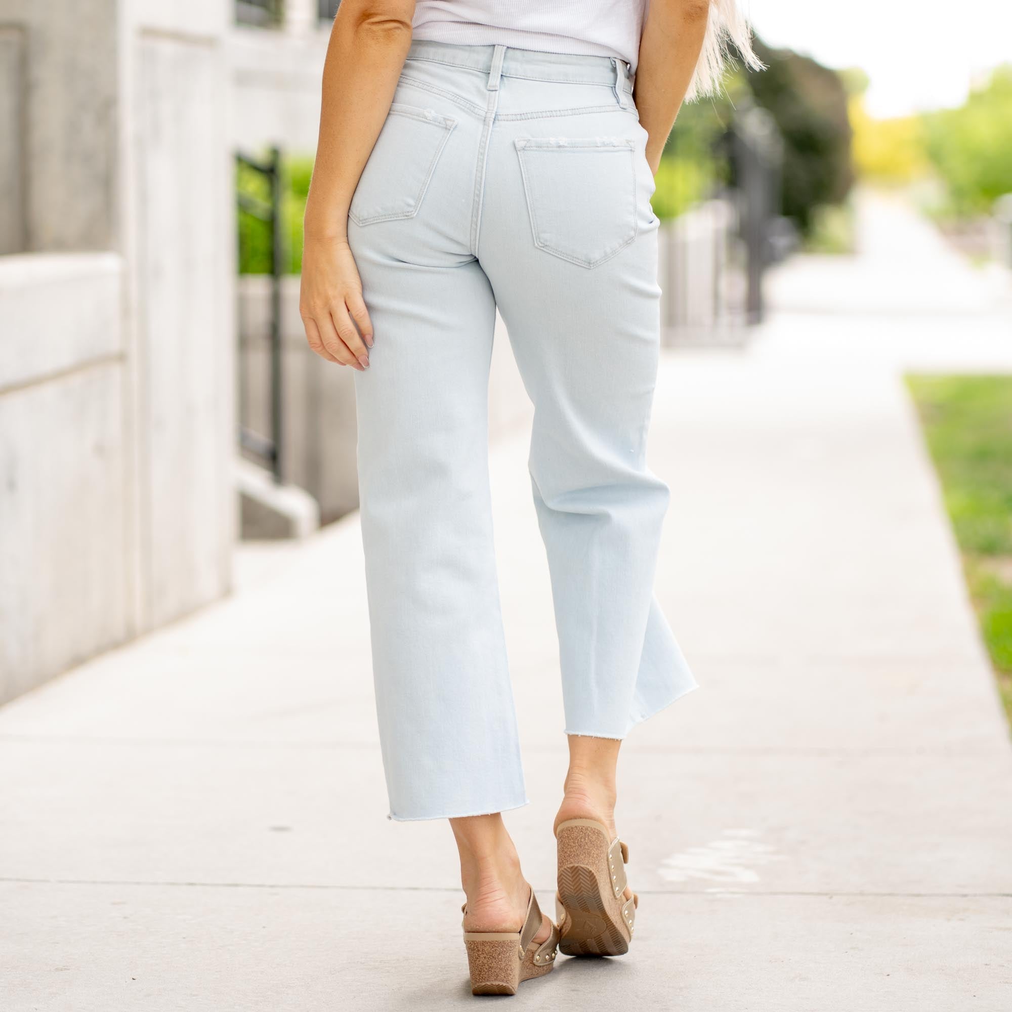The Cleared Crop Wide Leg Jeans deliver the perfect mix of structure and softness. Featuring a flattering high rise waist, cropped wide leg silhouette, and subtle distressing with a raw hem, this pair gives you laid-back style with a modern twist. Made from comfort stretch denim that moves with you, they’re ready to dress up with heels or keep casual with sneakers.