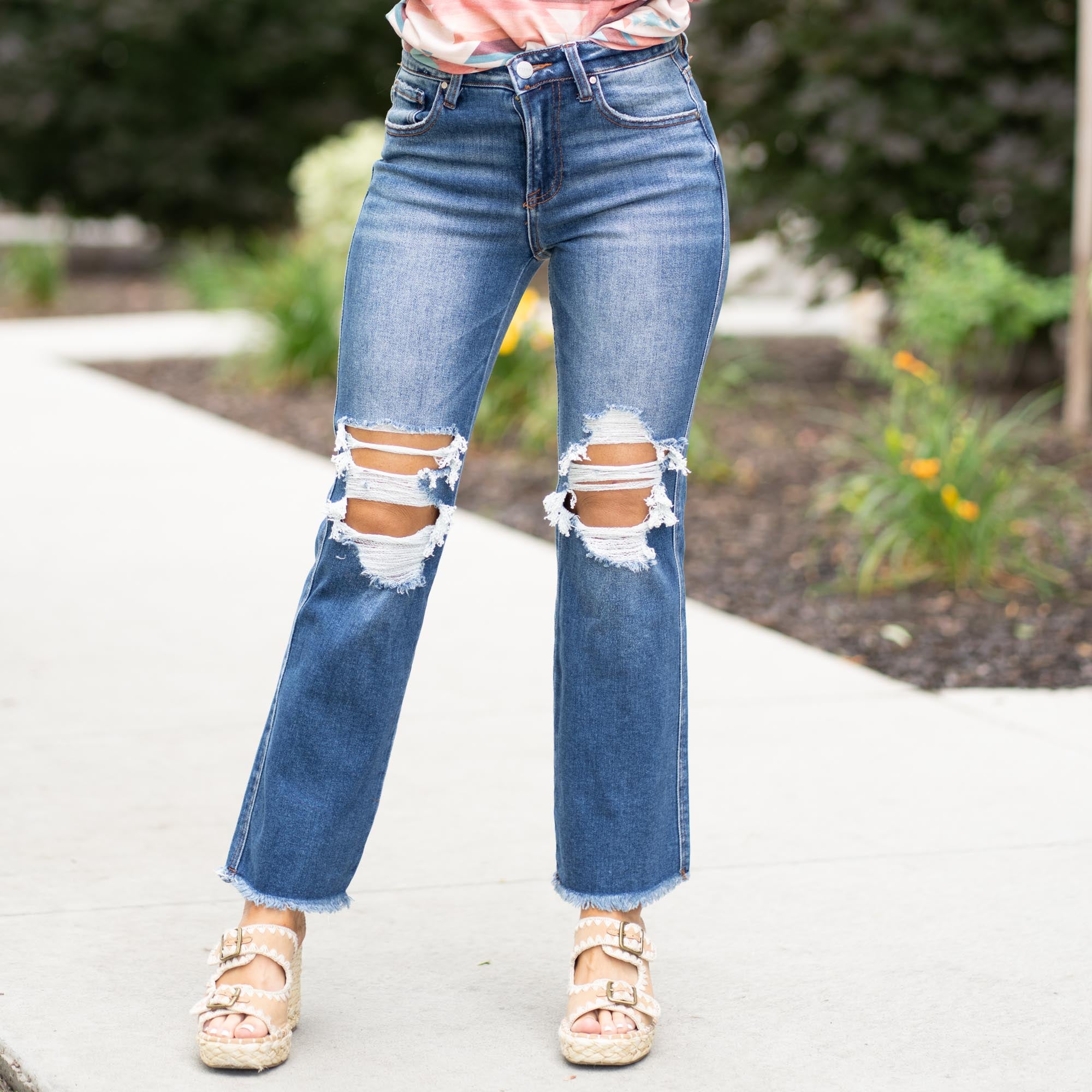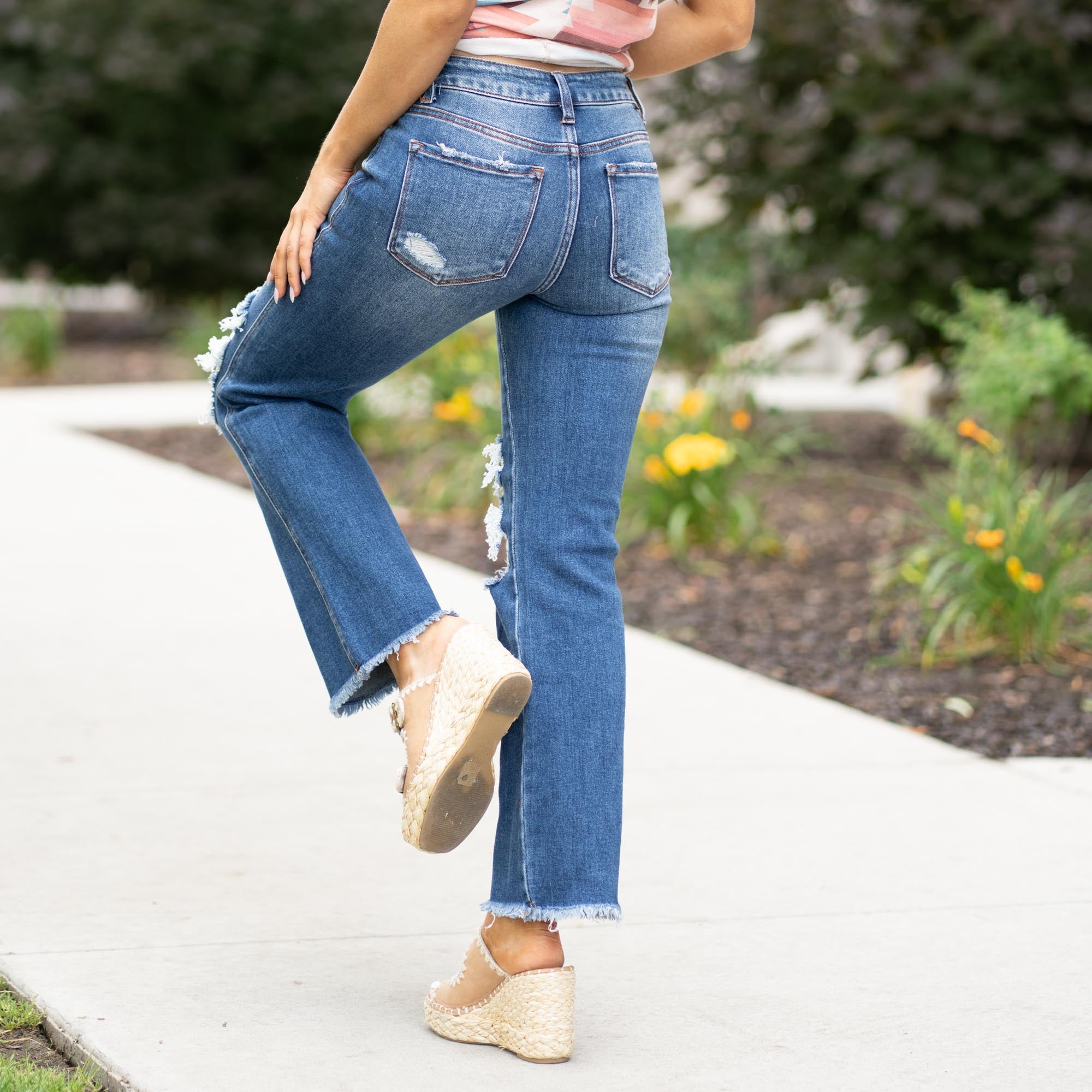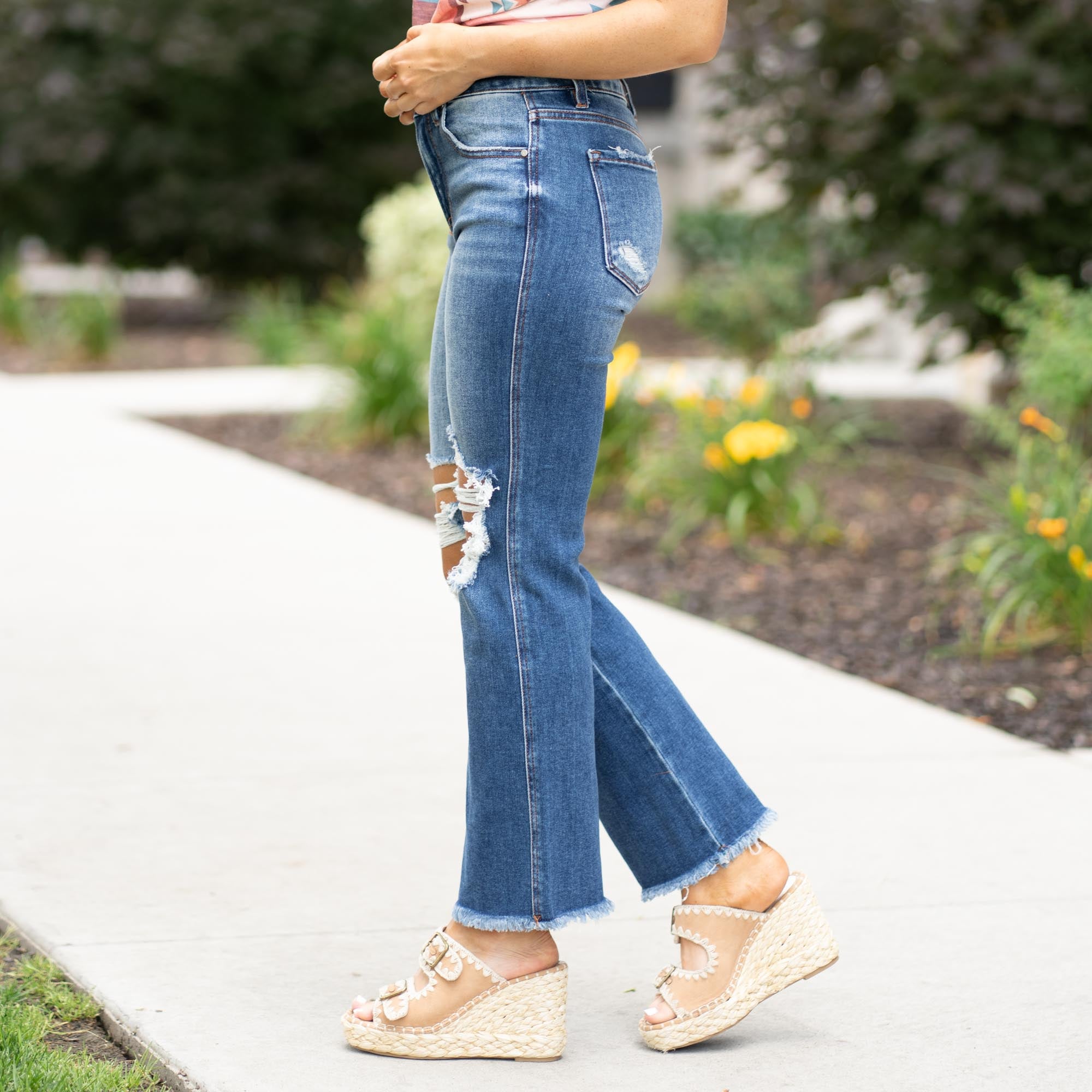 These Mid Rise Distressed Cropped Flare Jeans are a trendy and edgy addition to your denim collection. The mid-rise fit offers a flattering and comfortable silhouette, while the distressed detailing adds a touch of rugged charm. The cropped flare design adds a modern and stylish twist to these jeans, perfect for showcasing your favorite shoes. Made from a stretchy and durable denim material, these jeans are ideal for both style and comfort. Pair them with a tucked-in top and ankle boots for a chic and casual look, or dress them up with a blouse and heels for a night out. Elevate your wardrobe with these fashionable and versatile cropped flare jeans today!