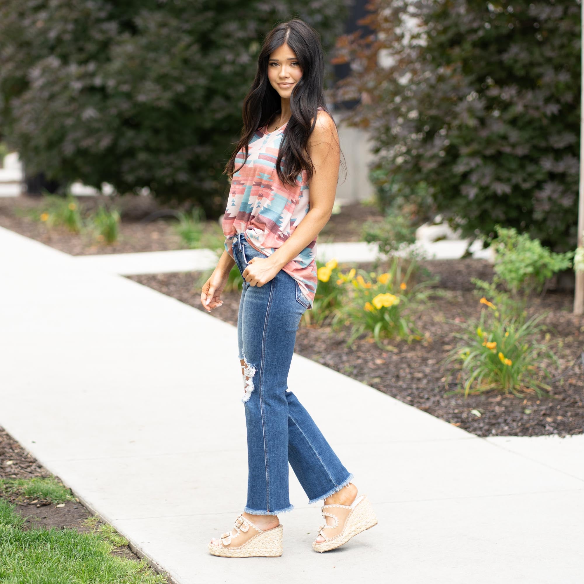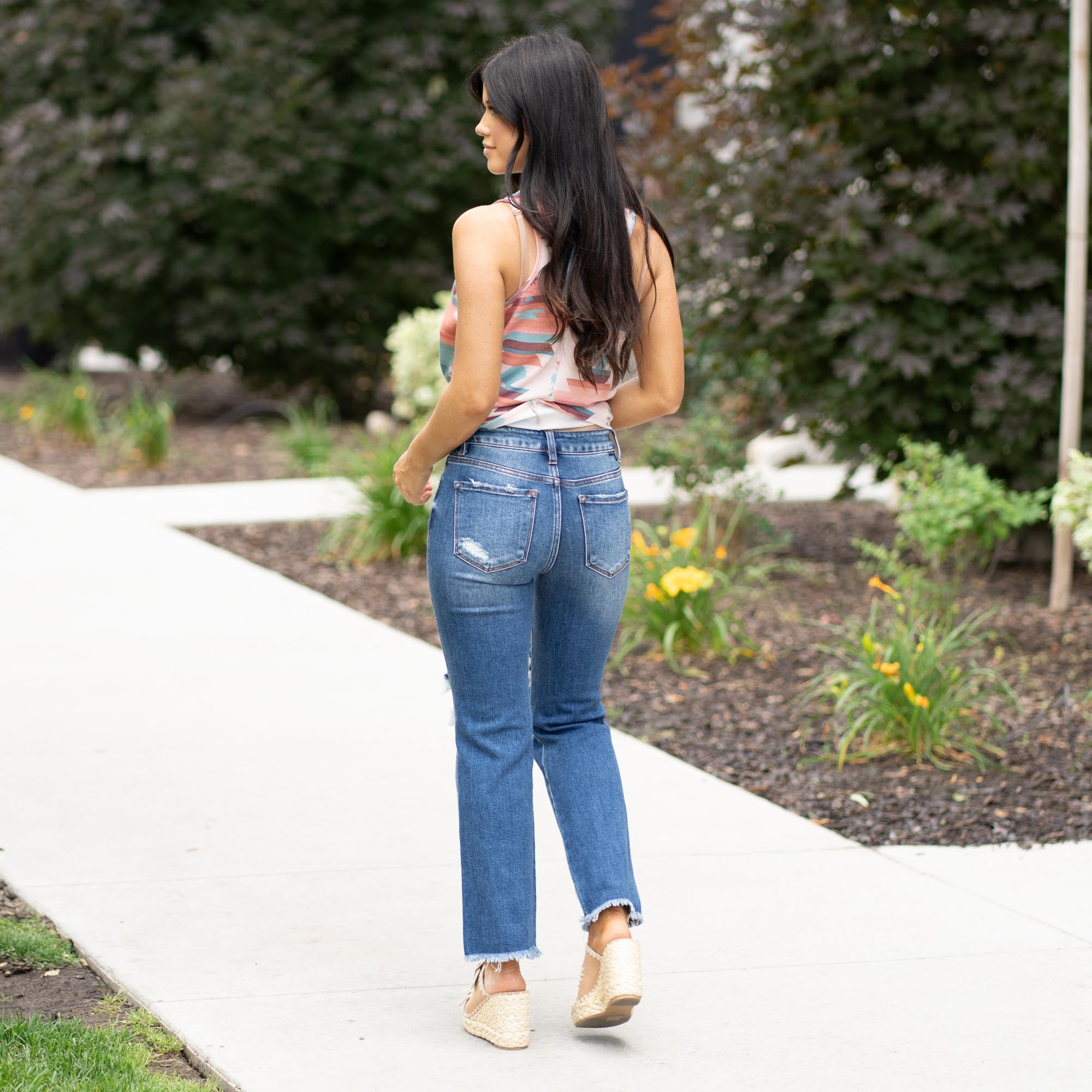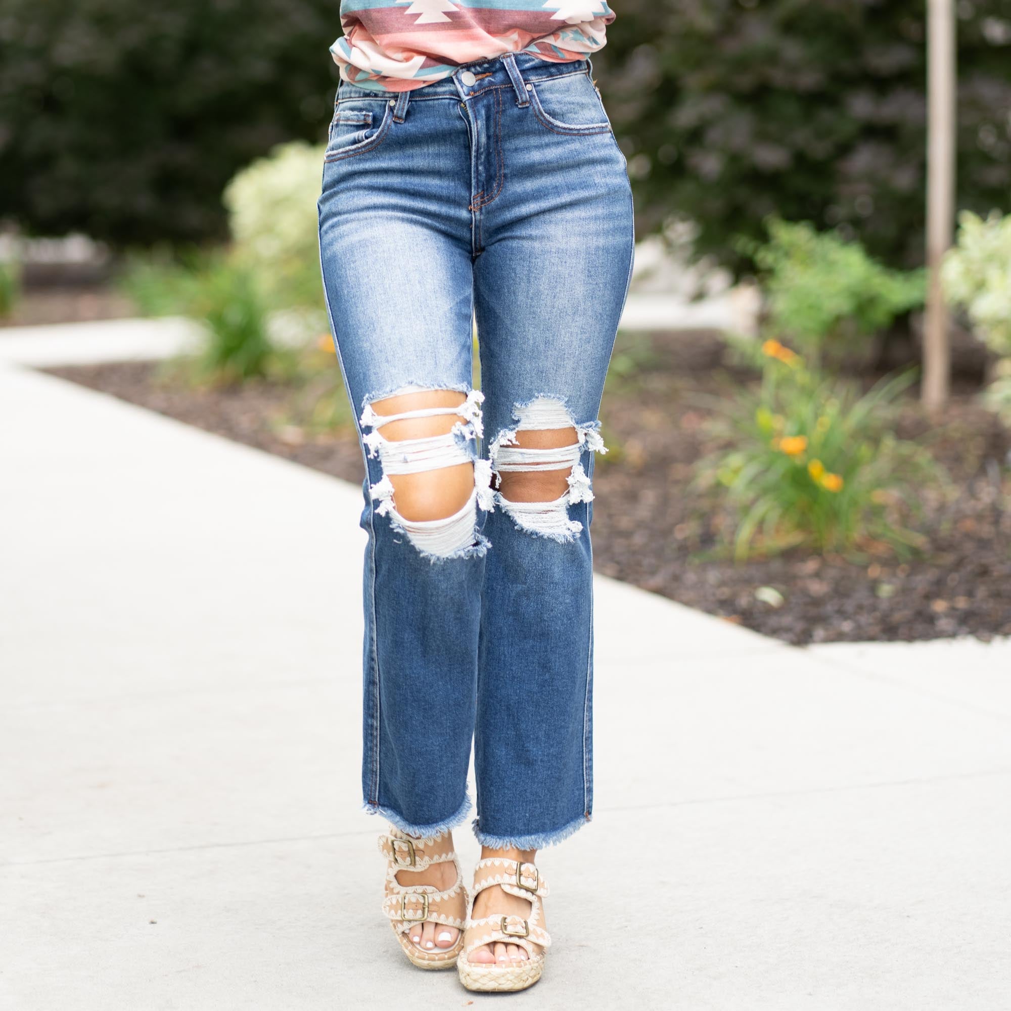 These Mid Rise Distressed Cropped Flare Jeans are a trendy and edgy addition to your denim collection. The mid-rise fit offers a flattering and comfortable silhouette, while the distressed detailing adds a touch of rugged charm. The cropped flare design adds a modern and stylish twist to these jeans, perfect for showcasing your favorite shoes. Made from a stretchy and durable denim material, these jeans are ideal for both style and comfort. Pair them with a tucked-in top and ankle boots for a chic and casual look, or dress them up with a blouse and heels for a night out. Elevate your wardrobe with these fashionable and versatile cropped flare jeans today!