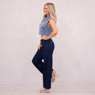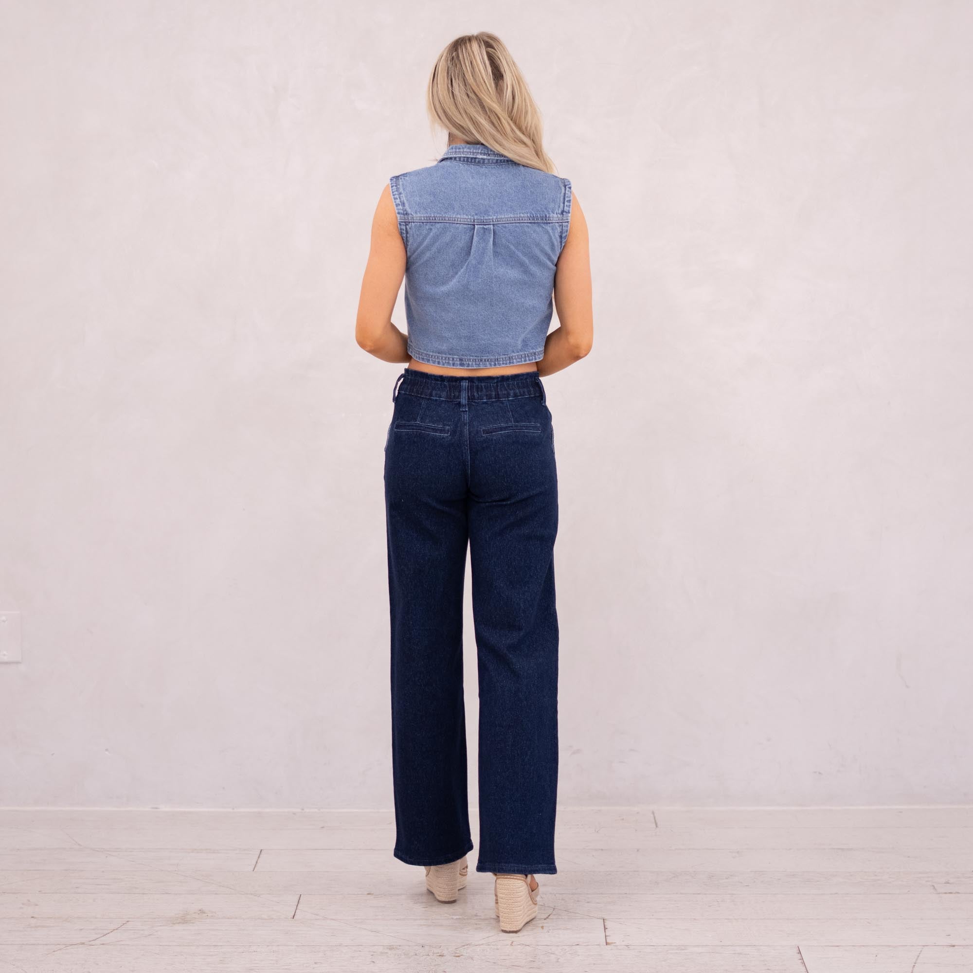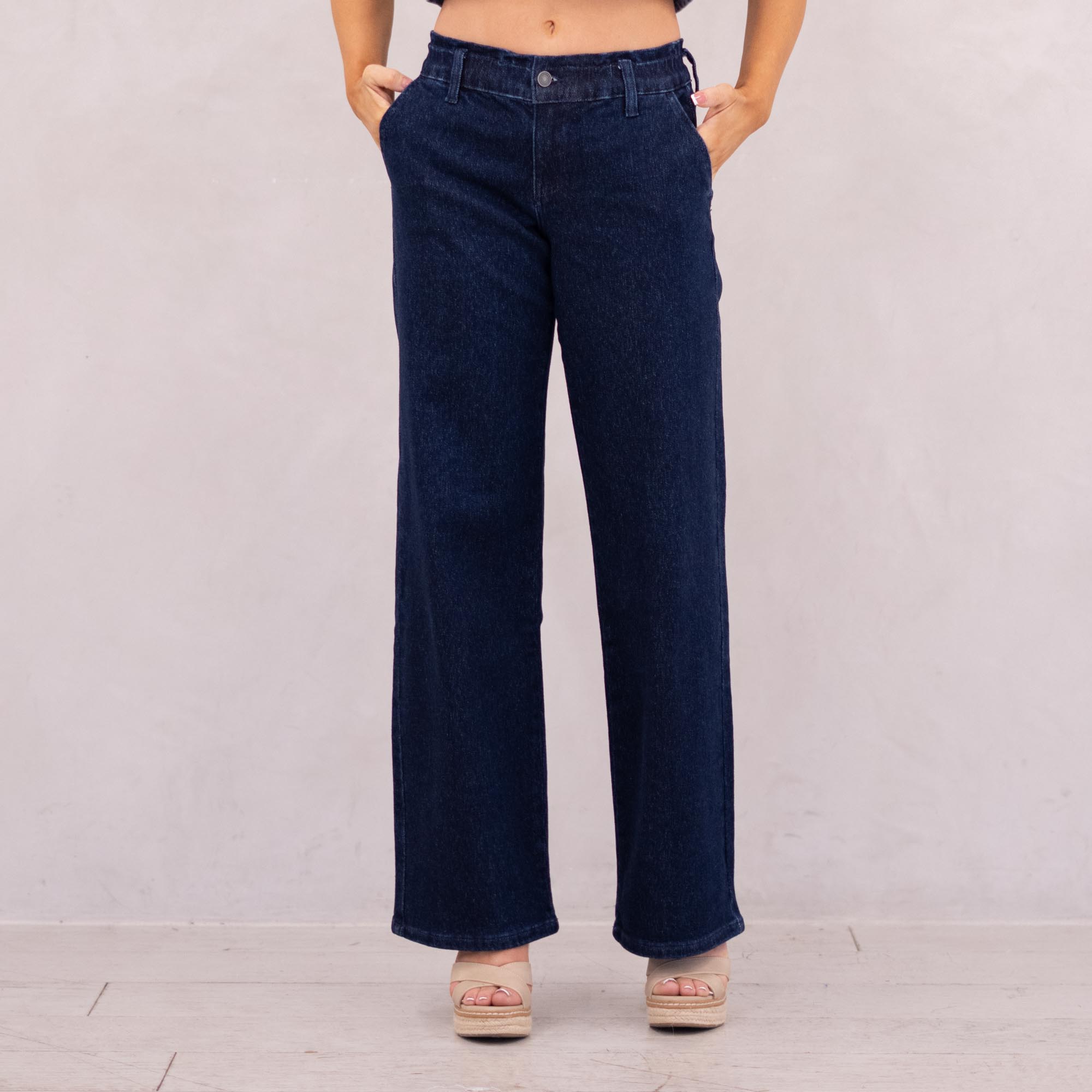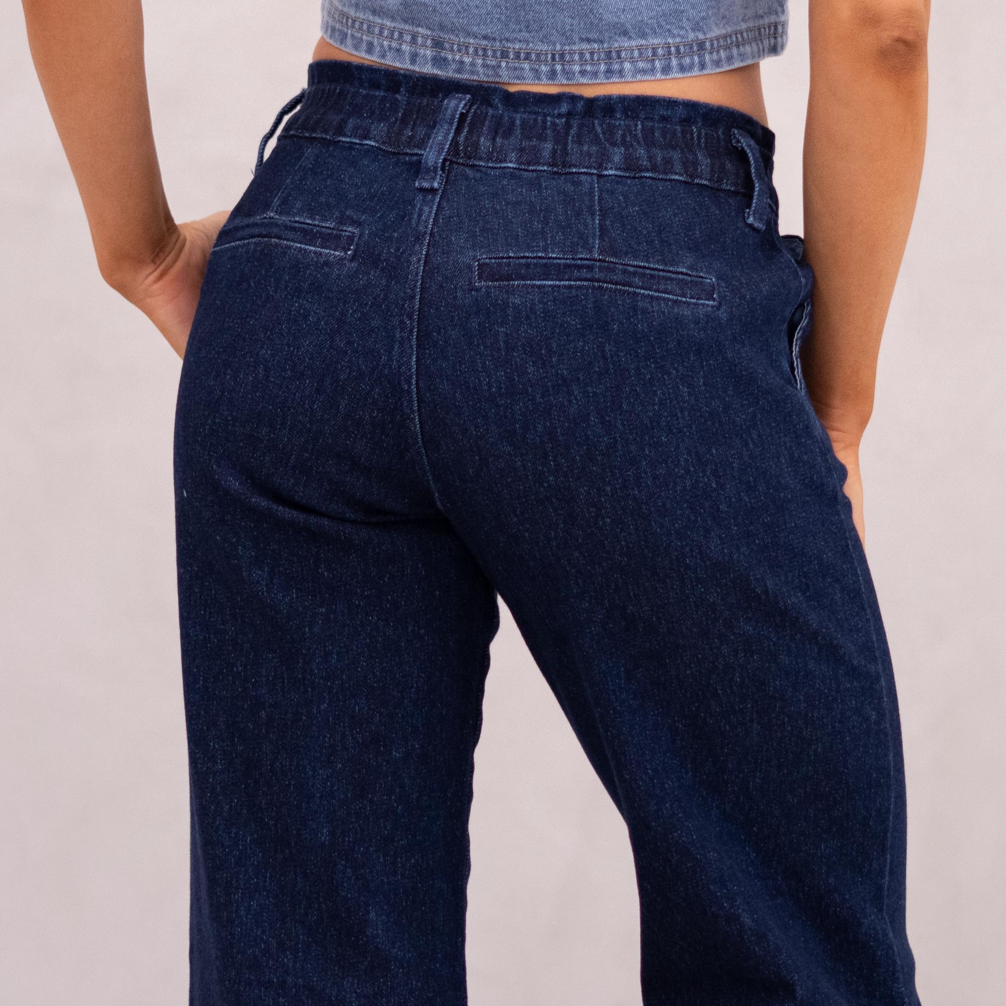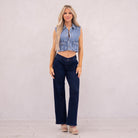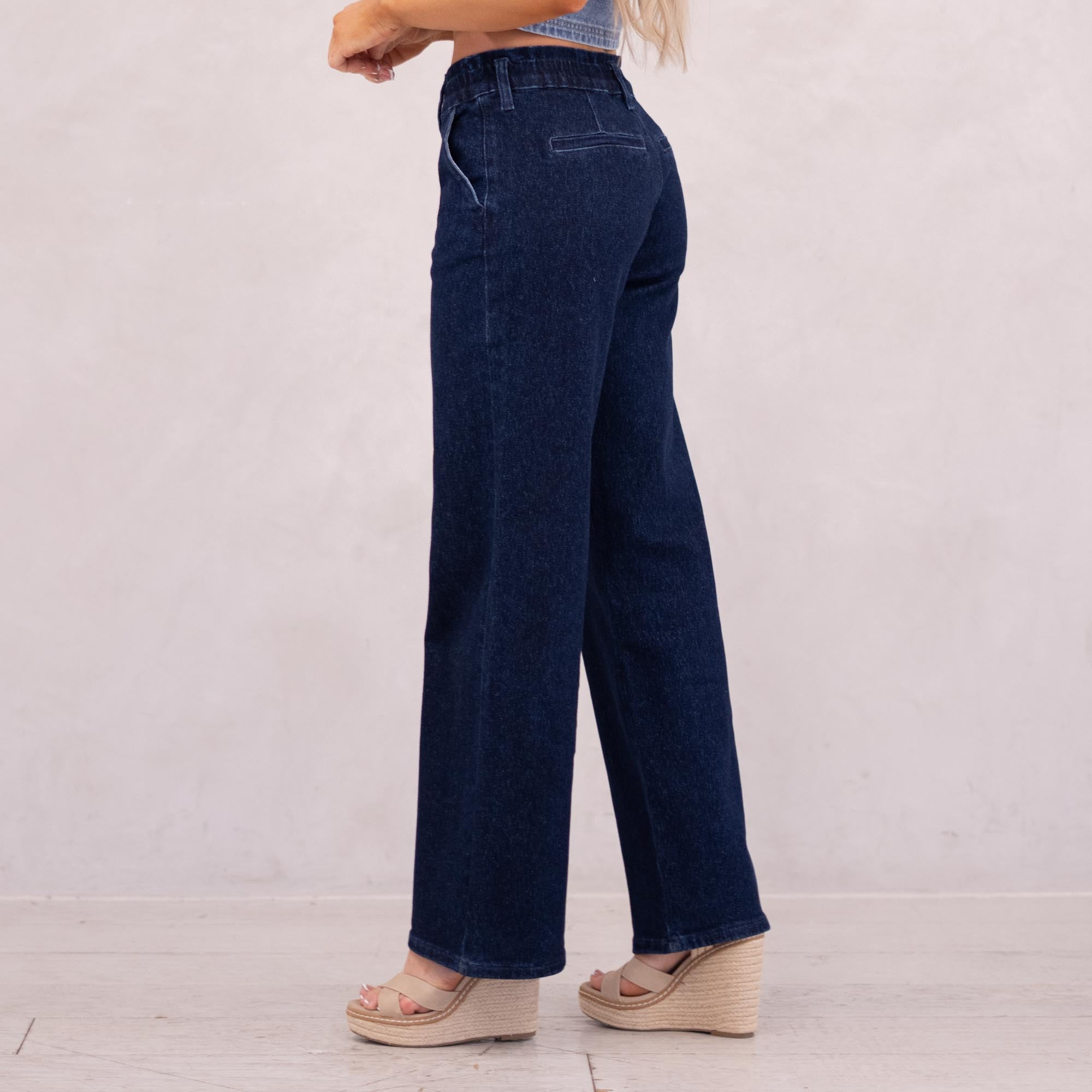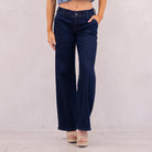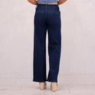 Our Kayla High Rise Trouser Wide delivers a crisp, clean look in a deep dark wash that instantly elevates any outfit. The high-rise fit smooths and flatters, while the elastic waistband offers effortless comfort. Finished with front slant pockets, back welt pockets, and refined dart details, this trouser-style jean is subtly enhanced with blue lurex fabric for a polished, elevated feel.