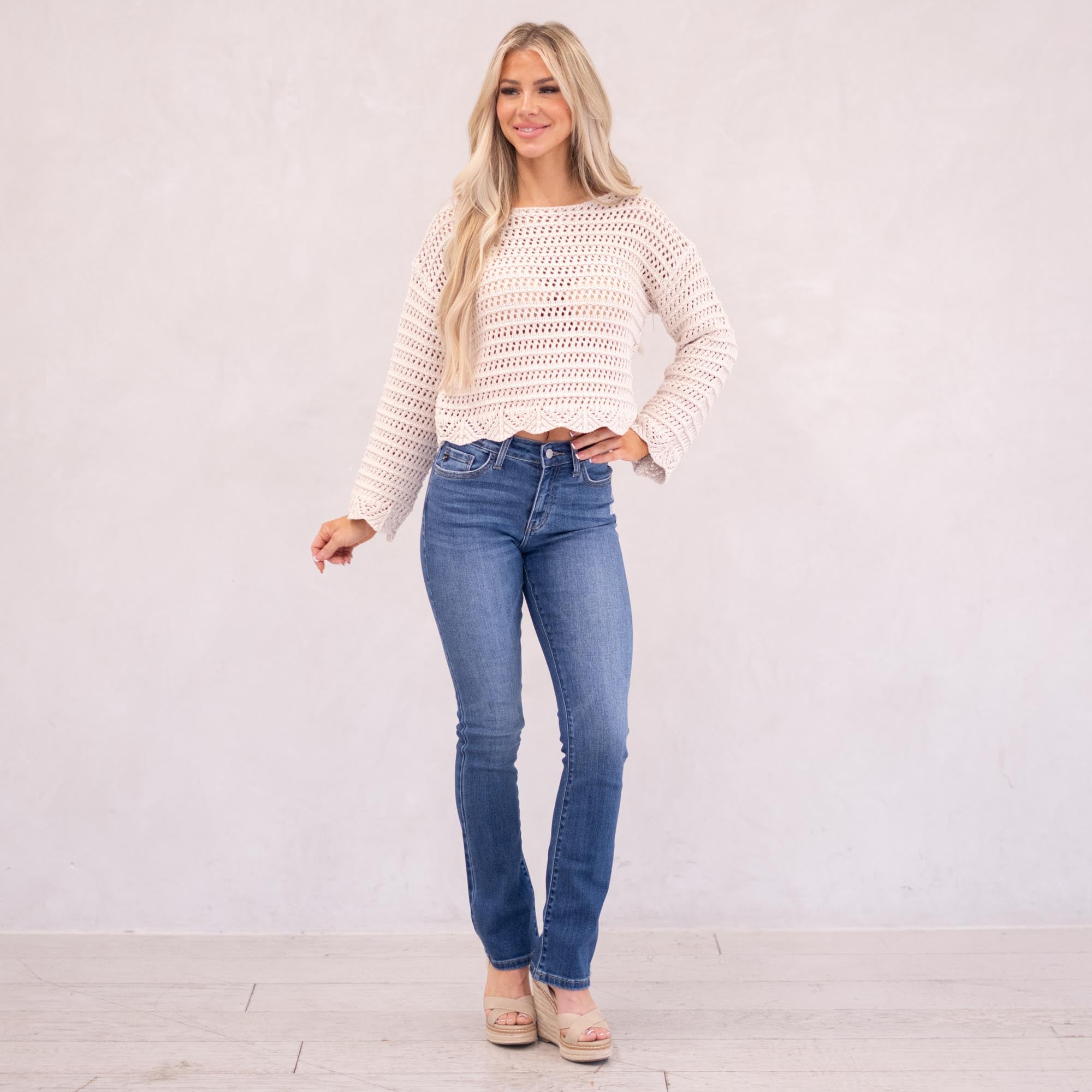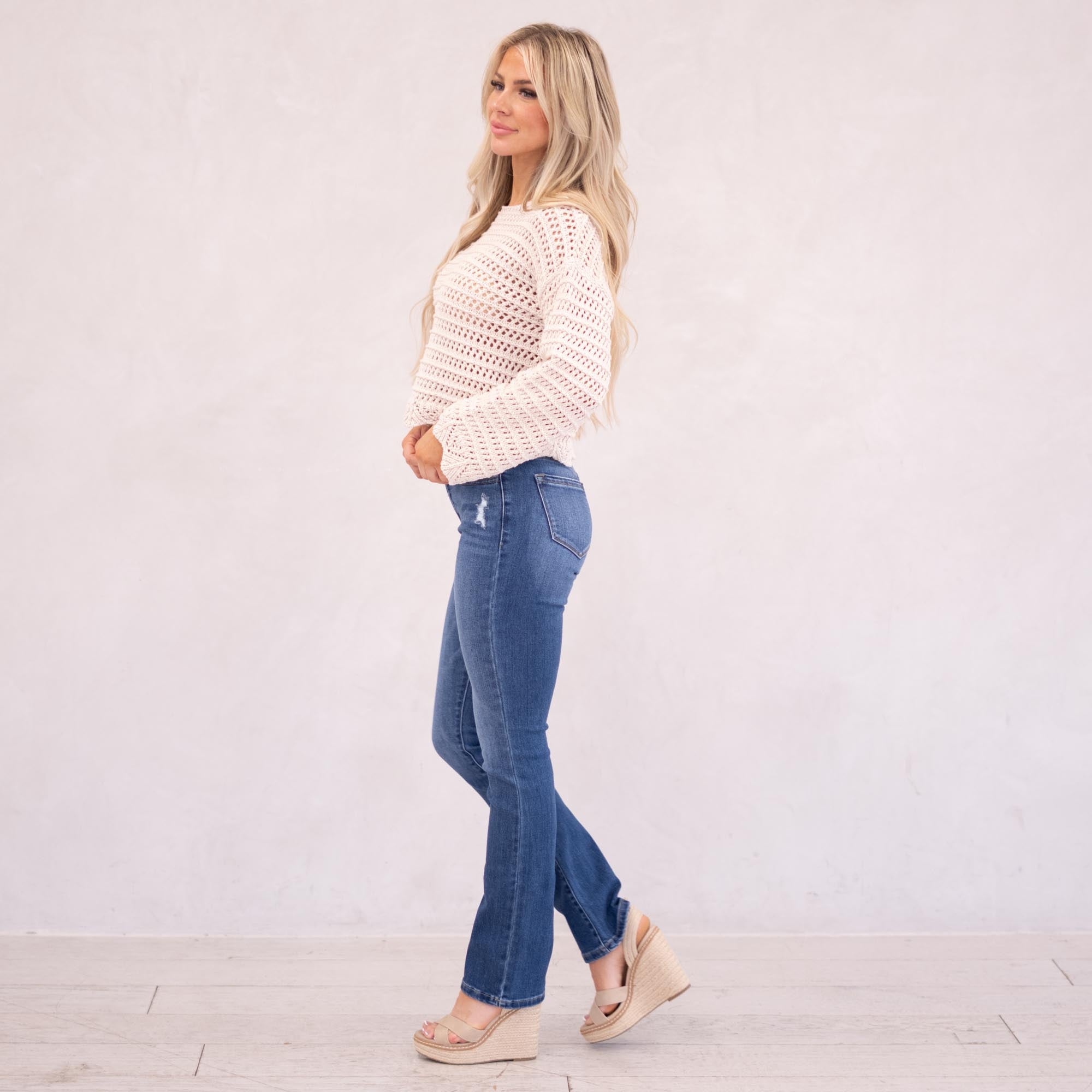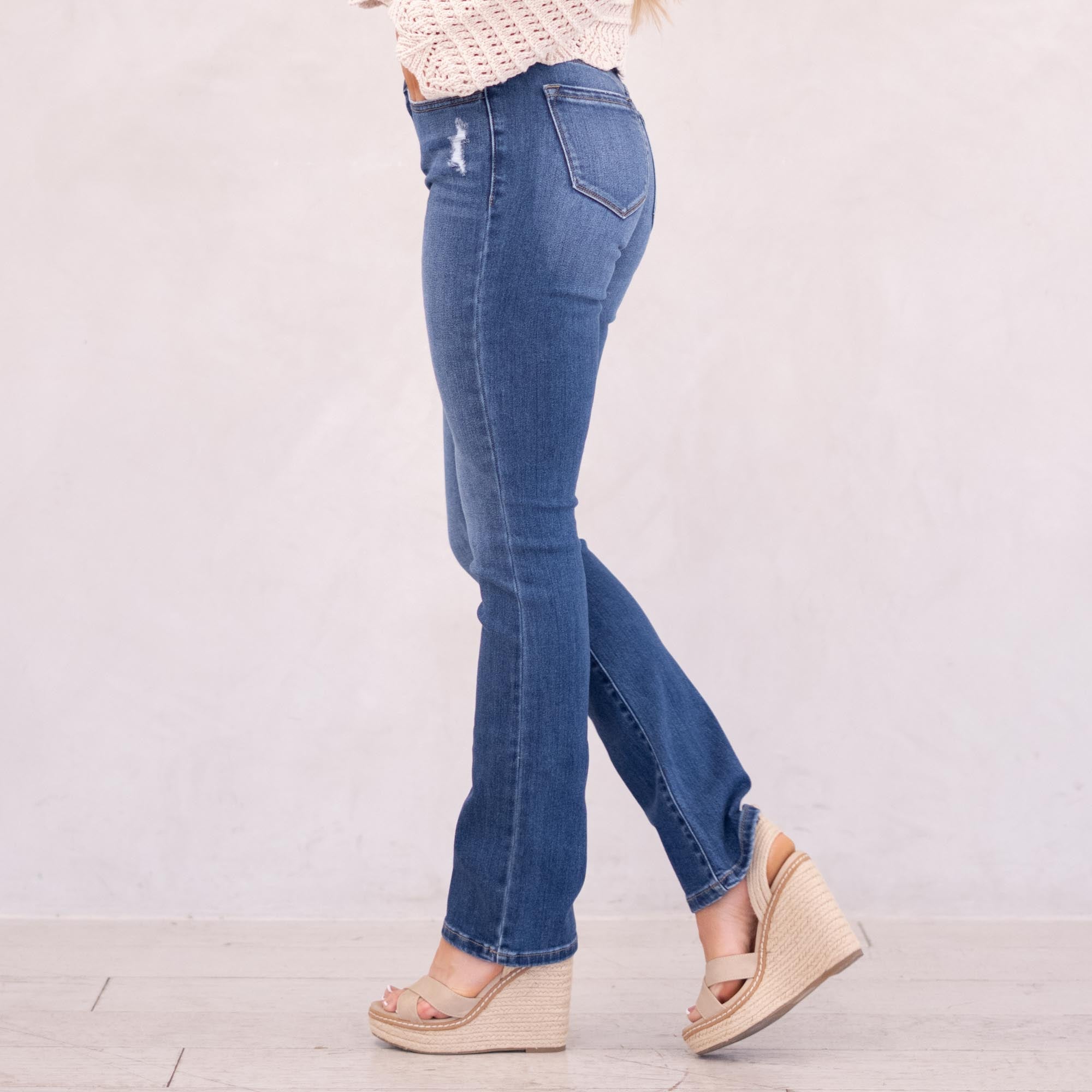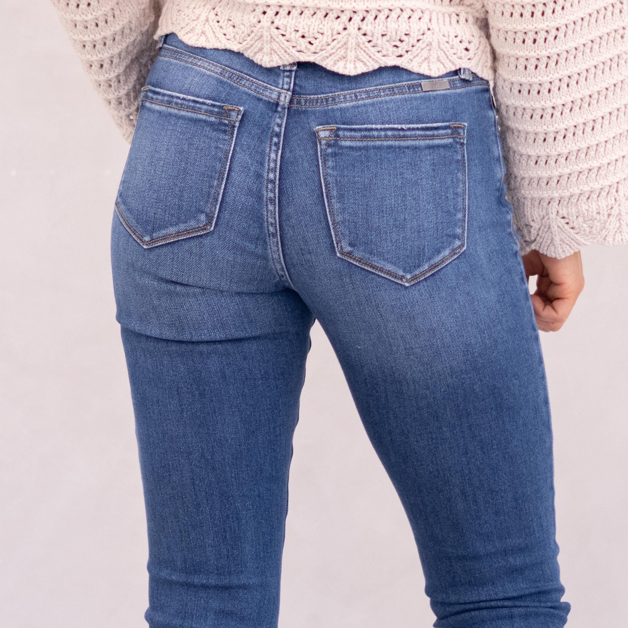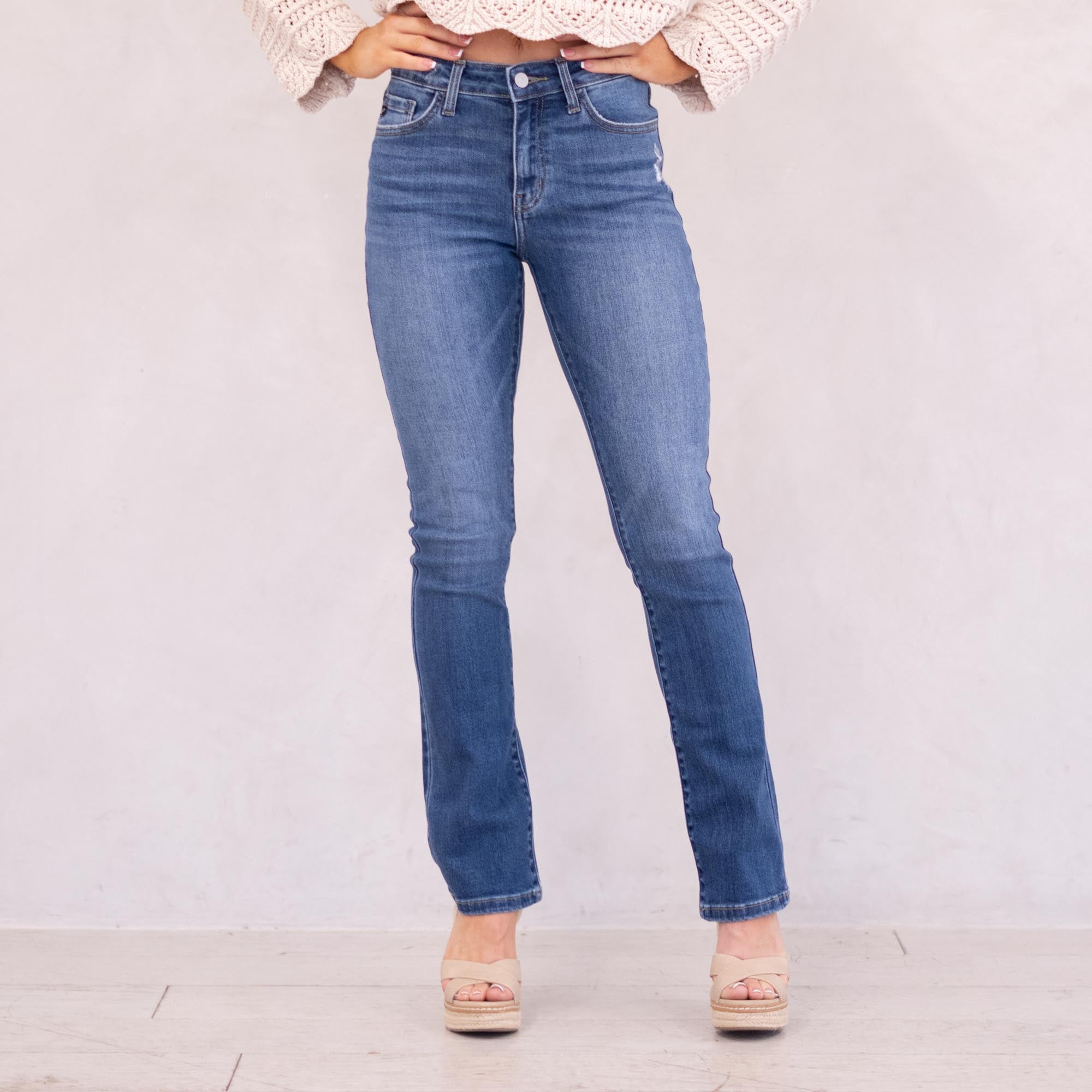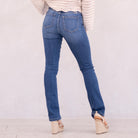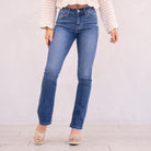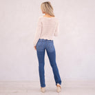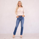 The Denver Essentials High Rise Bootcut features a flattering flared silhouette in a classic medium blue wash with soft fading and subtle whiskering for a timeless, chic finish. Designed to sit above the natural waist, this style tapers through the thigh before releasing into a graceful bootcut flare at the calf. Crafted from comfortable stretch denim that moves with you while maintaining its shape, it’s finished with a classic five-pocket design, single-button front, and zip-fly closure for an effortless everyday staple.