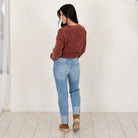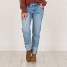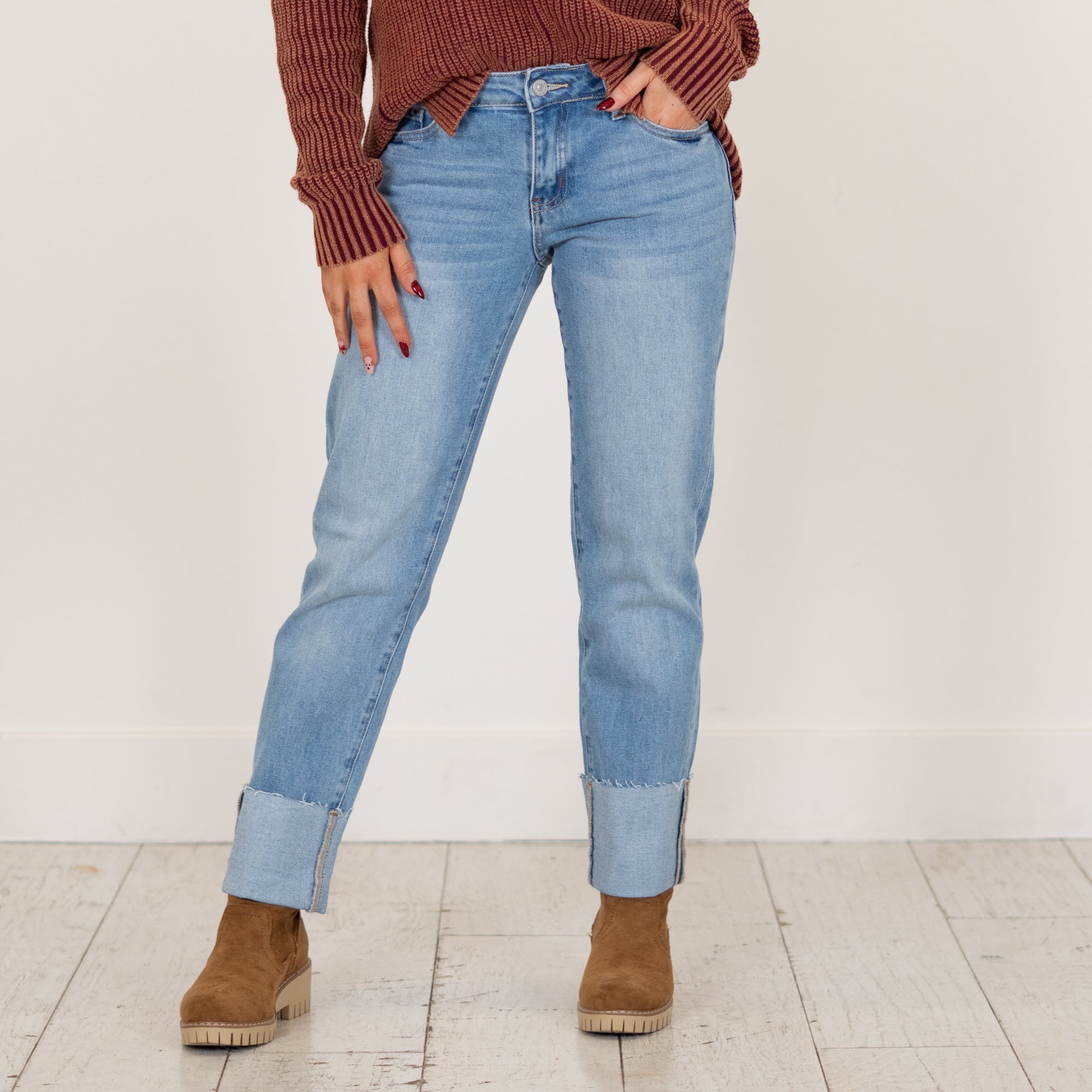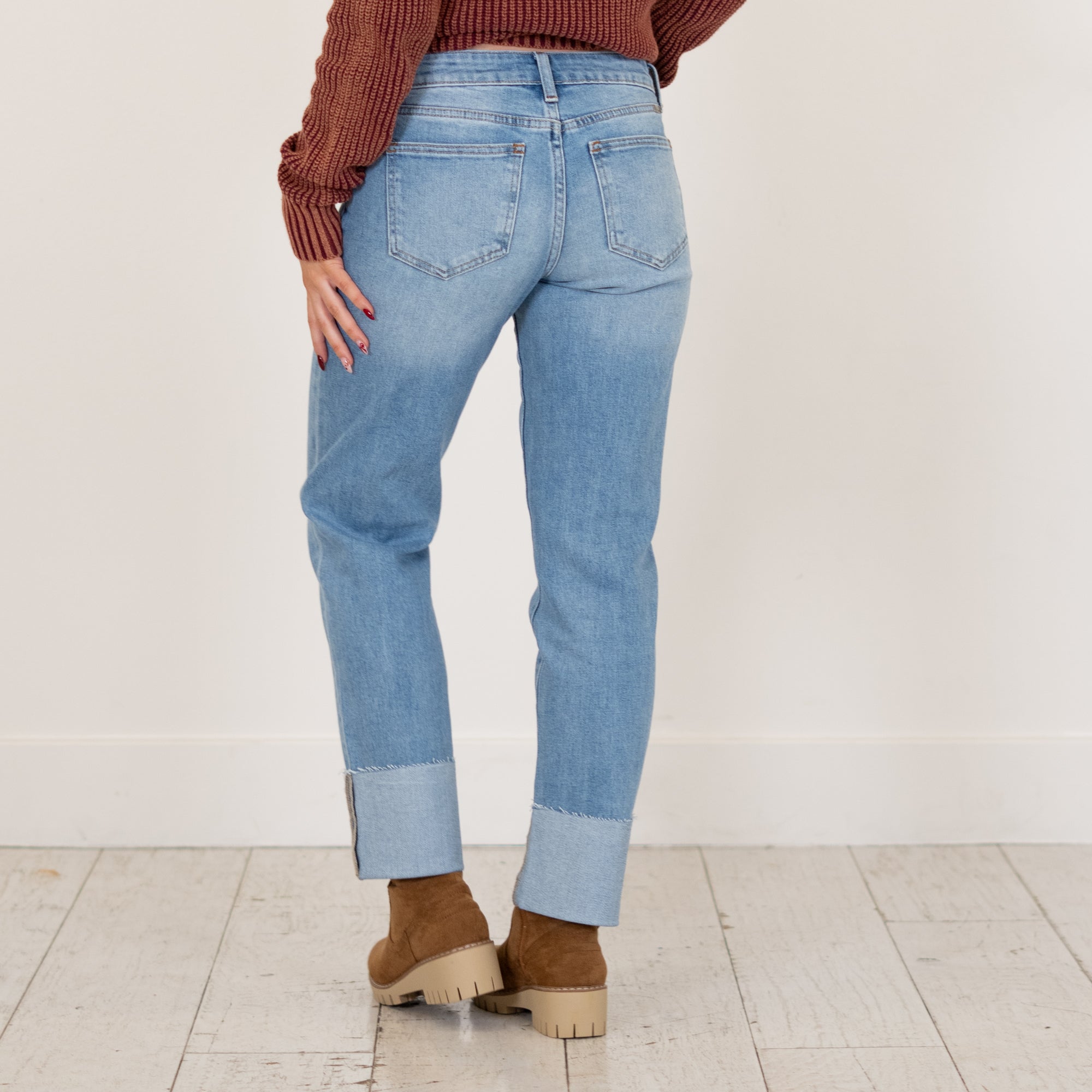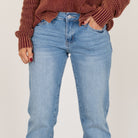 The Tiffany Essentials Low Rise Straight offers a timeless silhouette in a versatile medium-light wash that pairs effortlessly with anything in your closet. Designed with a comfortable stretch waistband for all-day wear, this straight-leg style falls cleanly into a crisp 4.5" single-fold hem for a polished finish. With no distressing for a sleek, classic look, it’s complete with five-pocket styling, a zip fly, and a single button closure—an easy, everyday staple you’ll reach for again and again.