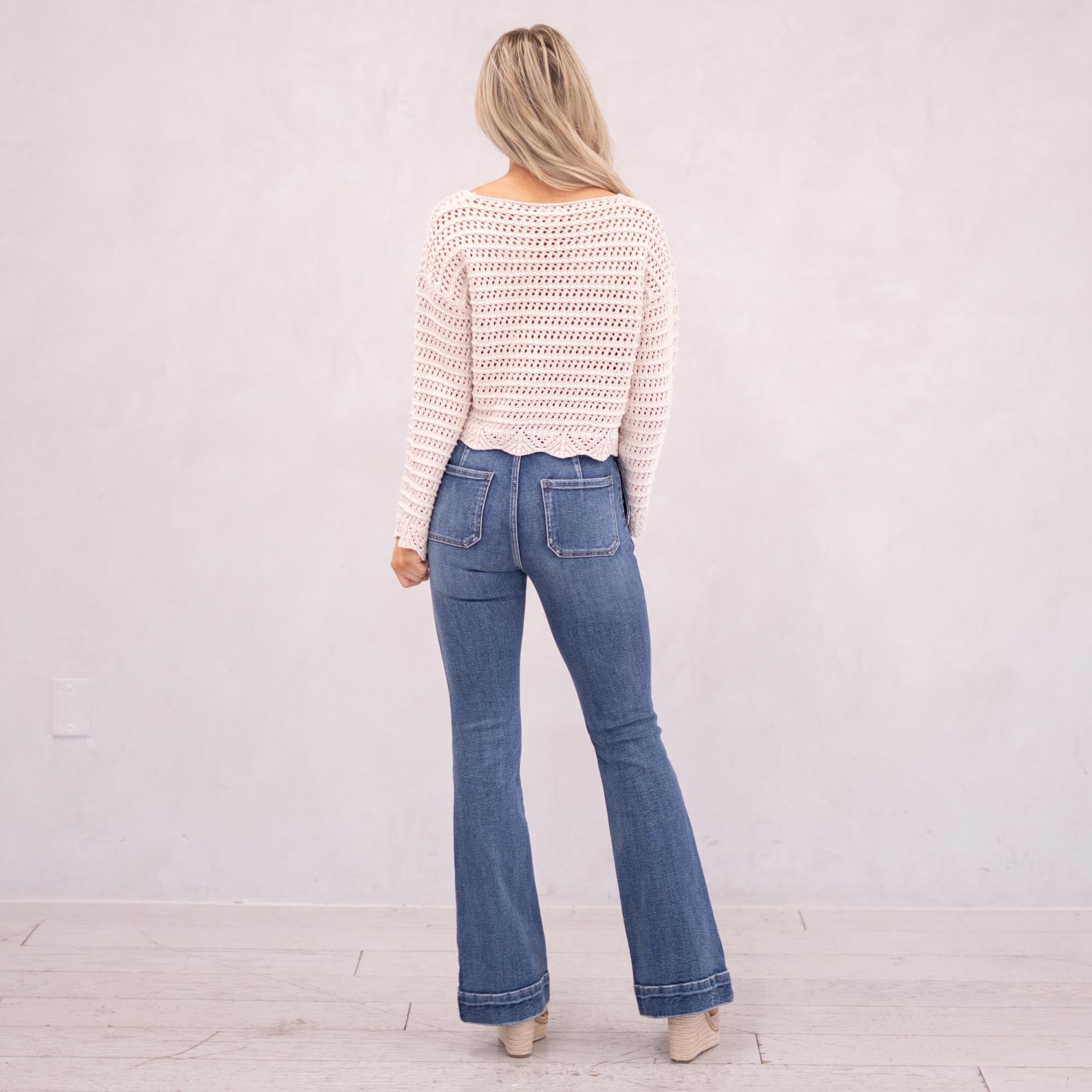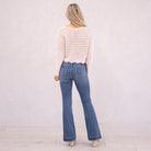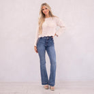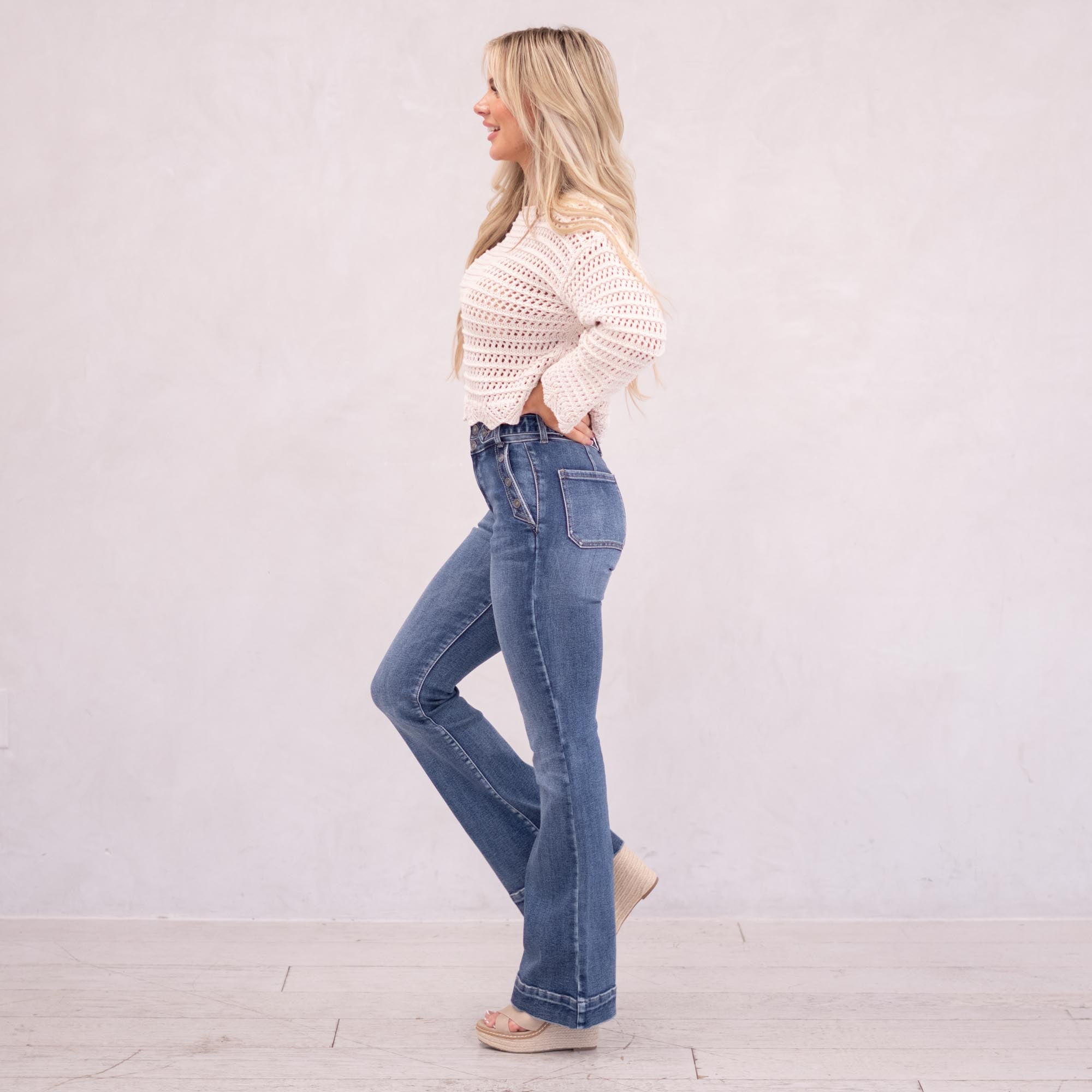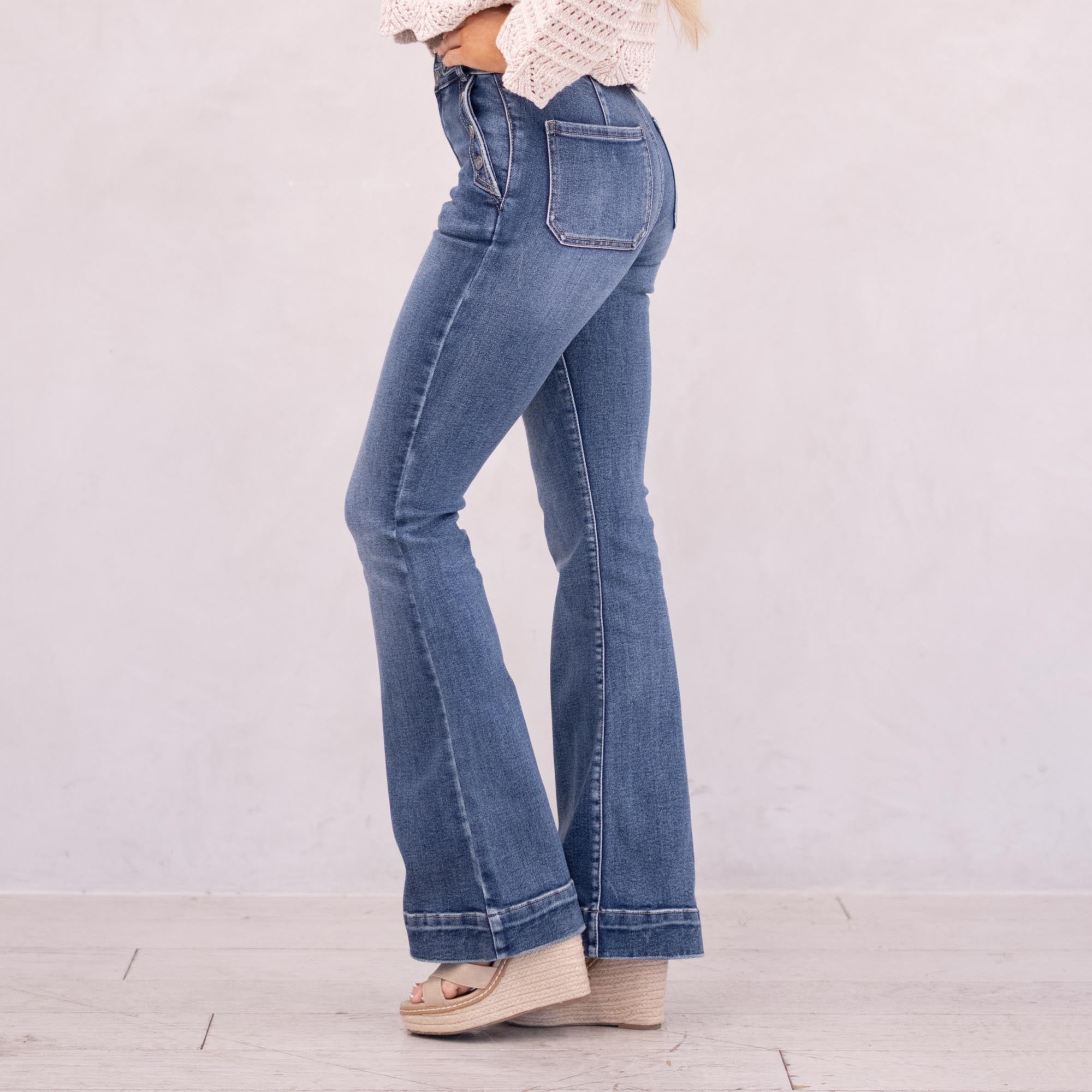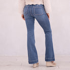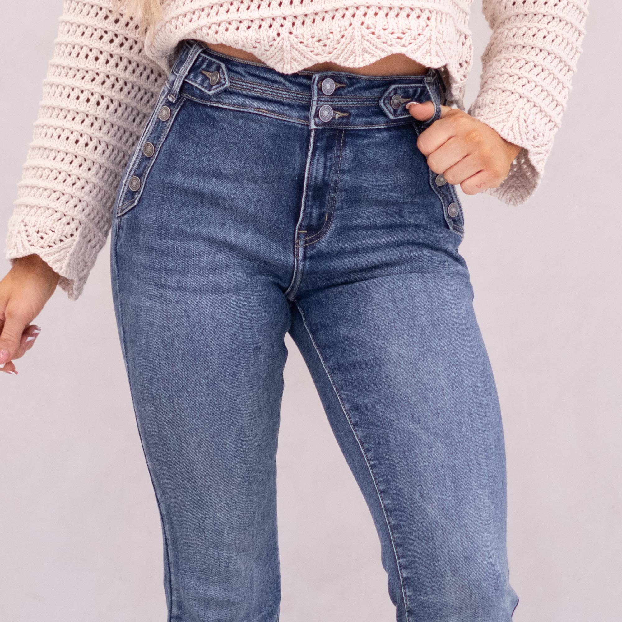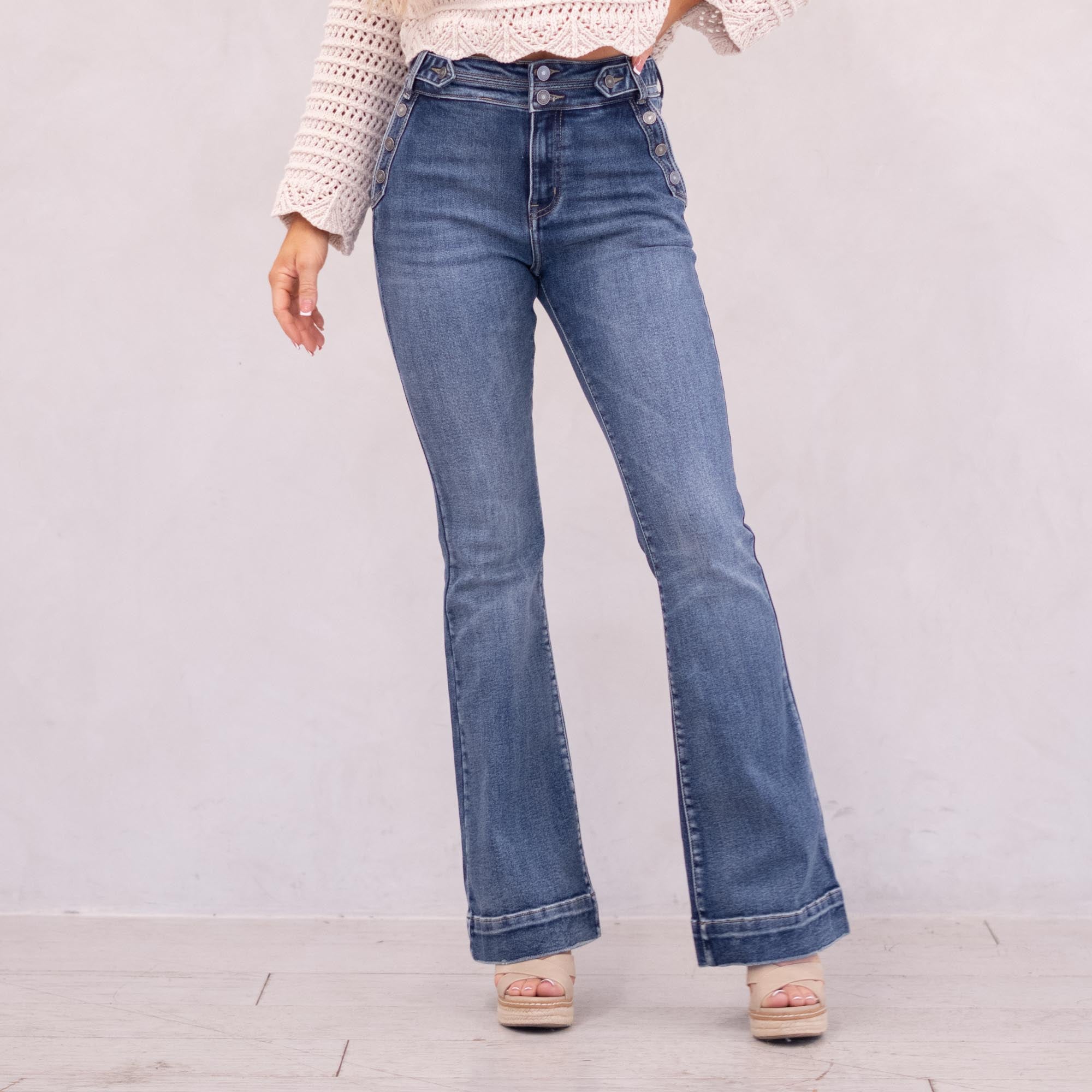The Kiery High Rise is a stunning new addition to our flare collection. Designed in a rich dark wash for a sleek, alluring finish, this style sits high on the waist and hugs through the hips and thighs before flowing into a flattering flare. Featuring front slant pockets, a multi-button closure, and a 2.25" waistband with a tab button detail and double-button closure, this pair delivers structured sophistication with a bold, fashion-forward edge.