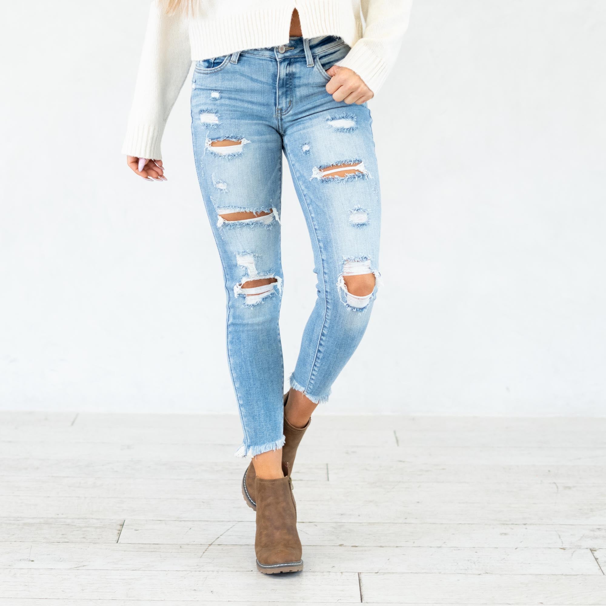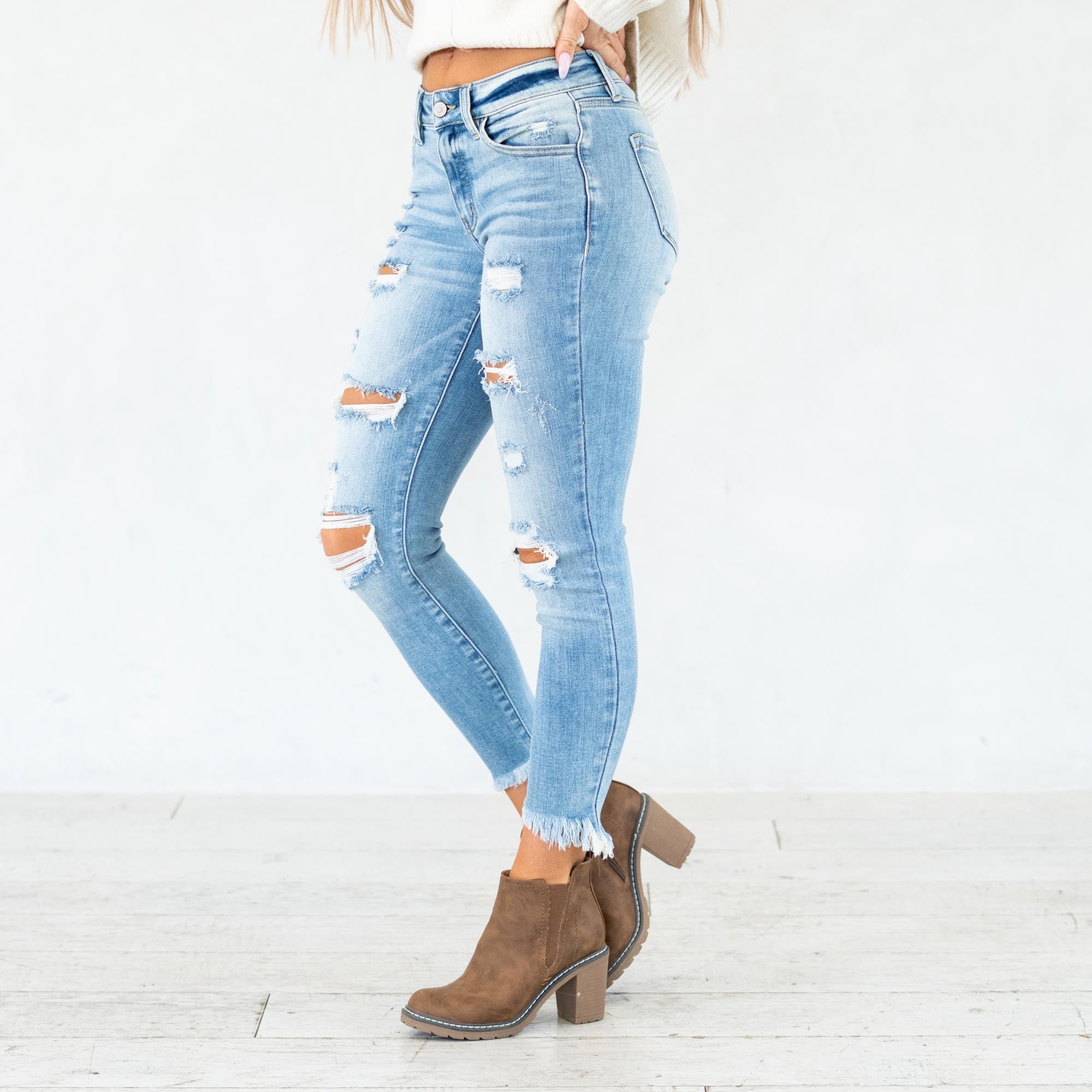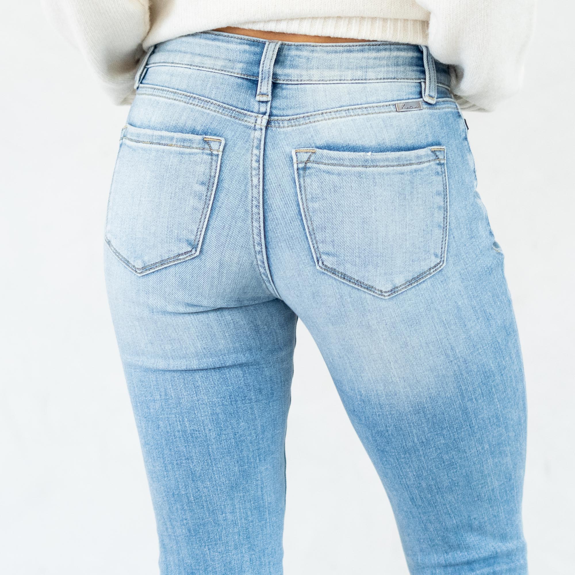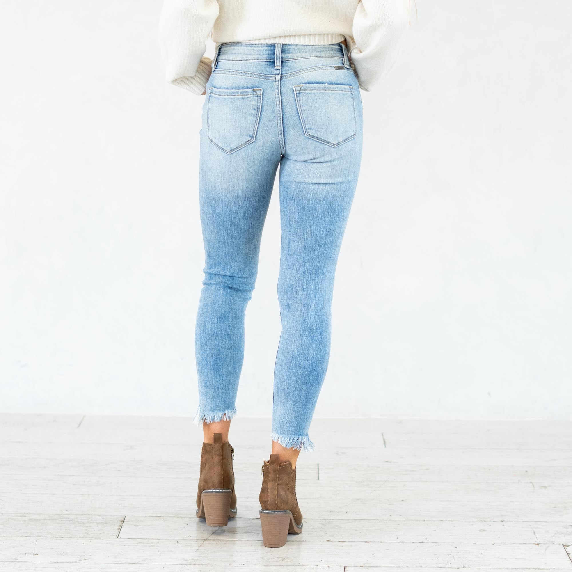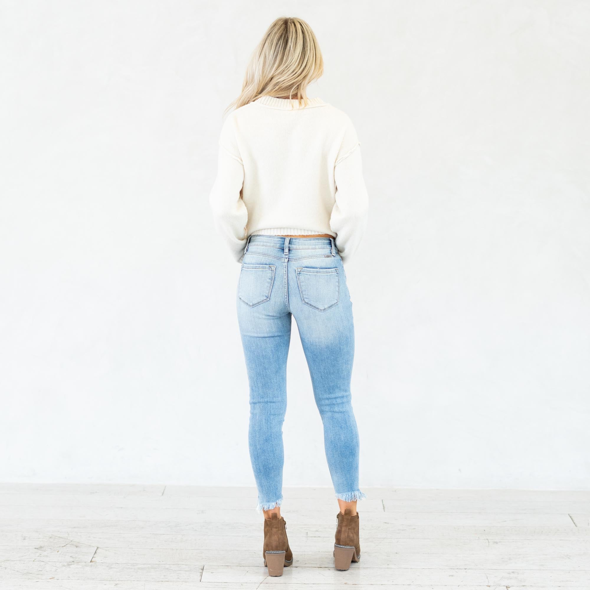 The Janine Mid Rise Cropped Skinny Jeans bring a fresh, edgy vibe to a classic silhouette. Designed in a faded light blue wash with natural whiskering, these jeans strike the perfect balance between casual and cool. The mid-rise waist provides a flattering fit that contours your curves, while the skinny leg creates a sleek, modern shape.