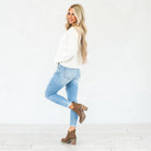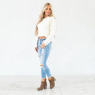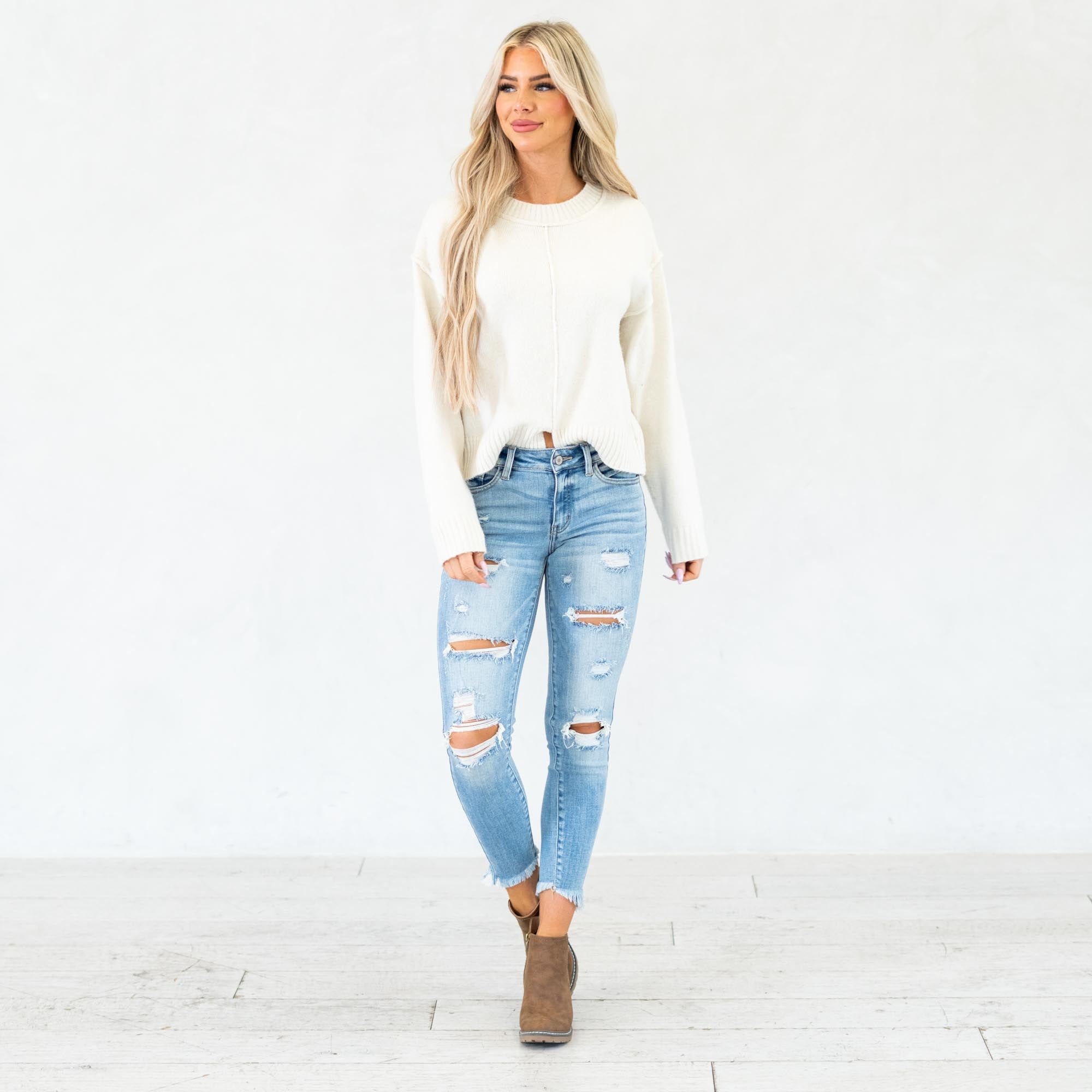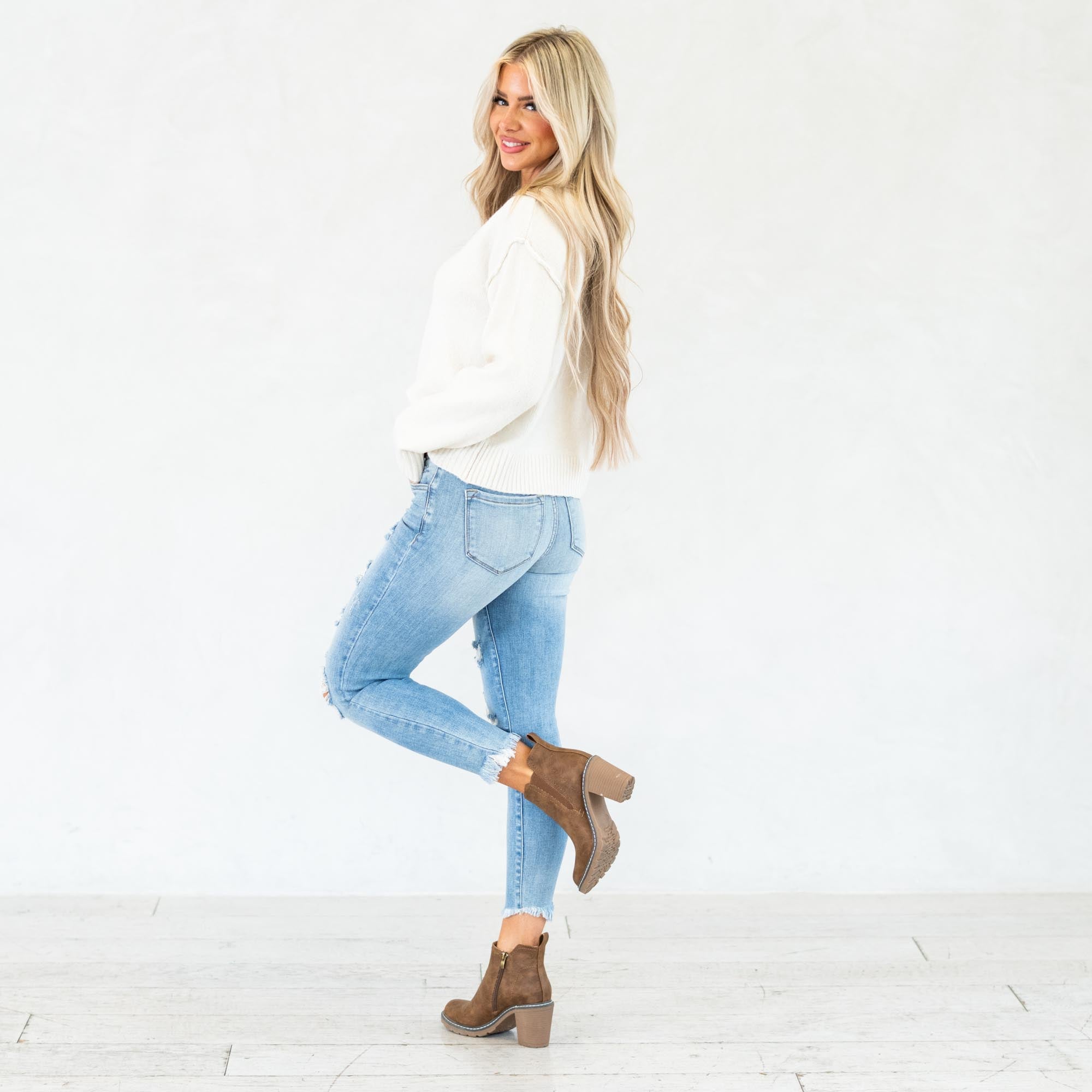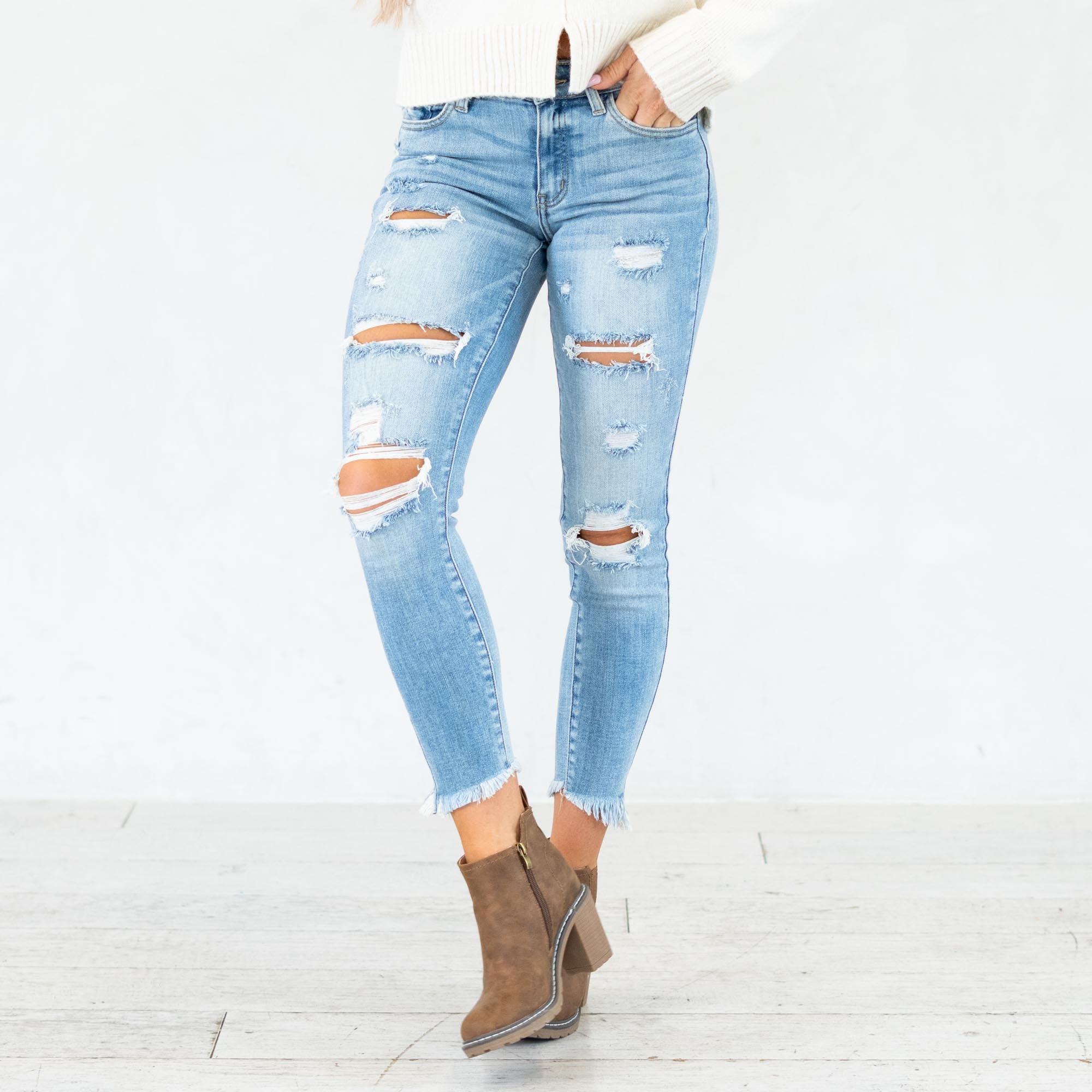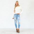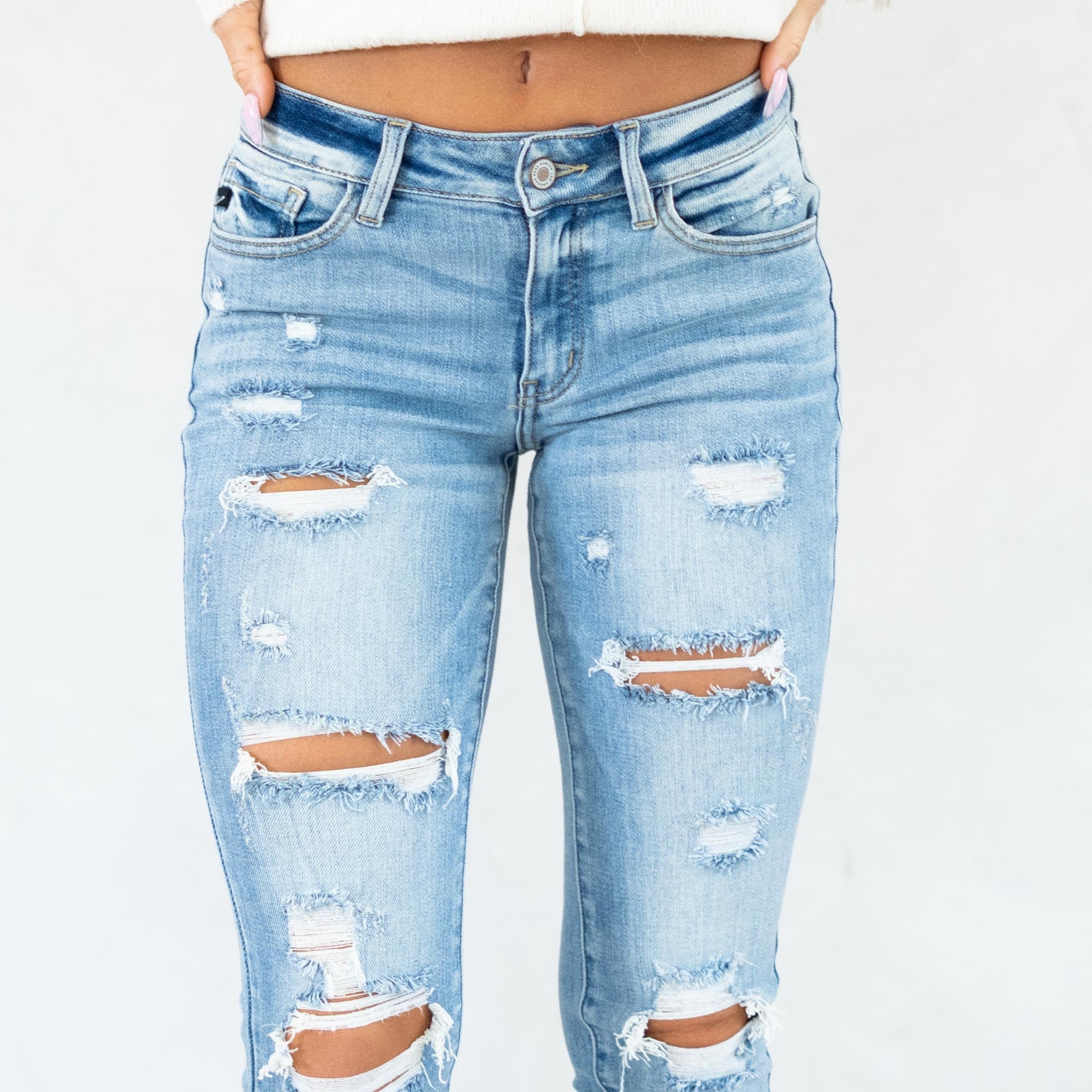 The Janine Mid Rise Cropped Skinny Jeans bring a fresh, edgy vibe to a classic silhouette. Designed in a faded light blue wash with natural whiskering, these jeans strike the perfect balance between casual and cool. The mid-rise waist provides a flattering fit that contours your curves, while the skinny leg creates a sleek, modern shape.