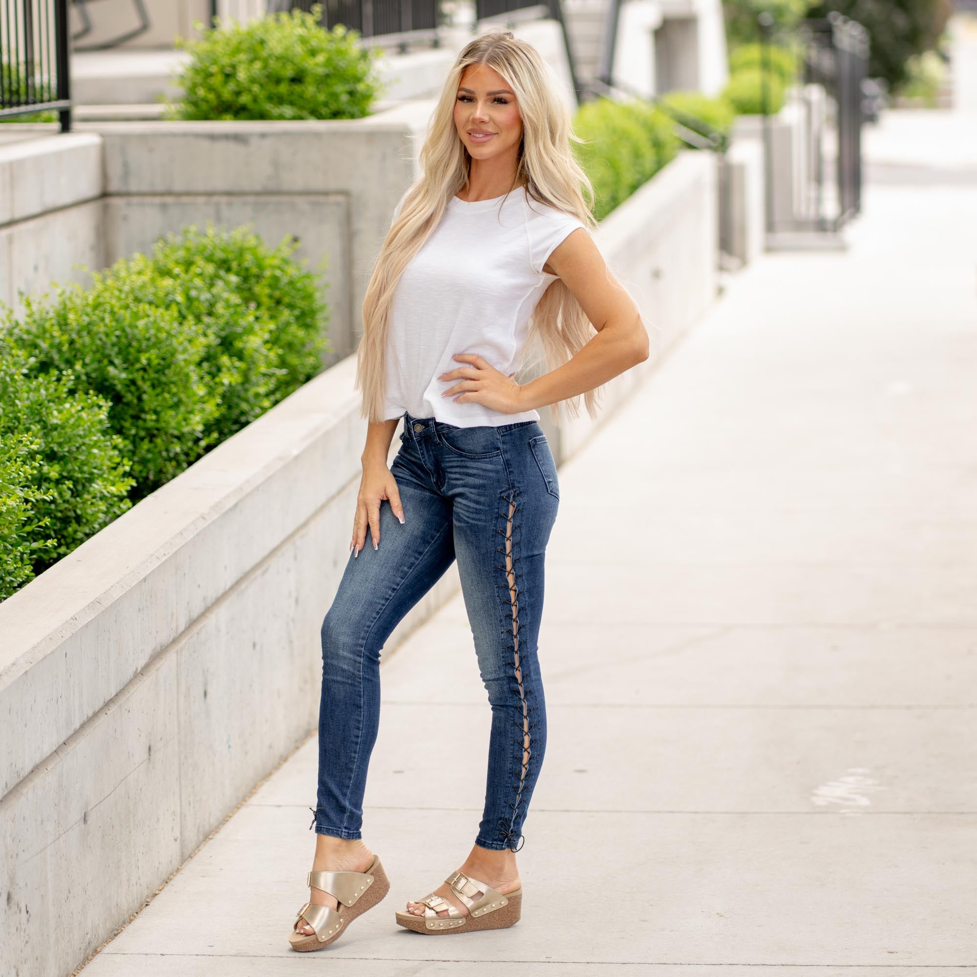 The Jackie Mid Rise Ankle Skinny adds a delicate twist to your denim rotation. Designed in a faded medium wash with a sleek skinny fit, this style features outer seam lace detailing at the hem for a chic, feminine finish. Crafted from soft, flexible denim for all-day comfort, and finished with a single-button closure, zip fly, belt loops, and classic five-pocket styling. Perfect for dressing up with heels or keeping it casual with flats.