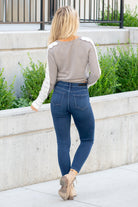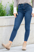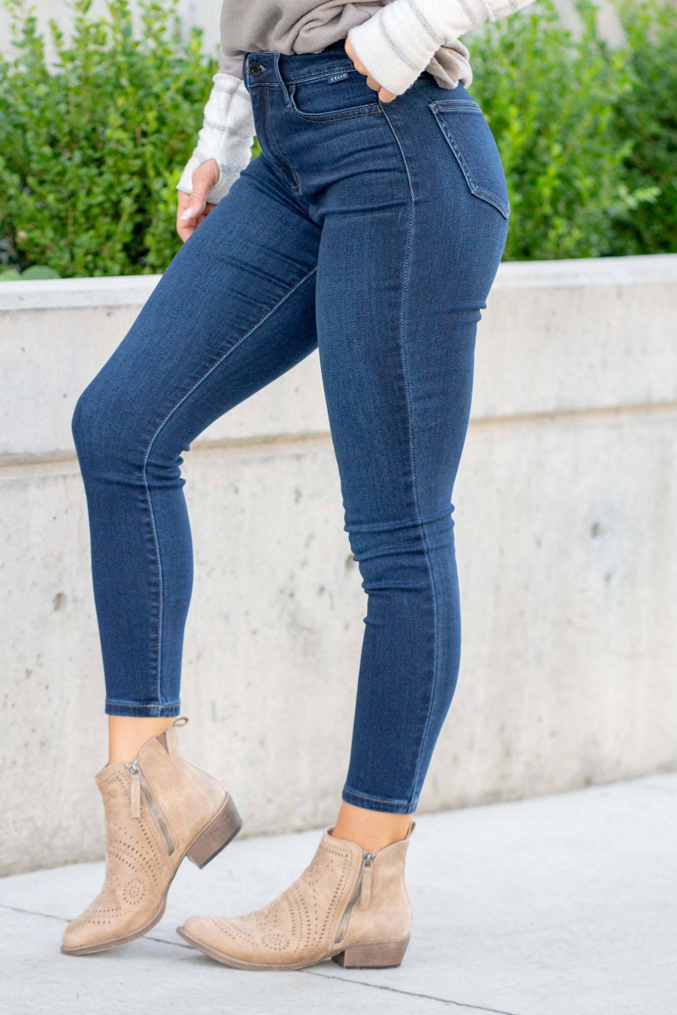 These high-rise ankle skinny jeans in a dark wash offer a sleek and versatile addition to your wardrobe. Their high waist provides a flattering fit, and the ankle length adds a modern touch. Perfect for dressing up or down, these jeans are a timeless choice for various occasions.