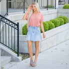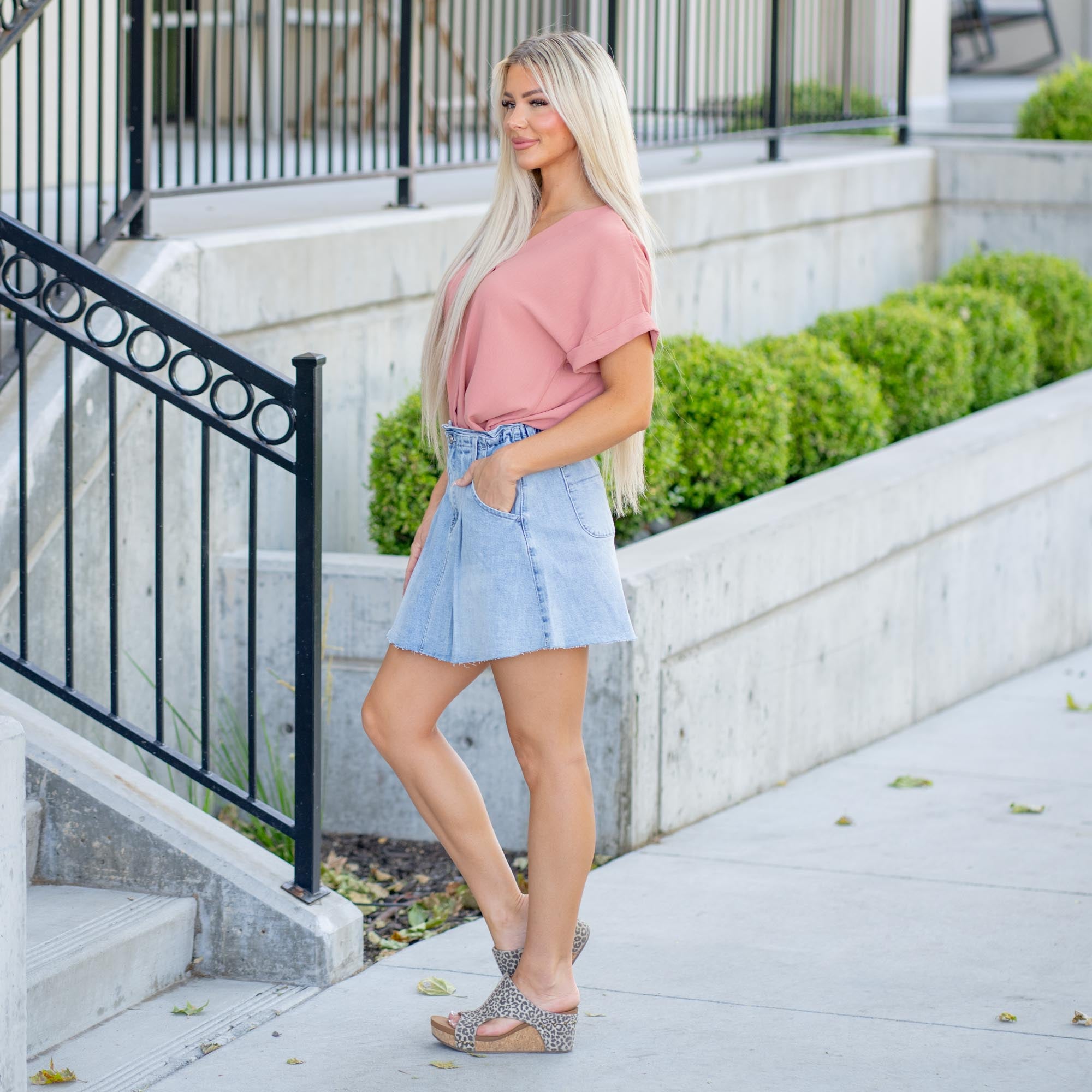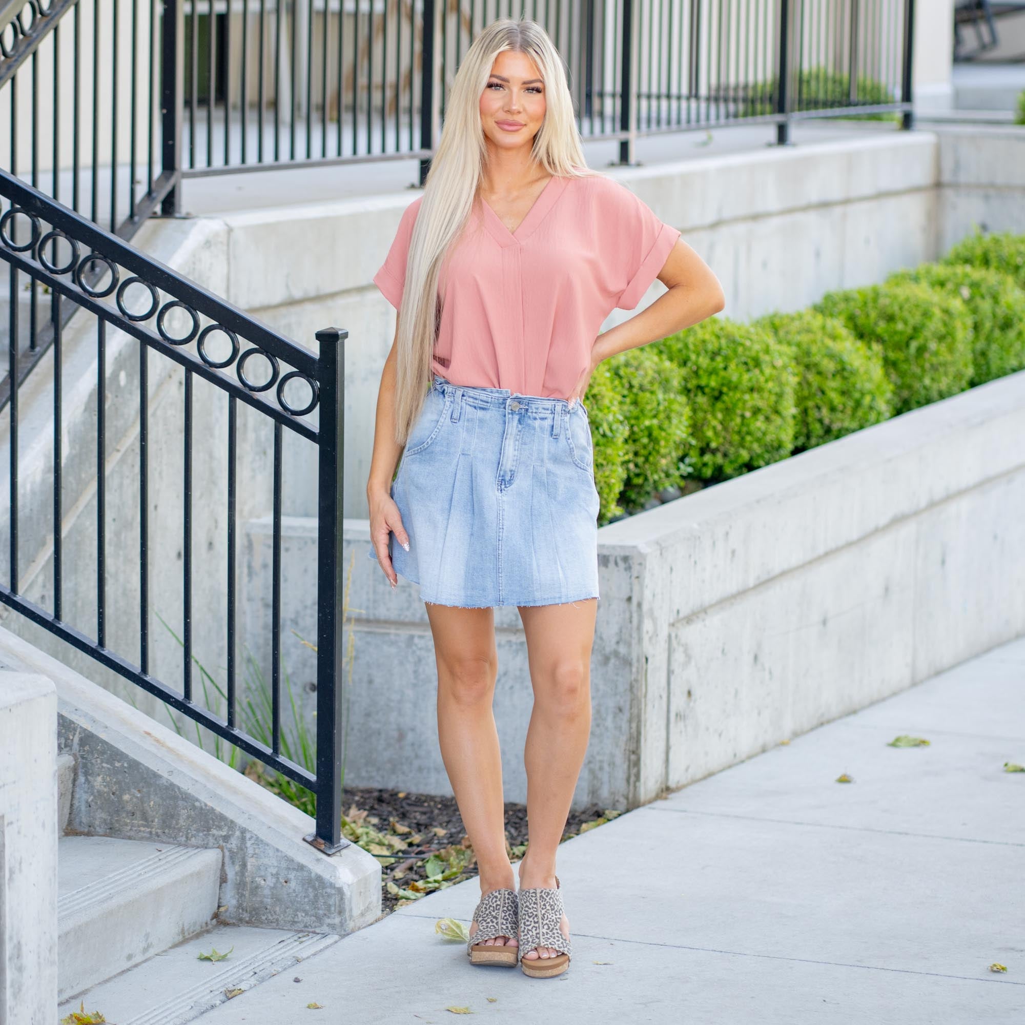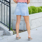 Thoughtful details include elongated front pockets, a mini waistband, front darts with soft pleats, back patch pockets, and a clean single-button closure. Equal parts playful and polished, Kerro is the kind of denim skirt you’ll reach for again and again.