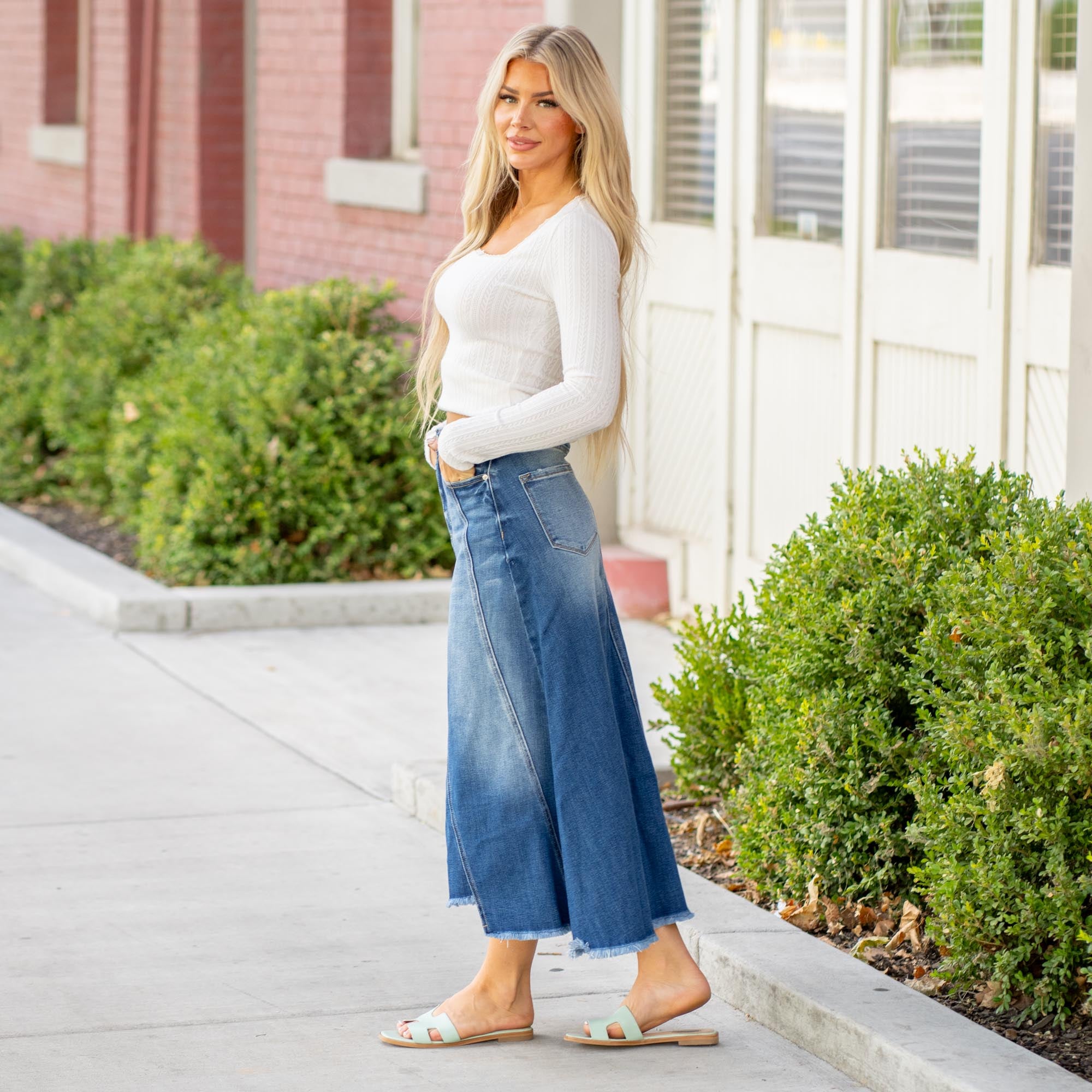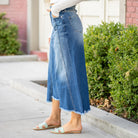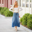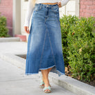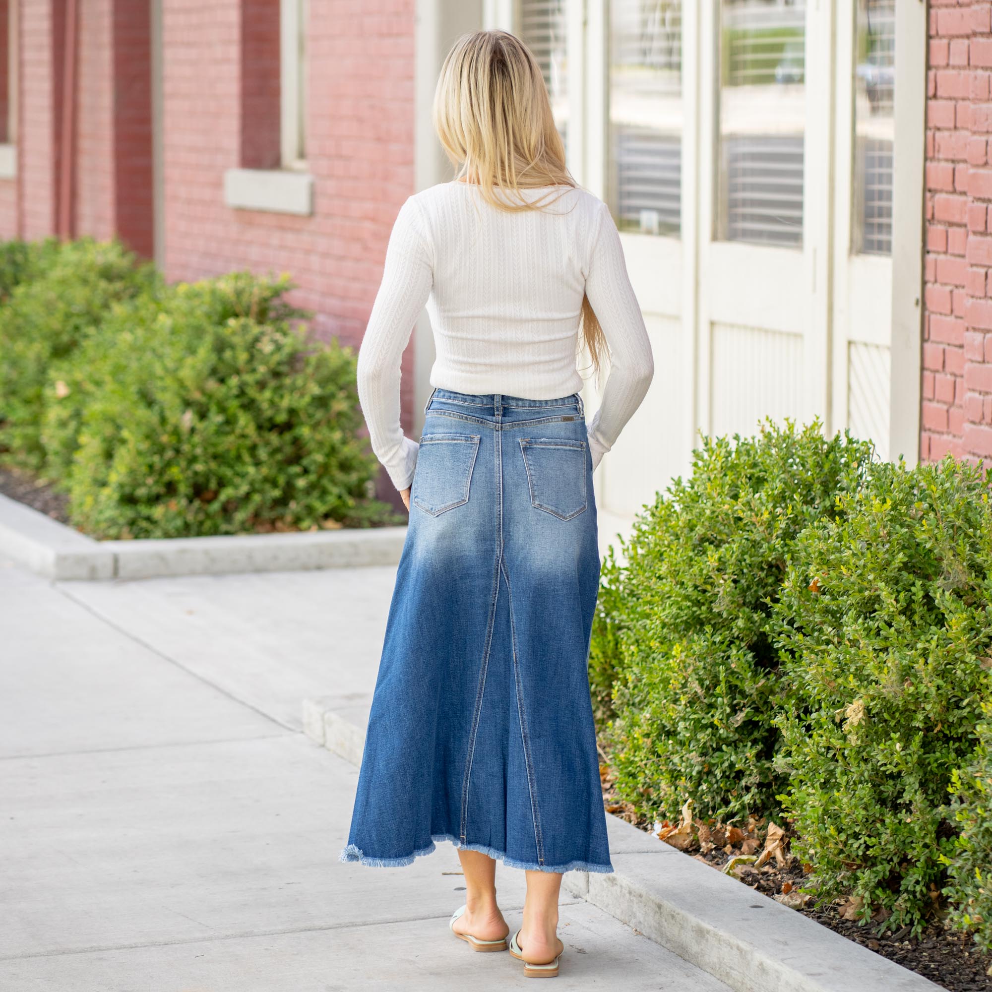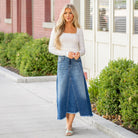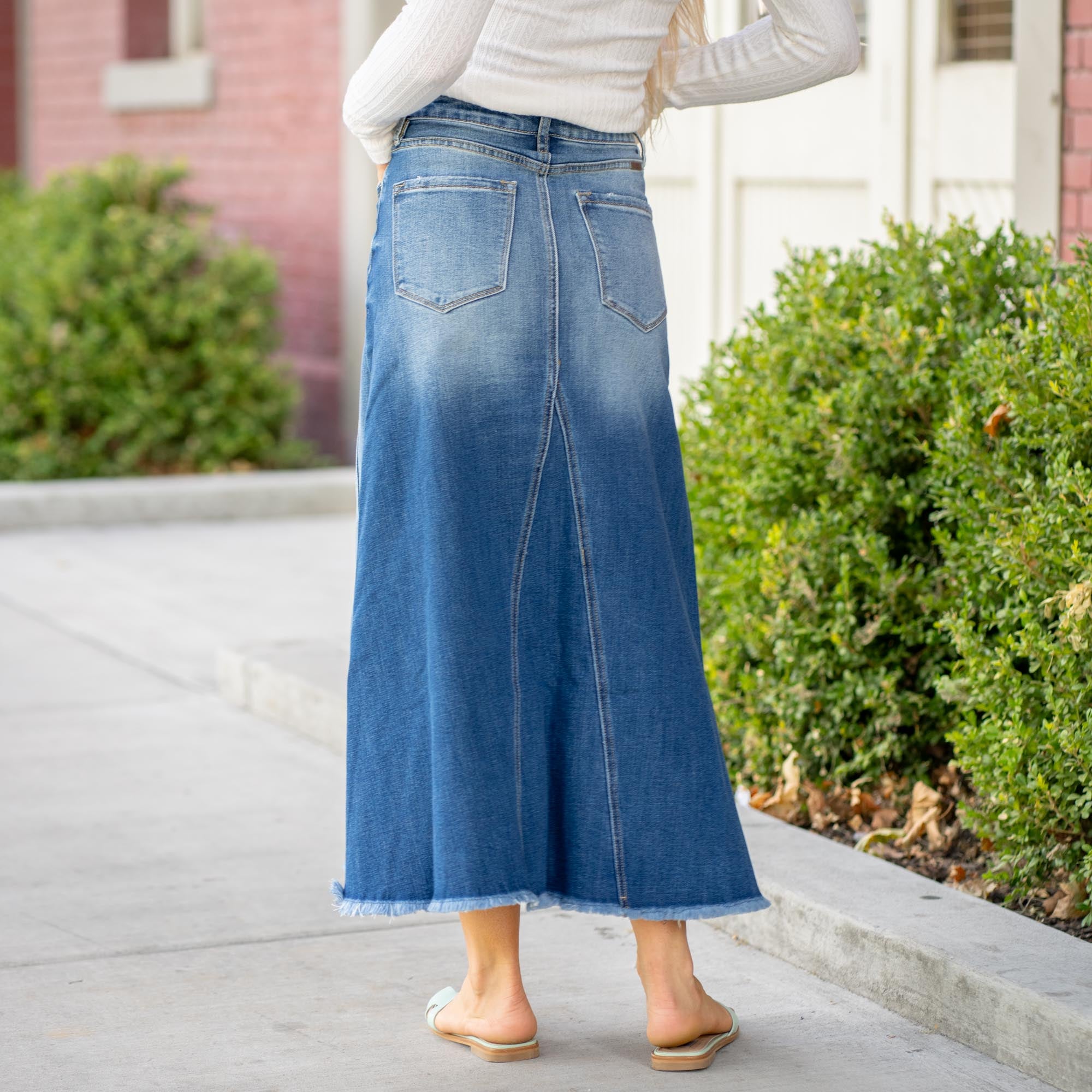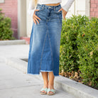 The Isobella Frayed Hem Midi Denim Skirt is the perfect blend of timeless and trendy. Designed in a longer midi length, it offers just the right amount of coverage while still keeping your look fresh and modern. The uneven hem and front seam details add texture and dimension, while the frayed edges bring in that laid-back, edgy vibe.