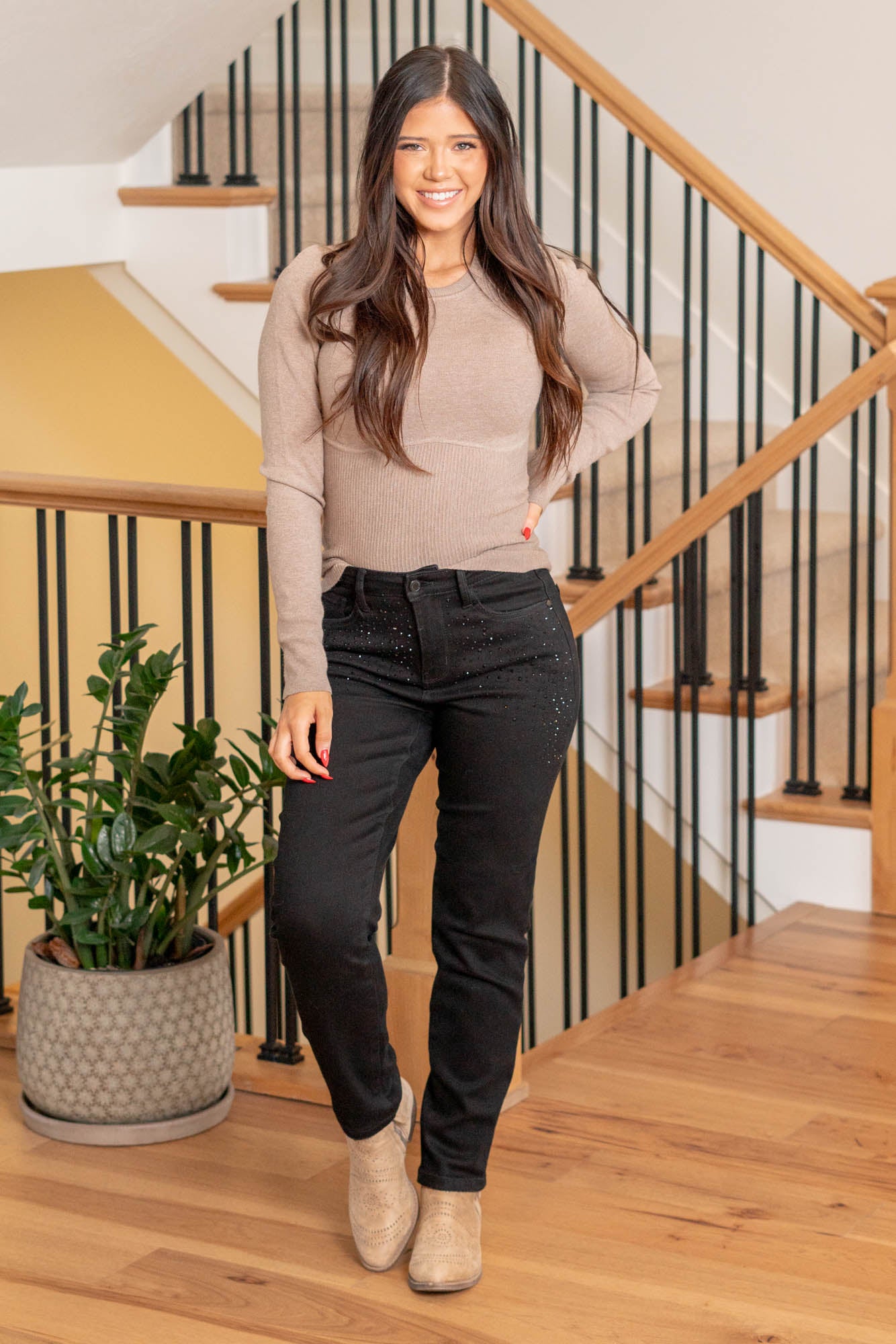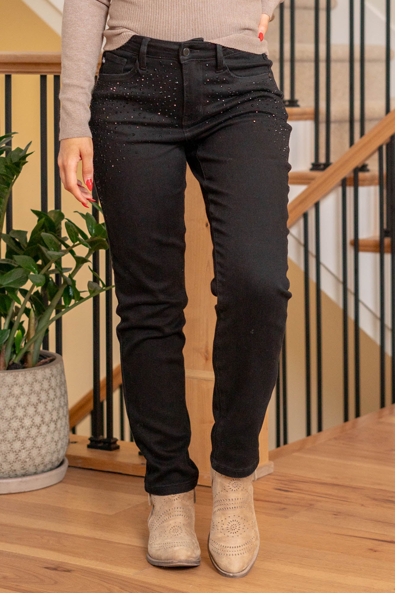 Elevate your style with our High Waist Rhinestone Glam Jeans in chic black. These slim-fit jeans are adorned with subtle rhinestone embellishments that add a touch of glamour to your look. The high waist design not only complements your figure but also keeps you on-trend. Step out in confidence and shine bright with this sleek and stylish pair!