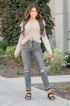 Jacquelyn wears a size 25 in jeans, a small in tops, and 6.5 in shoes. She is wearing size 25 in these jeans.