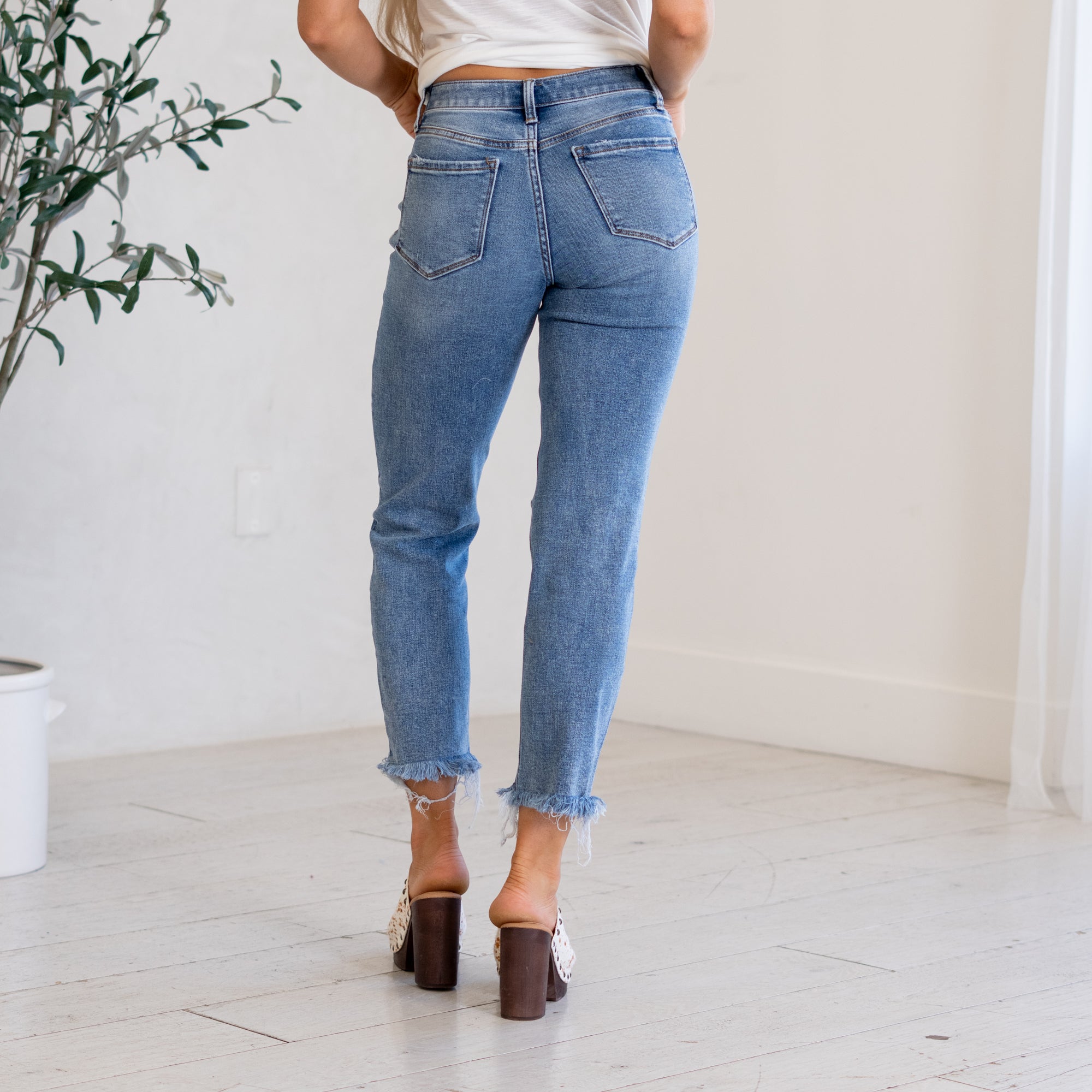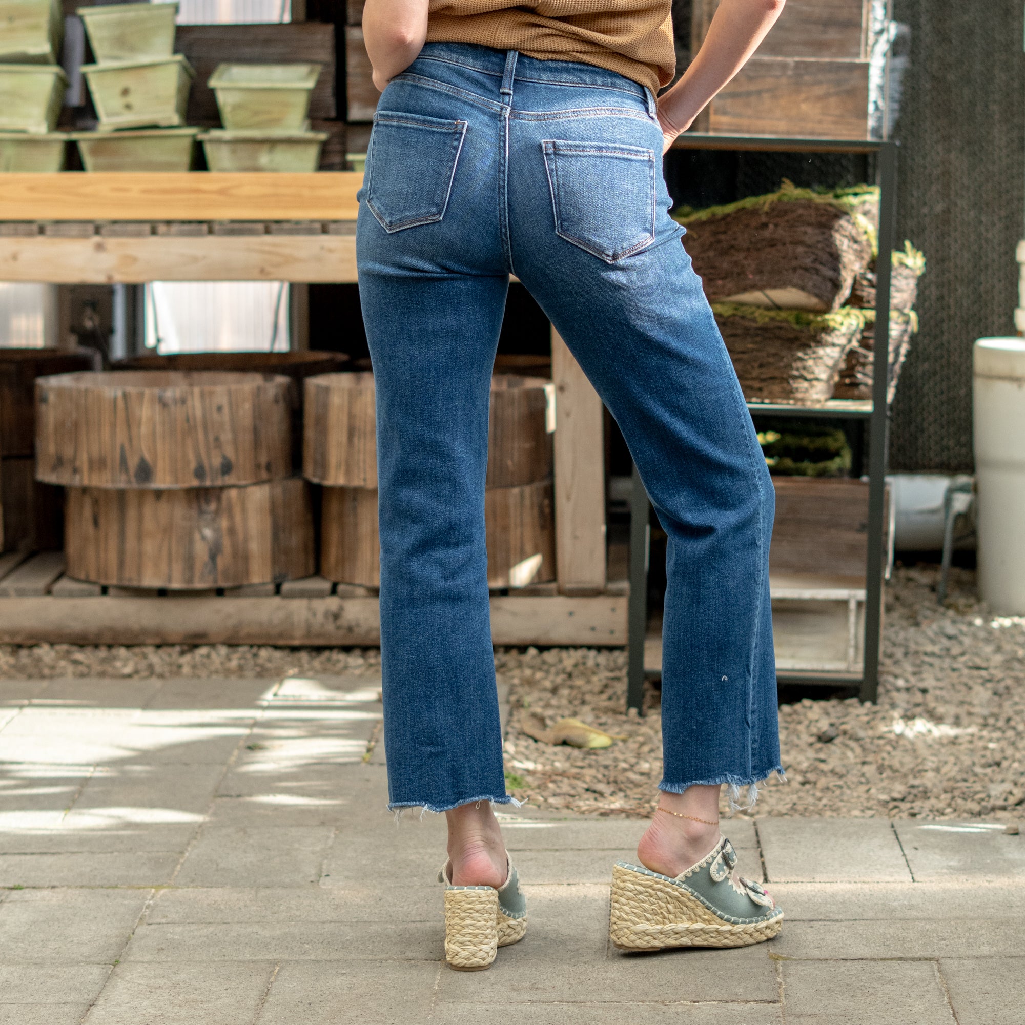 Risen Skyfall High Rise Cropped Frayed Hem Straight Jeans Medium Blue Wash