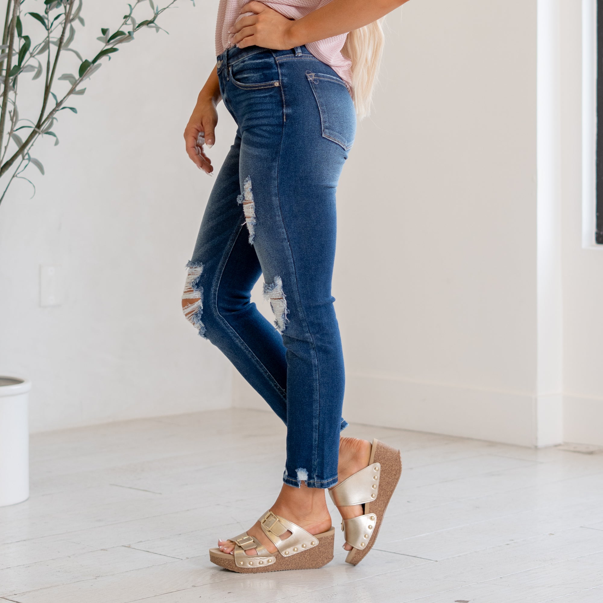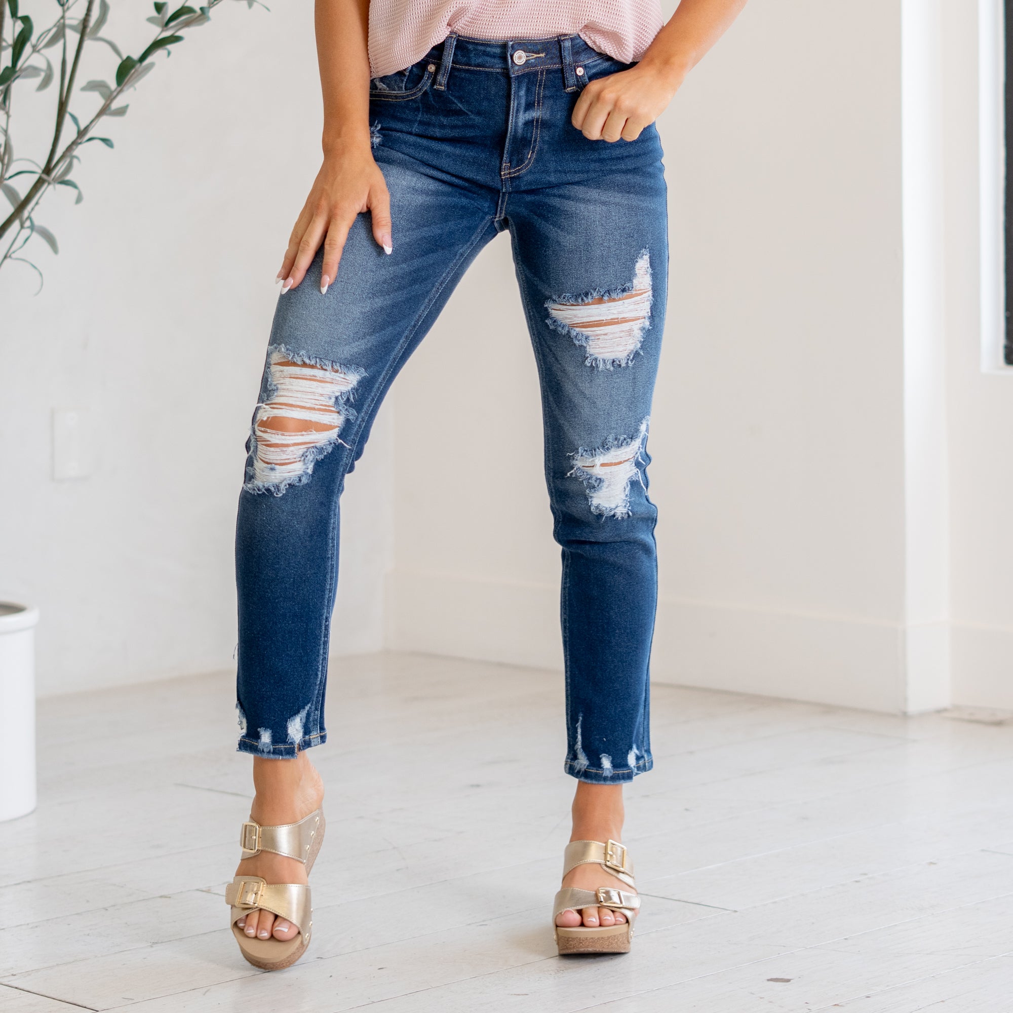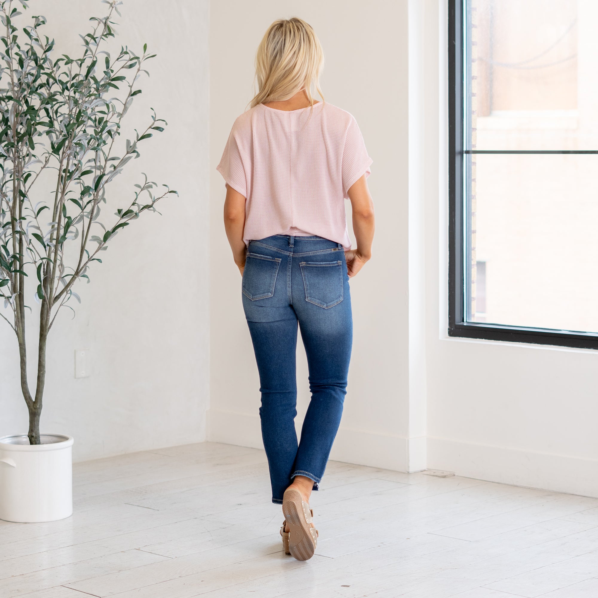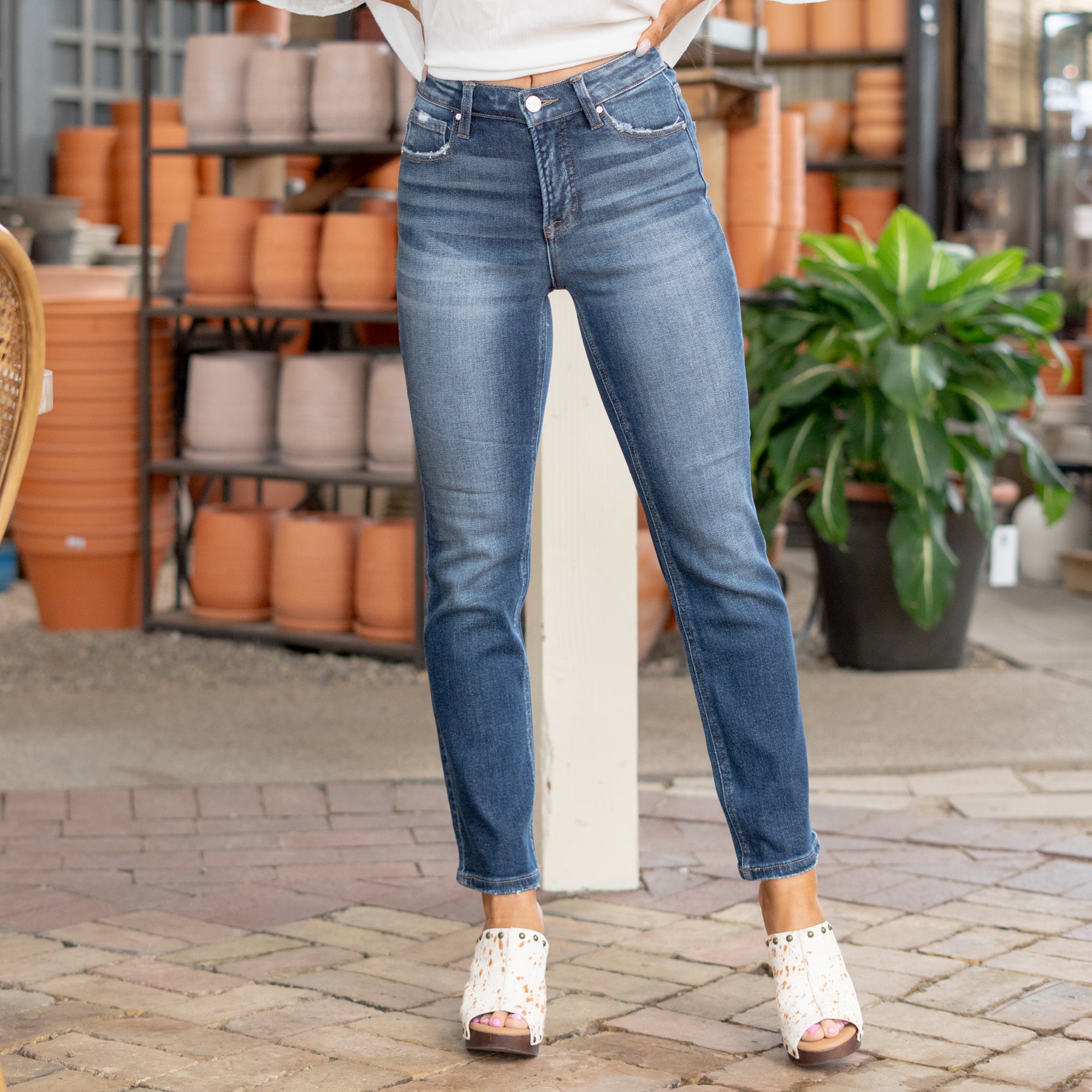 Risen Horizon Tummy Control Top High Rise Straight Leg Dark Blue Wash
