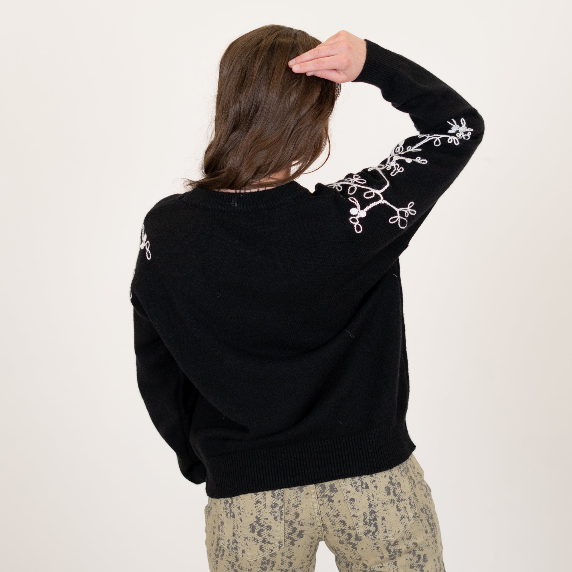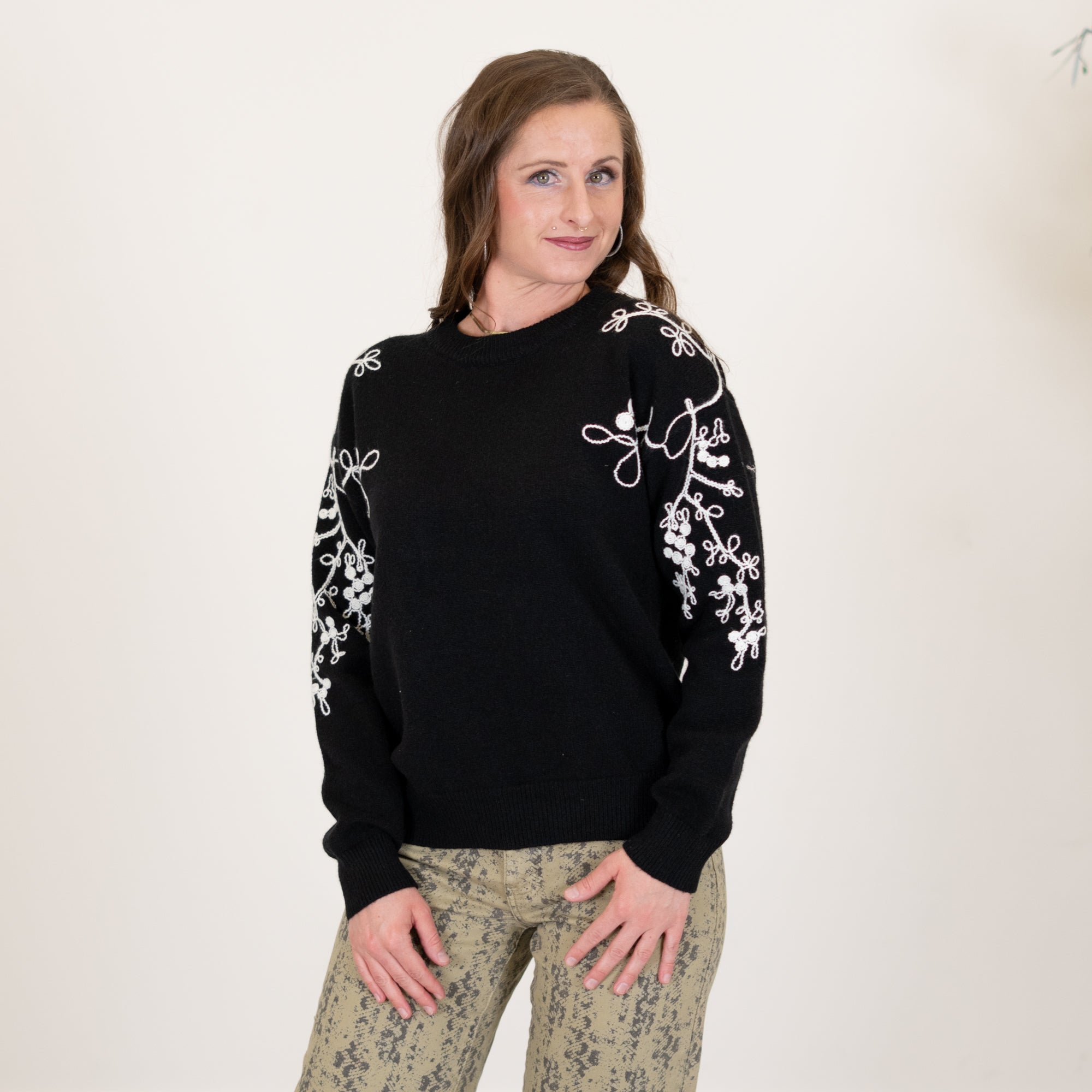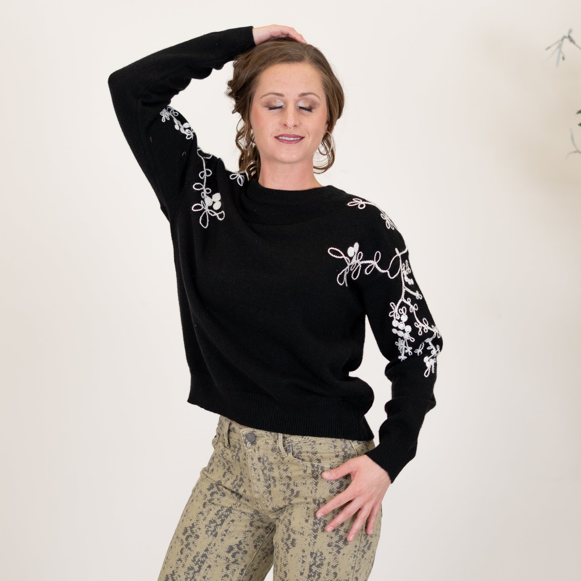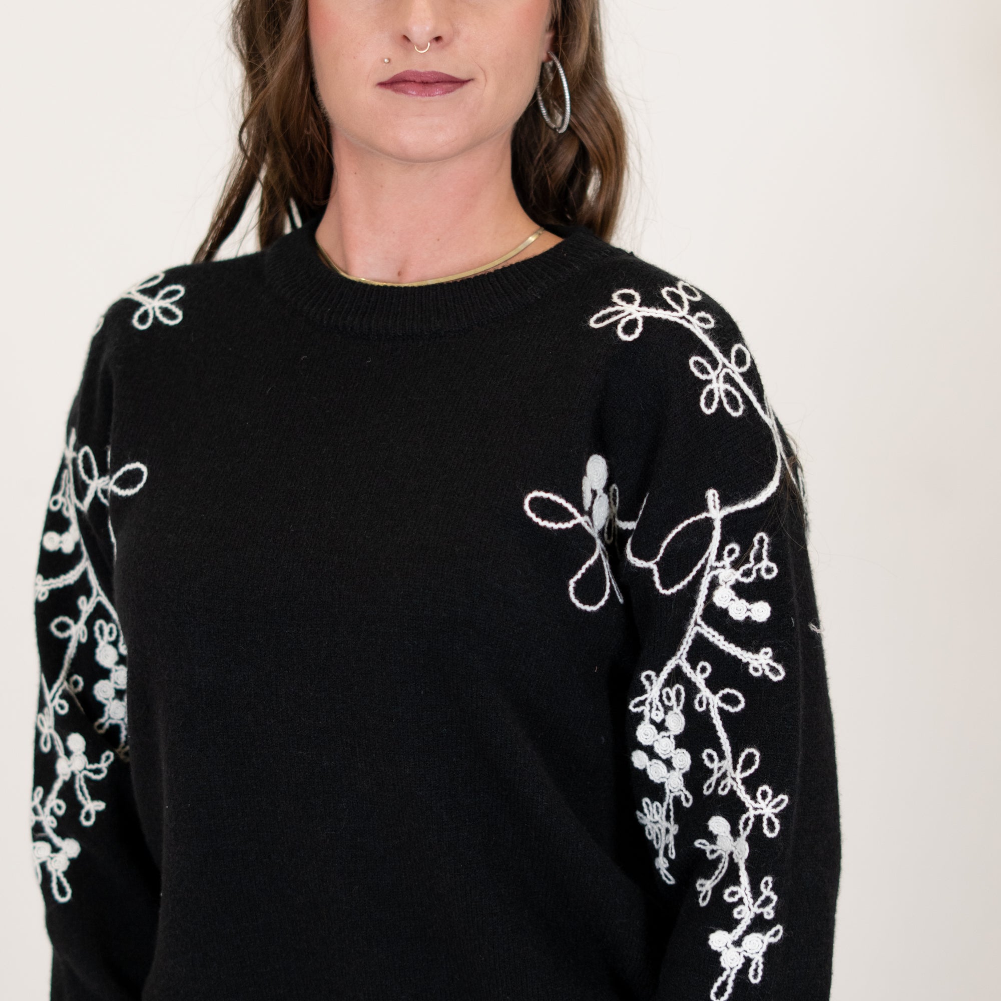 Hem & Thread Embroidered Crew Neck Pullover Sweater Black
