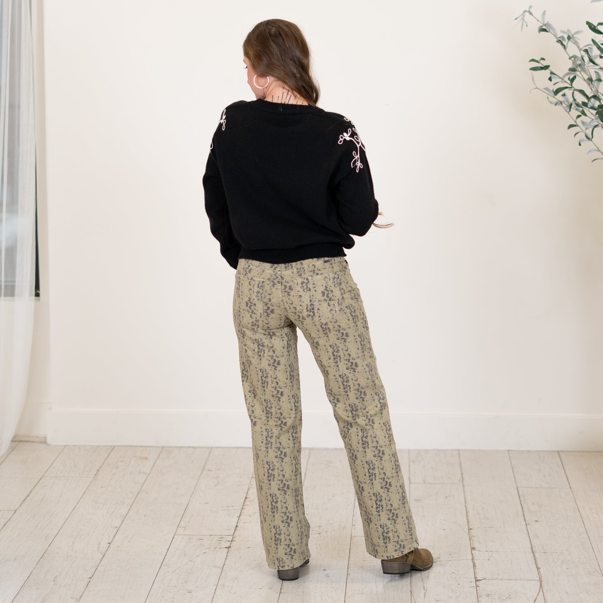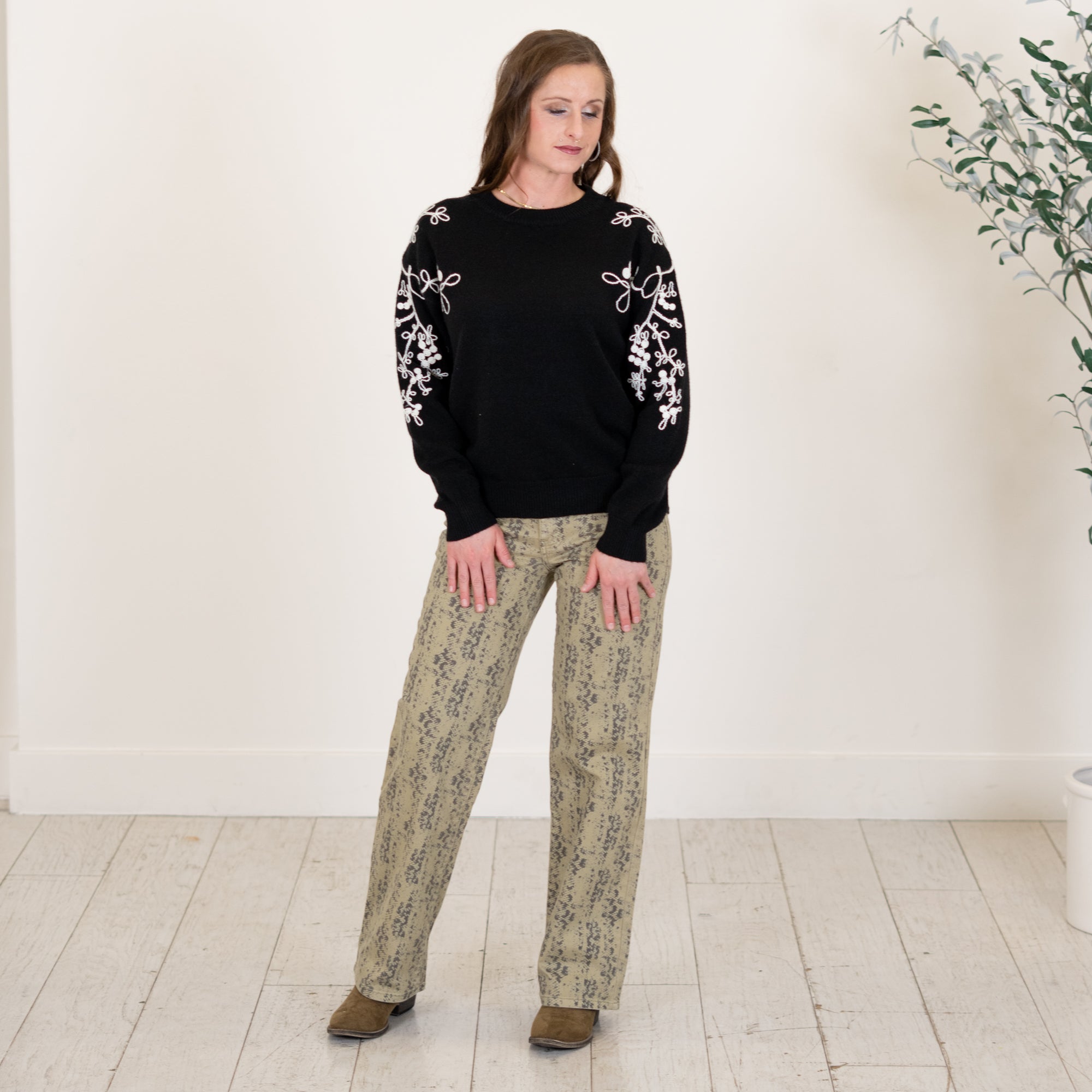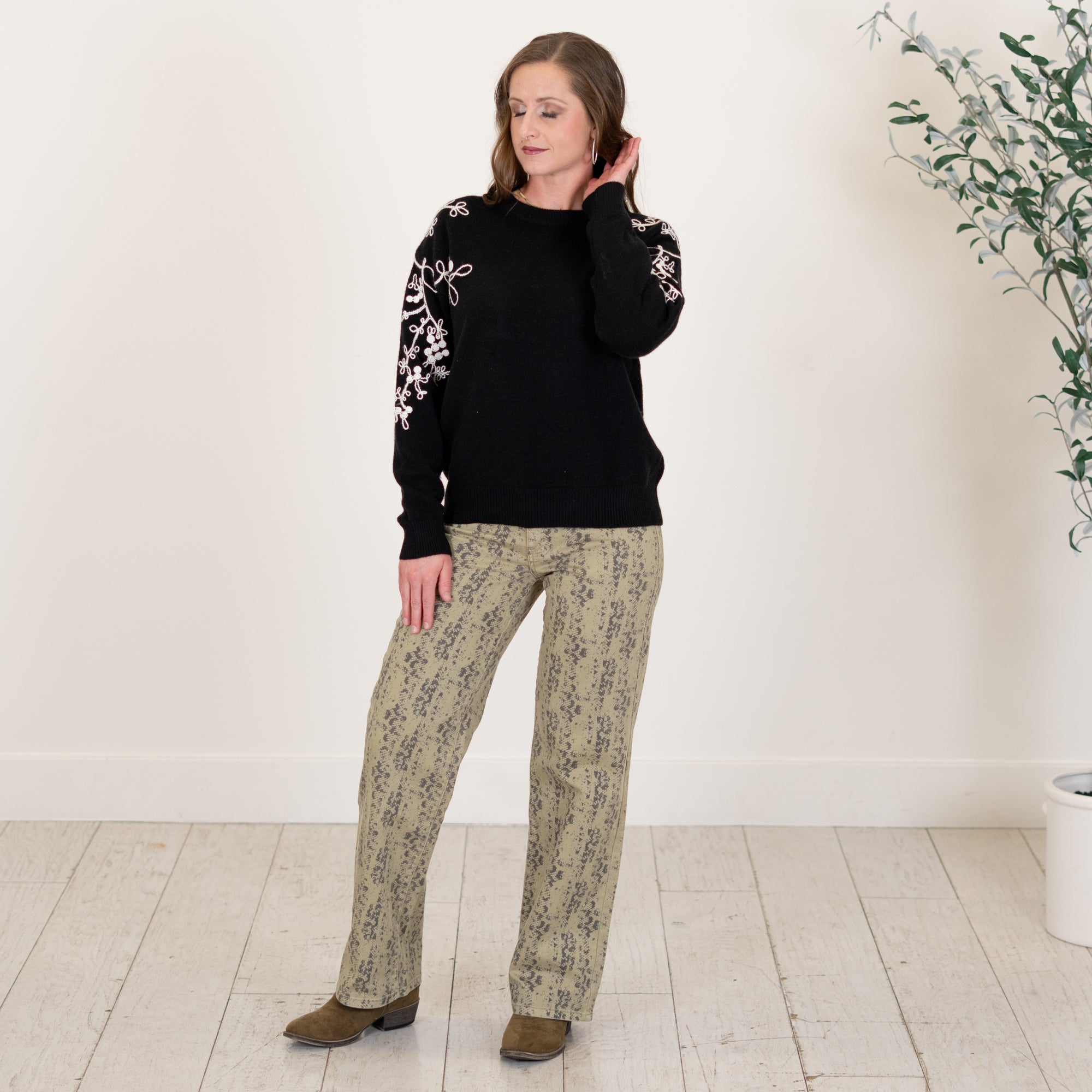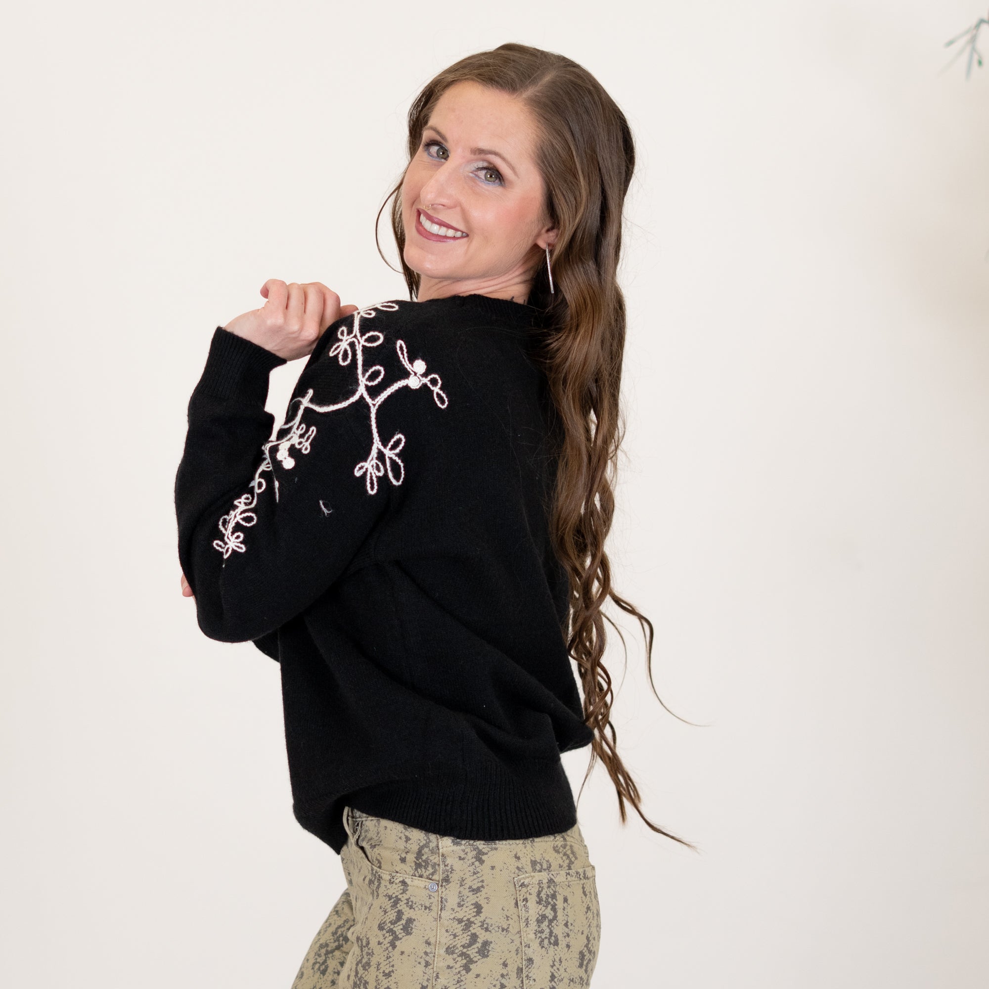 Hem & Thread Embroidered Crew Neck Pullover Sweater Black