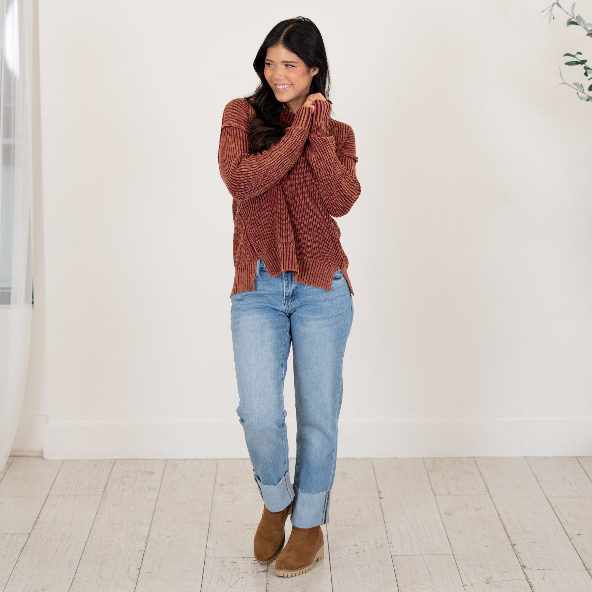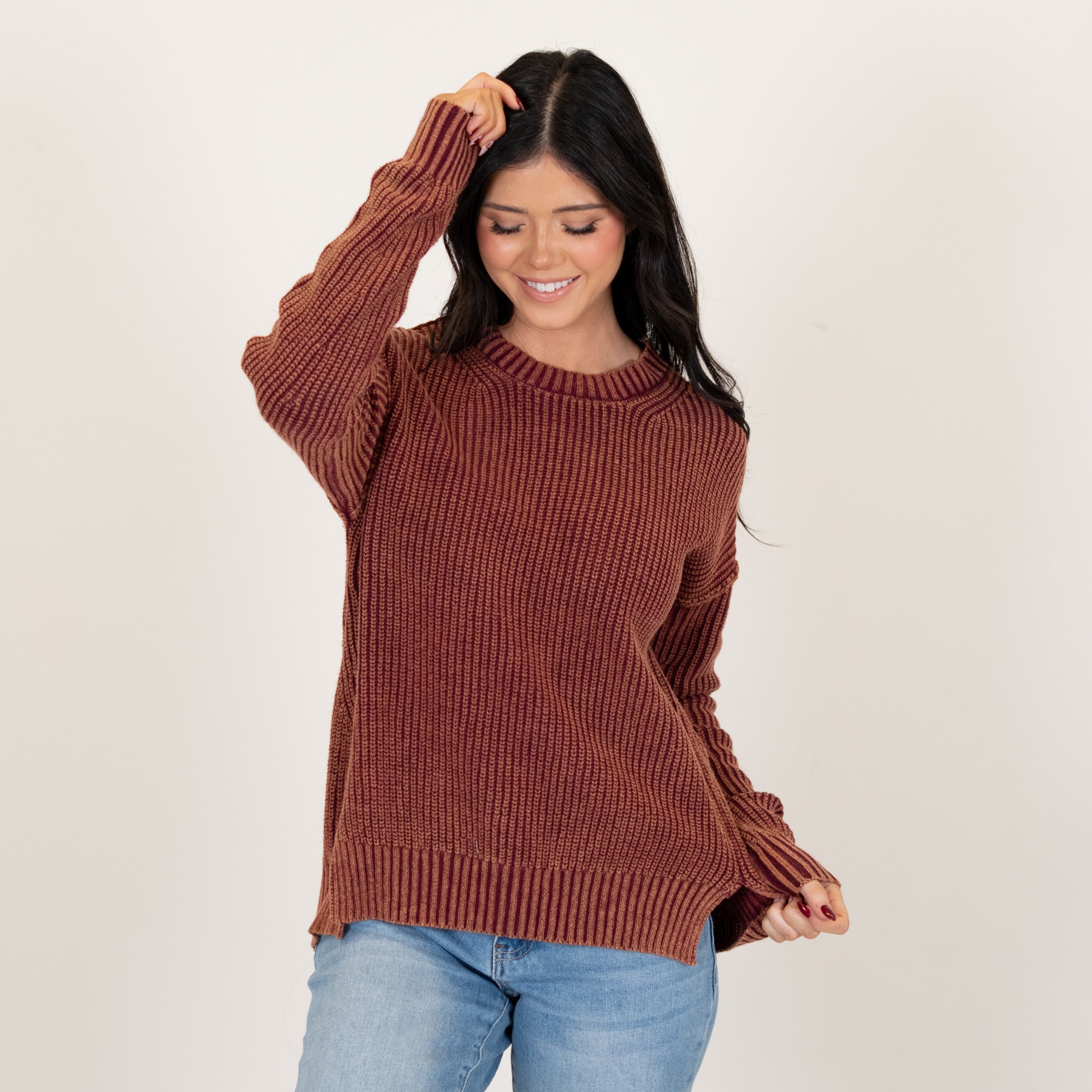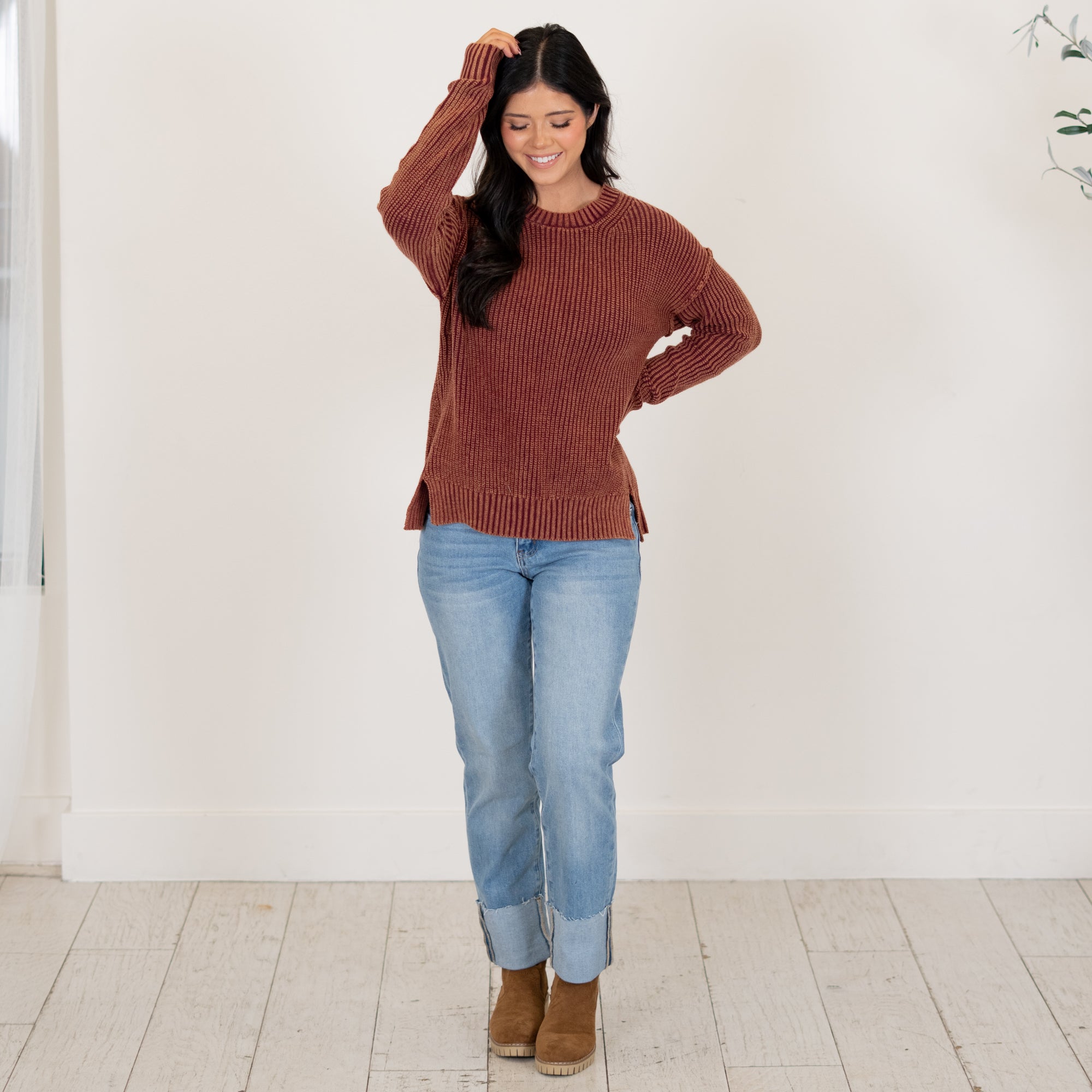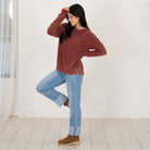 This split hem crew neck sweater is designed with an easy oversized fit for effortless, everyday wear. The relaxed silhouette drapes comfortably while the split hem adds subtle movement and dimension. A go-to layer that styles beautifully with denim for a cozy yet polished look.