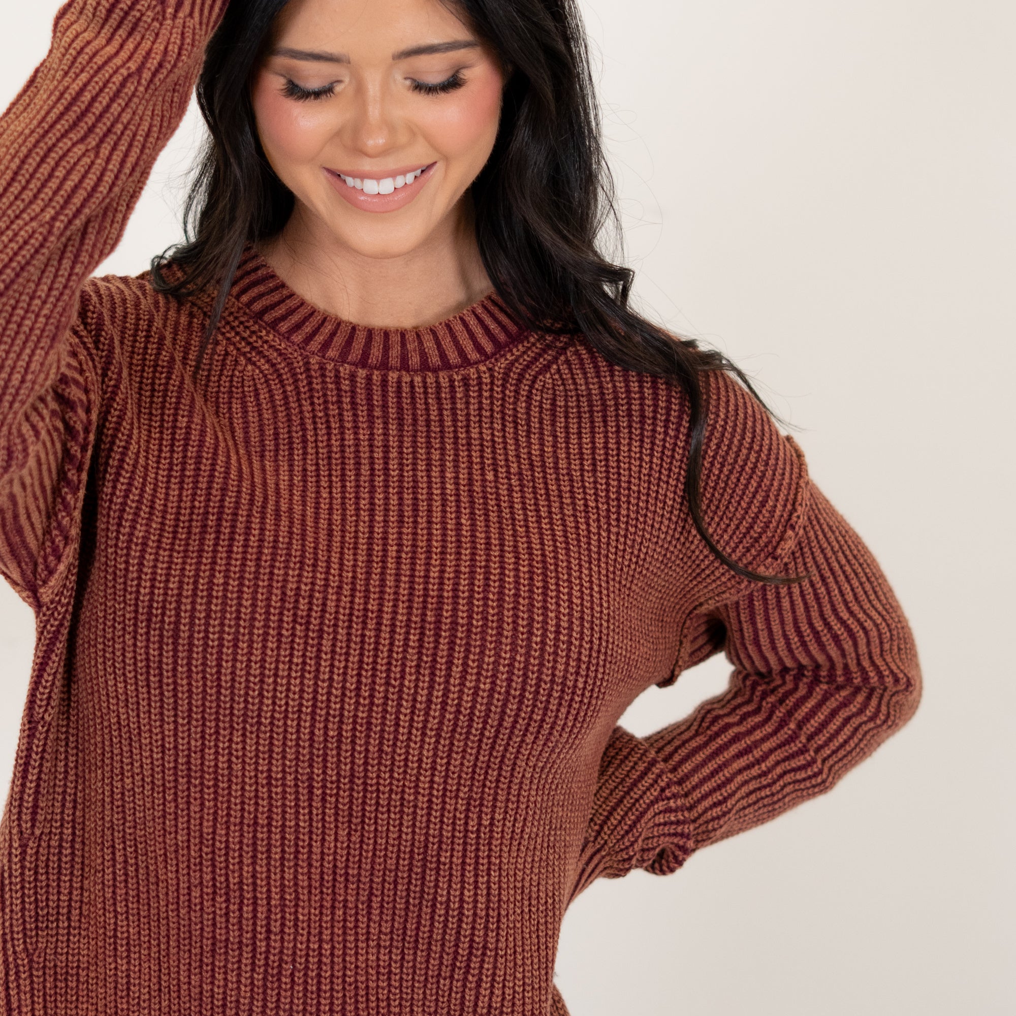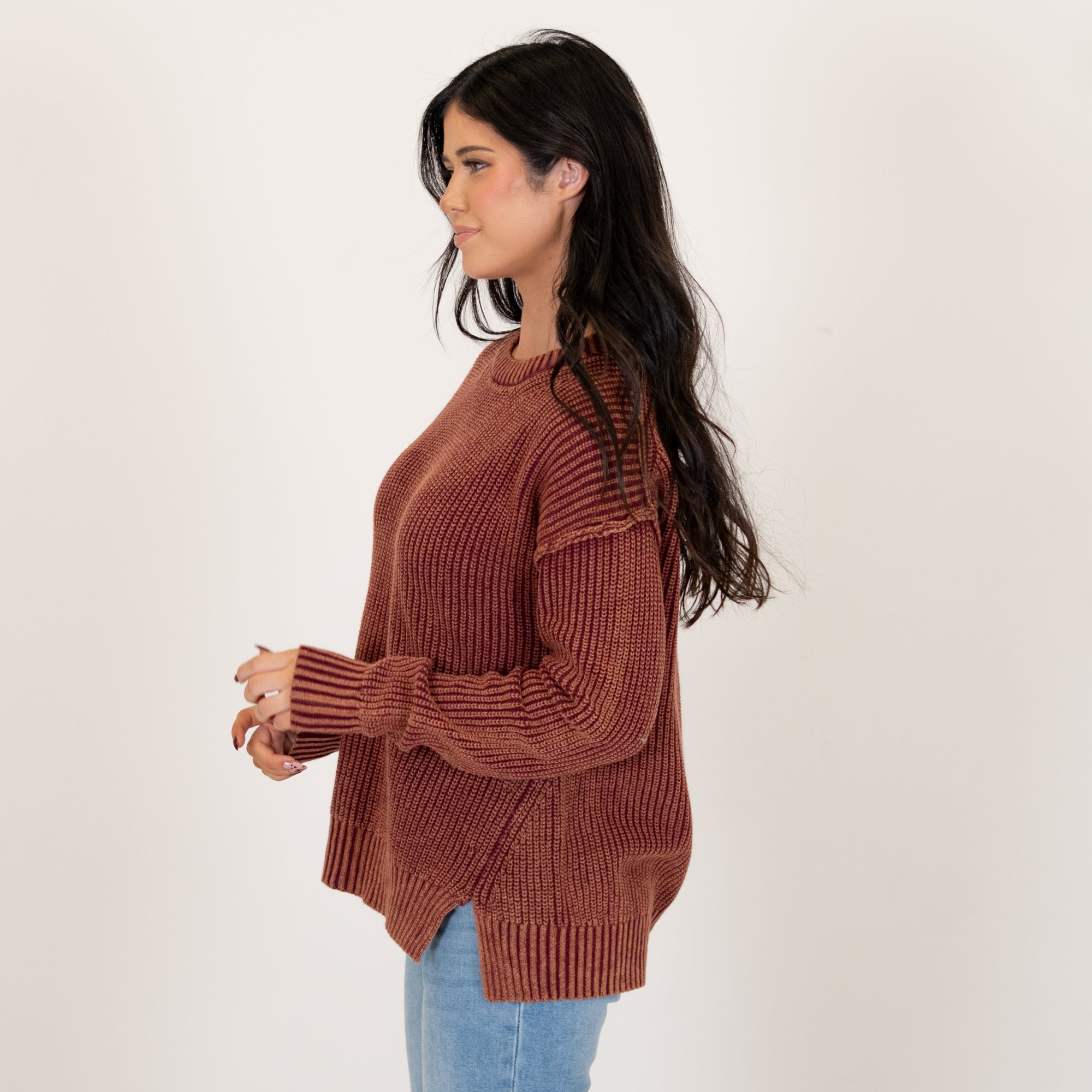 Hem & Thread Split Hem Crew Neck Oversized Sweater Wine