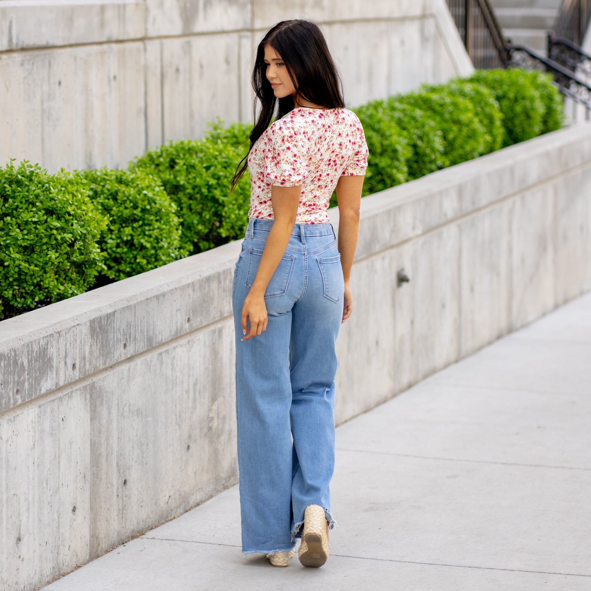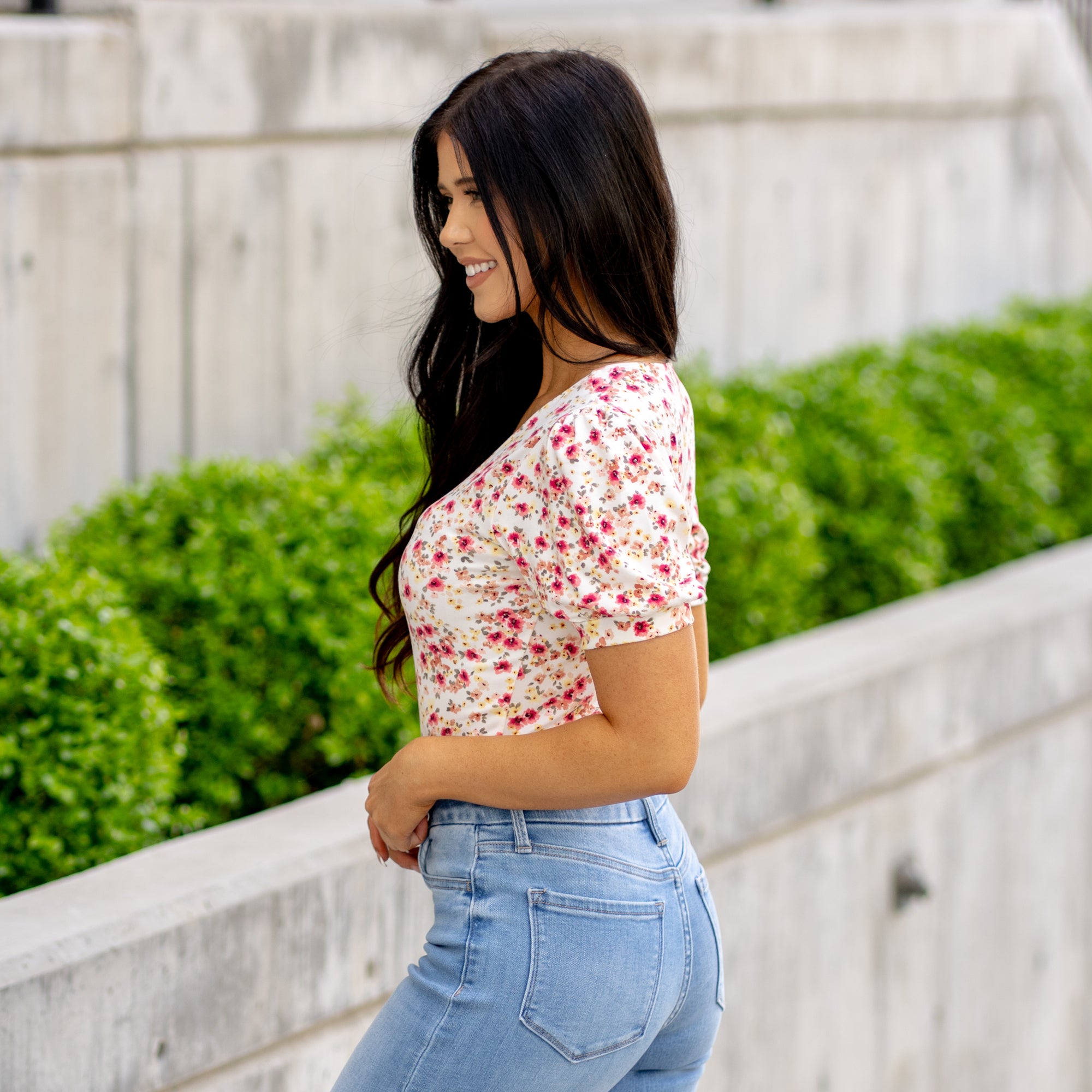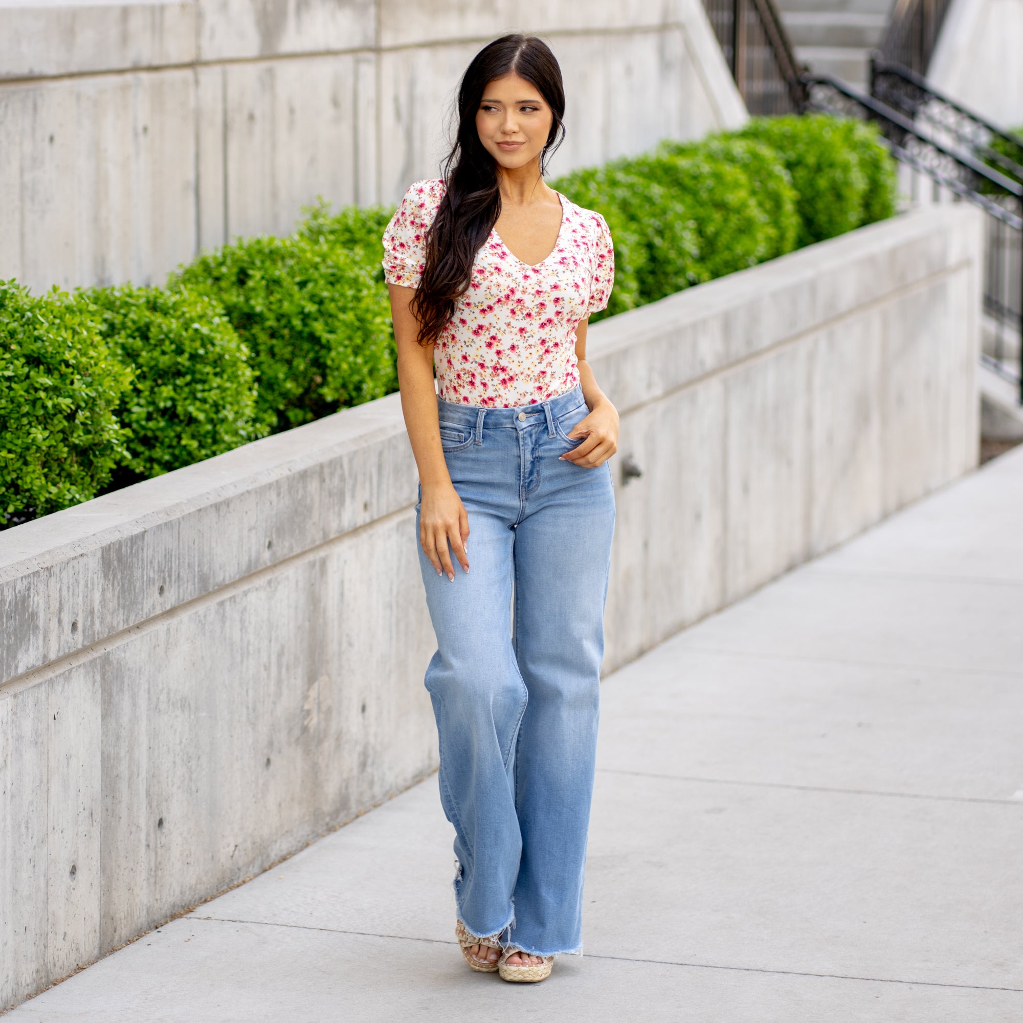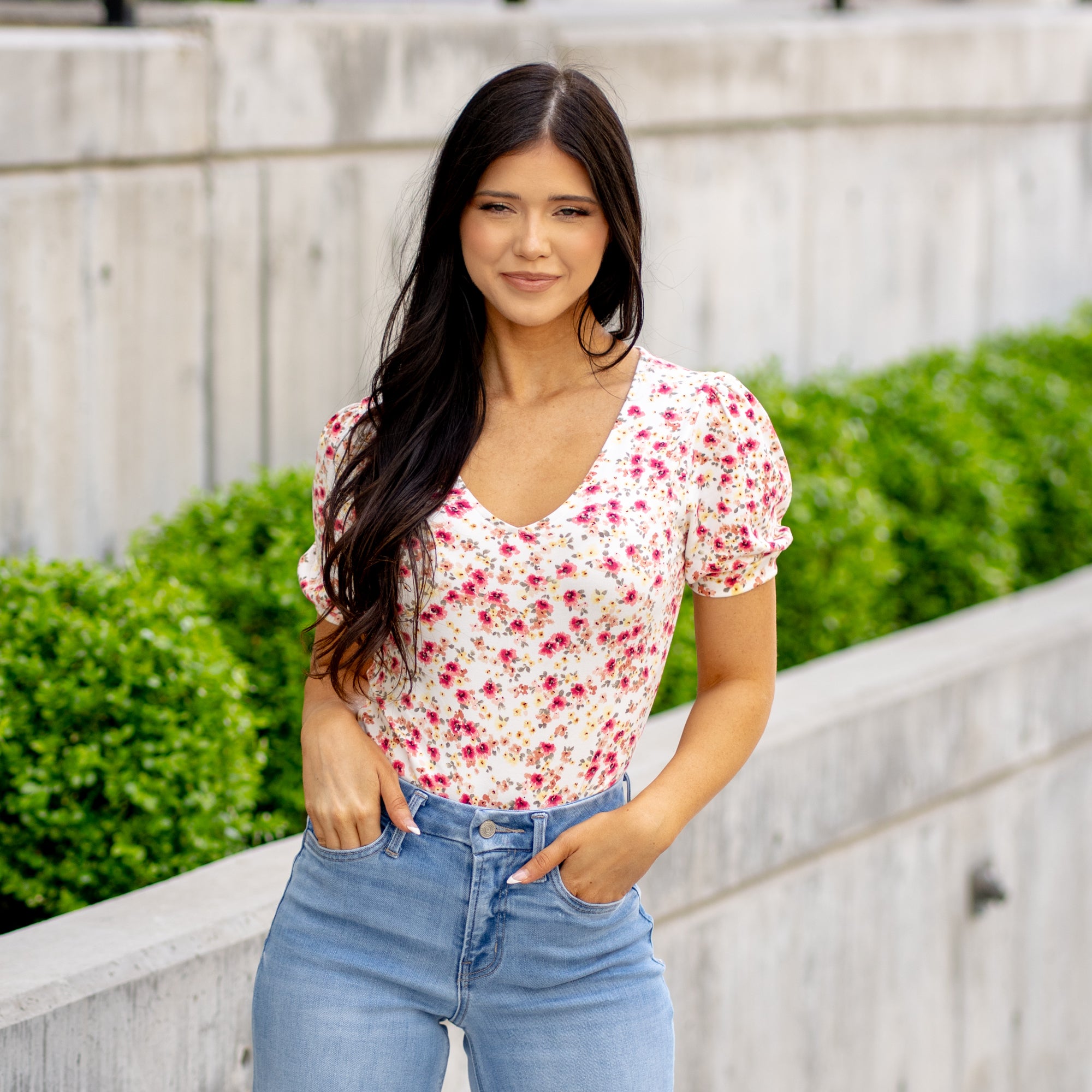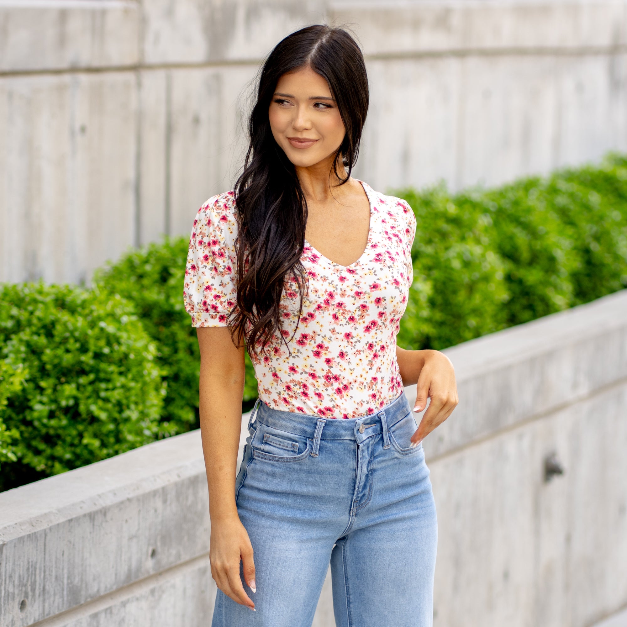 This one's giving sweet and spicy. The Blossom Babe Bodysuit is covered in a pretty ditsy floral print with a flattering v-neckline and puff sleeves for that flirty vibe we’re loving. The soft knit fabric hugs in all the right places, and the snap button closure keeps things comfy and secure. Pair it with your favorite high-rise denim or a flowy skirt—either way, it’s a total outfit-maker.