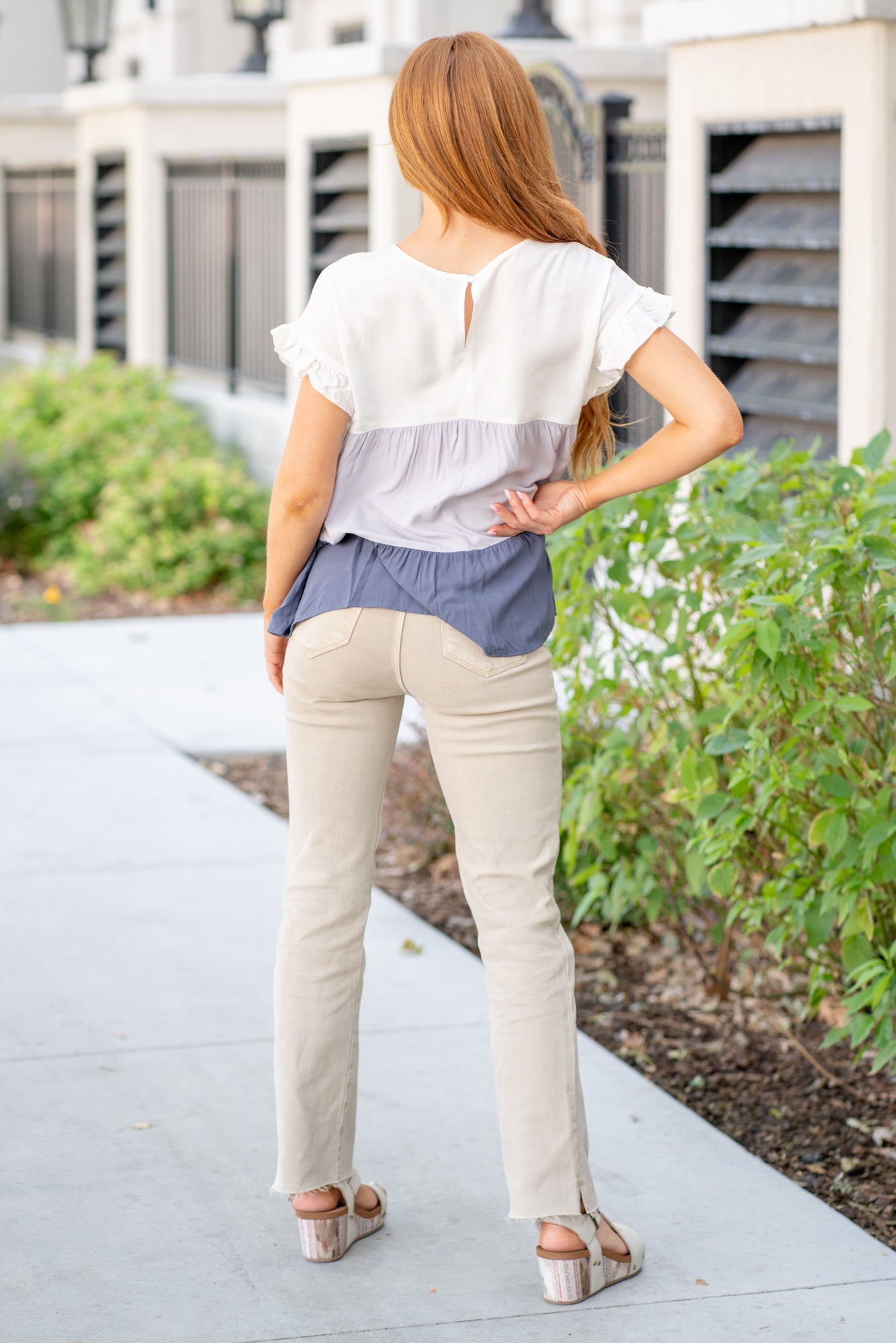 This top makes a statement with ruffle sleeves and color block design. She's comfortable for all day wear, has a figure-flattering fit and features the cutest ruffle details. Style effortlessly with jeans shorts.