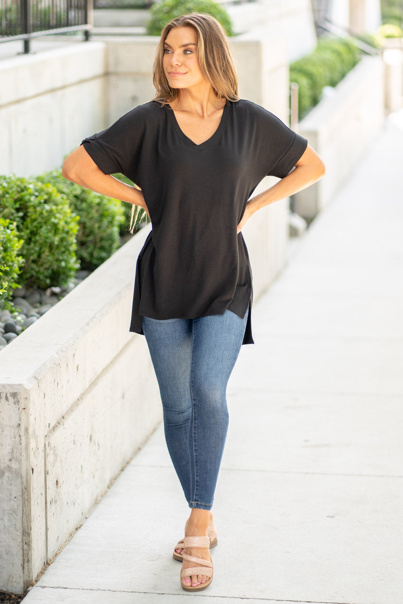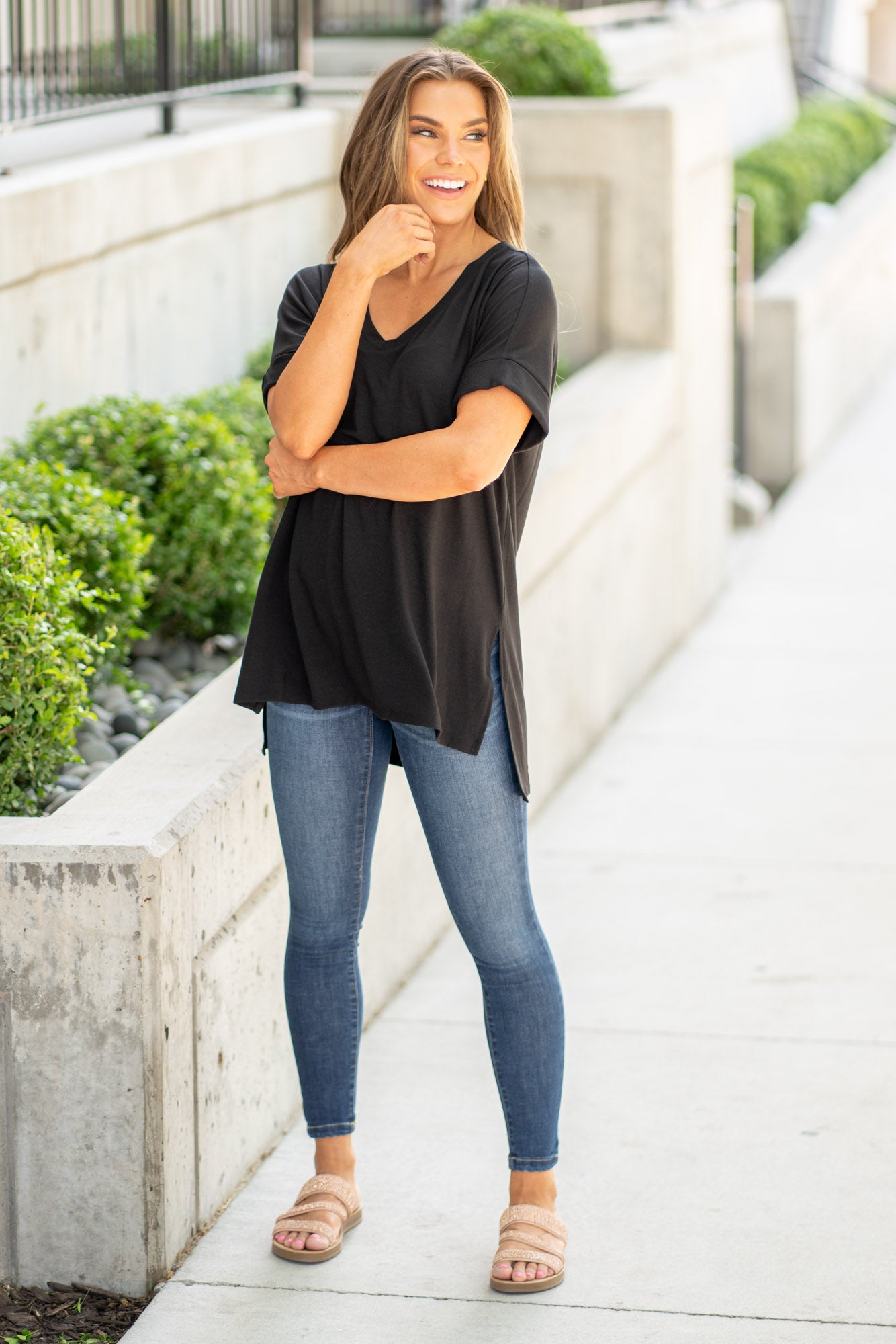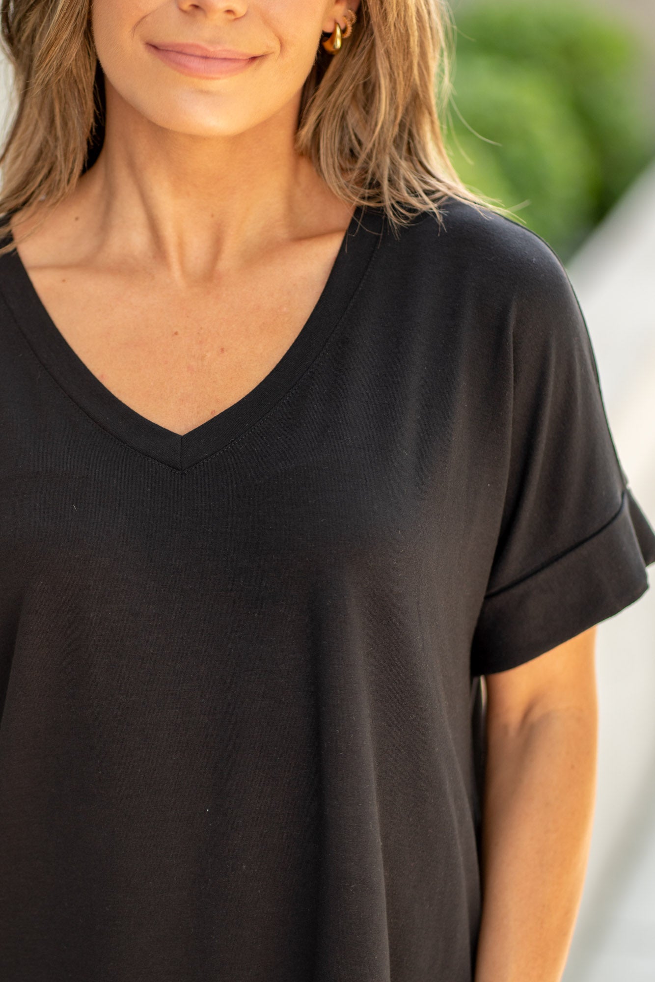 Super Soft High Low Hem V Neck Top - Black T-Shirt