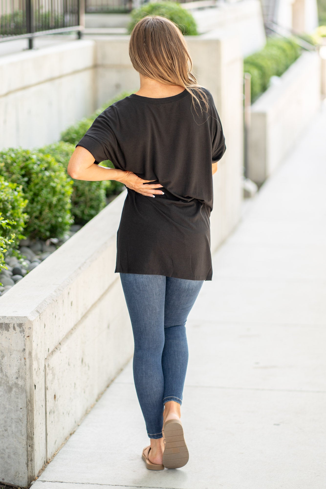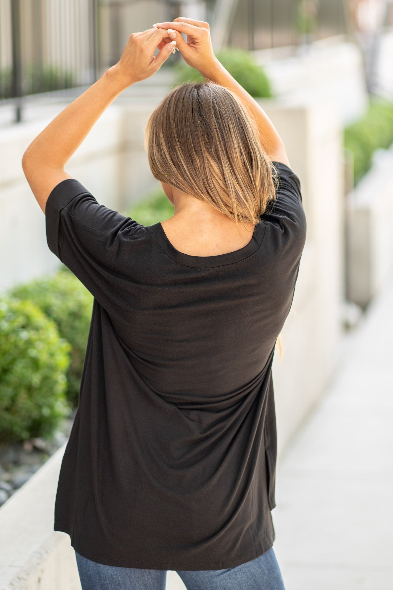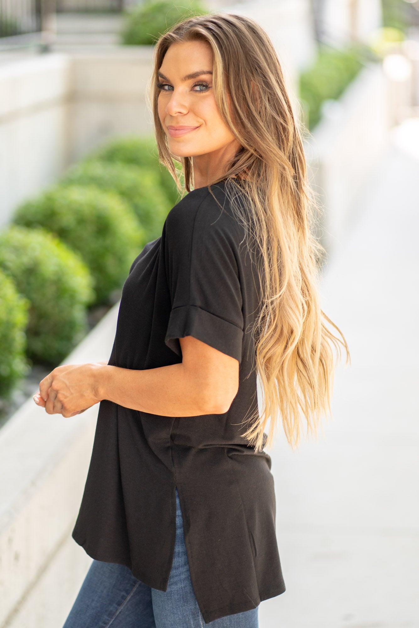 Super Soft High Low Hem V Neck Top - Black T-Shirt