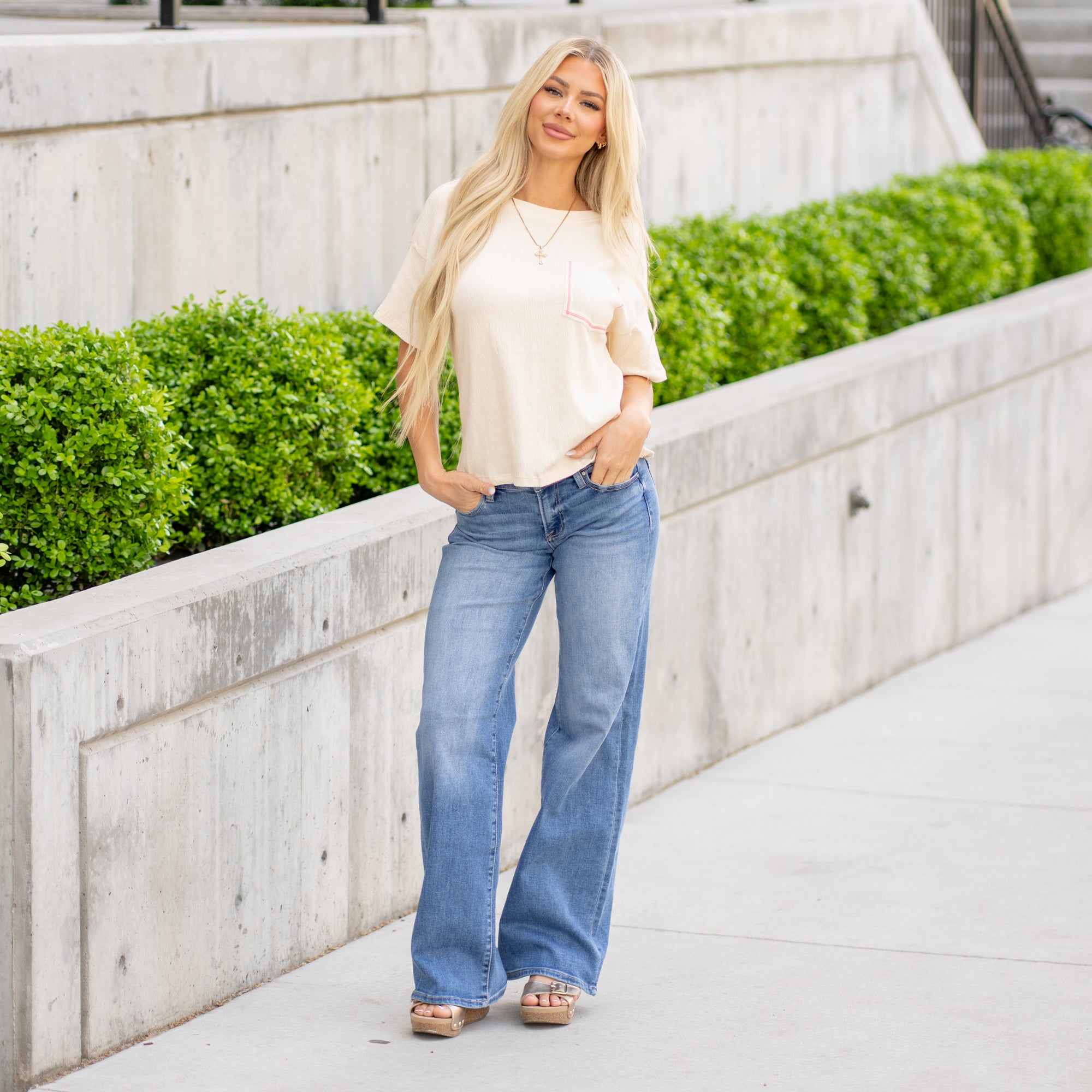 Your not-so-basic basic. The Threaded Touch Knit Tee takes a classic silhouette and adds a little twist with contrast thread detailing across the front. Soft, comfy, and easy to style—this short sleeve knit is perfect for throwing on with jeans, cutoffs, or layered under a denim jacket. It’s effortless style with just the right amount of edge.