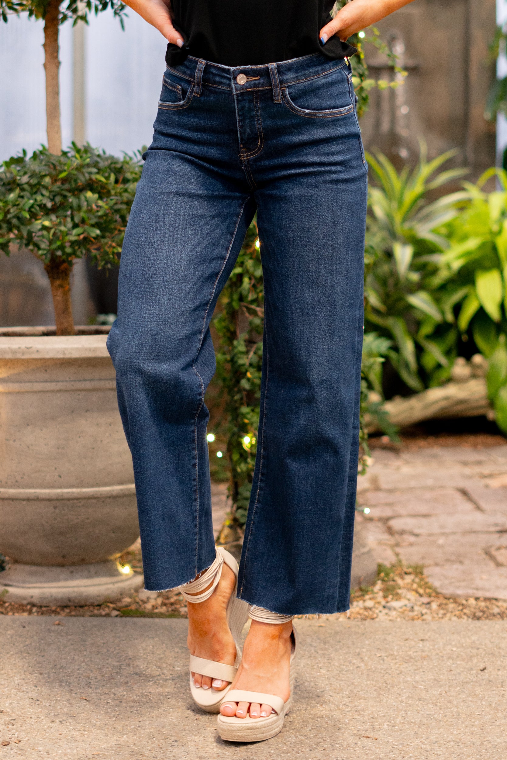 Introducing our Tummy Control Top High Rise Wide Leg jeans, designed to provide both style and comfort. These jeans feature a high-rise waist with a tummy control top for a flattering fit, paired with a wide-leg silhouette for a trendy and relaxed look. Crafted in a dark wash denim with slight distressing and a released hem, these jeans add a touch of casual charm to any outfit.