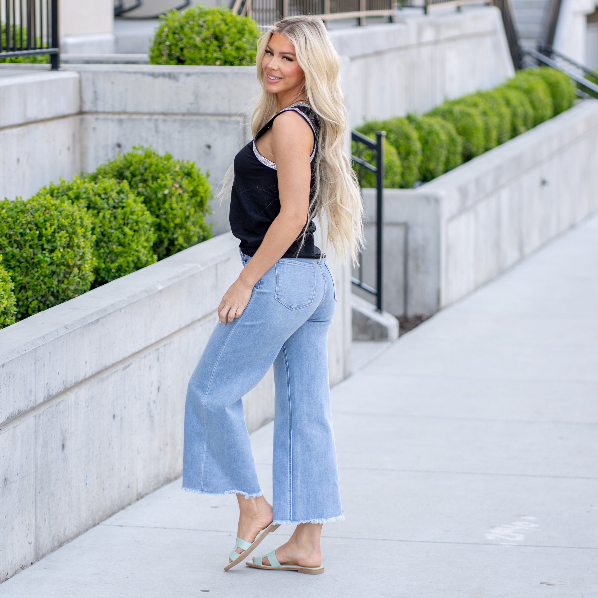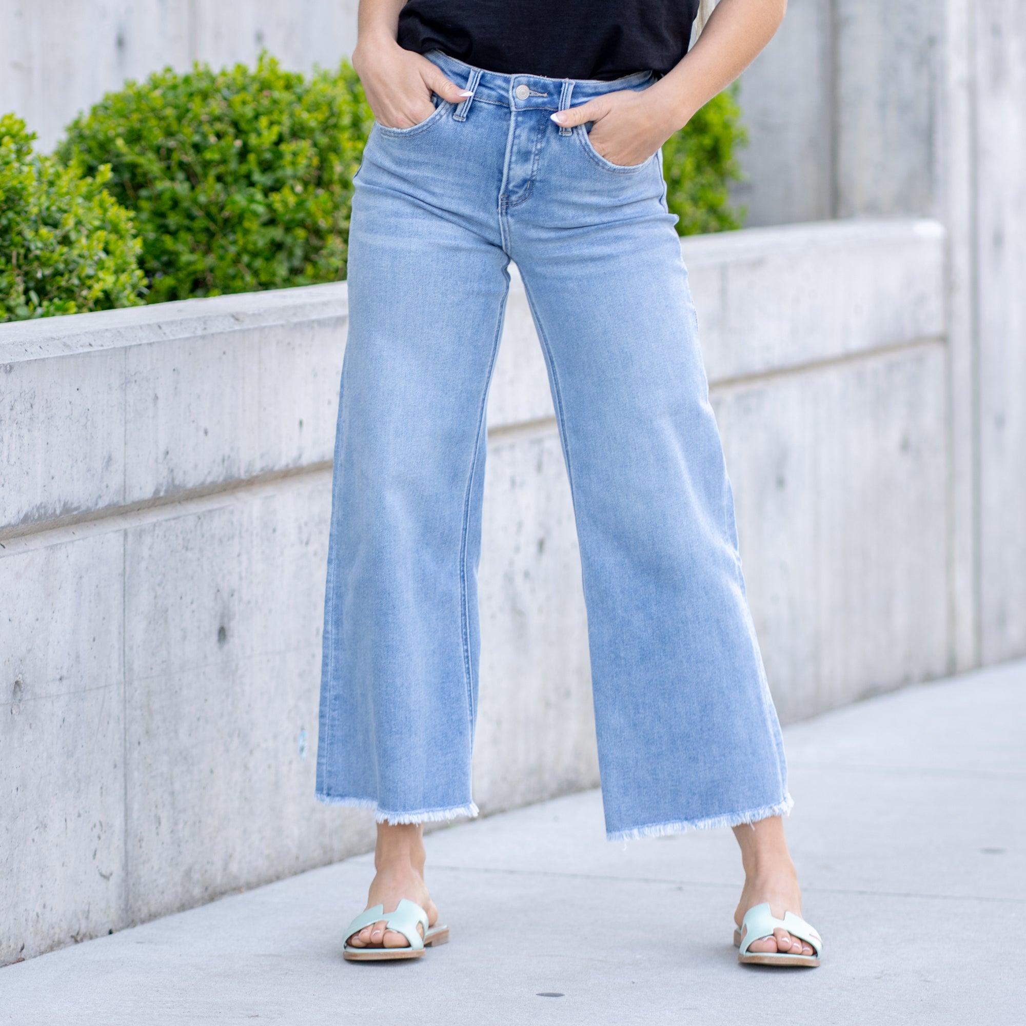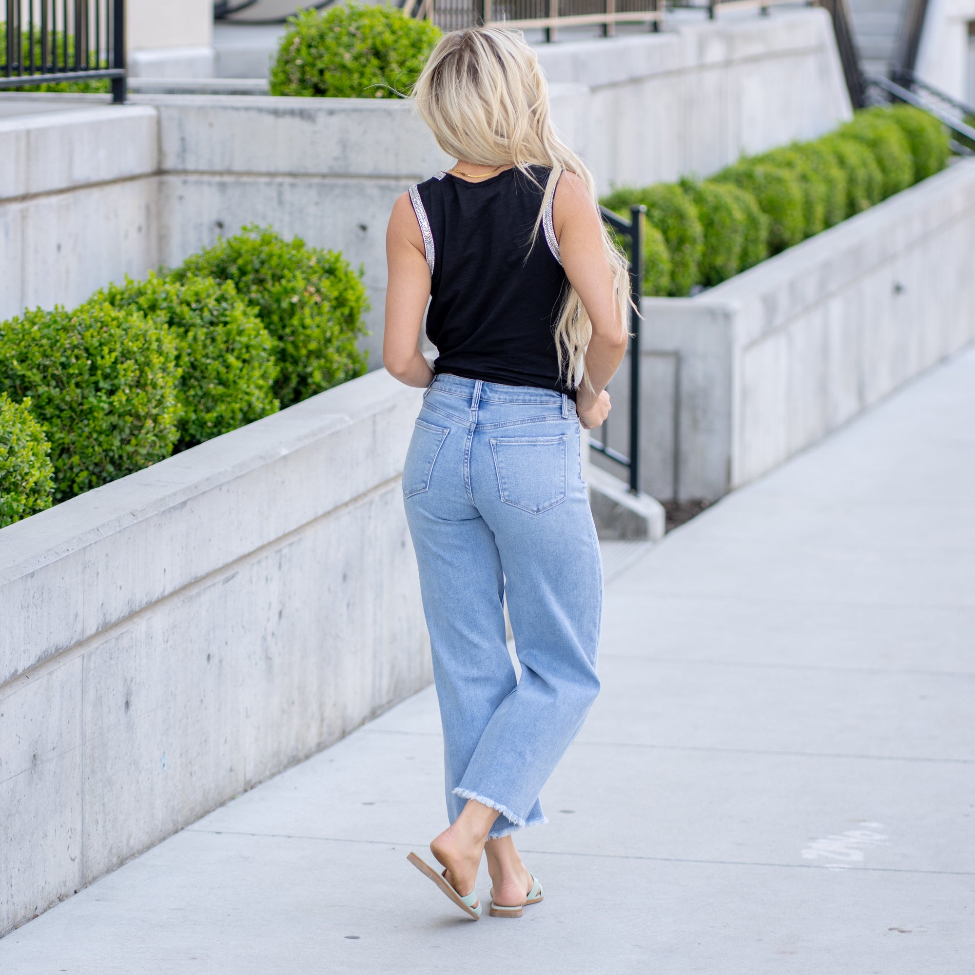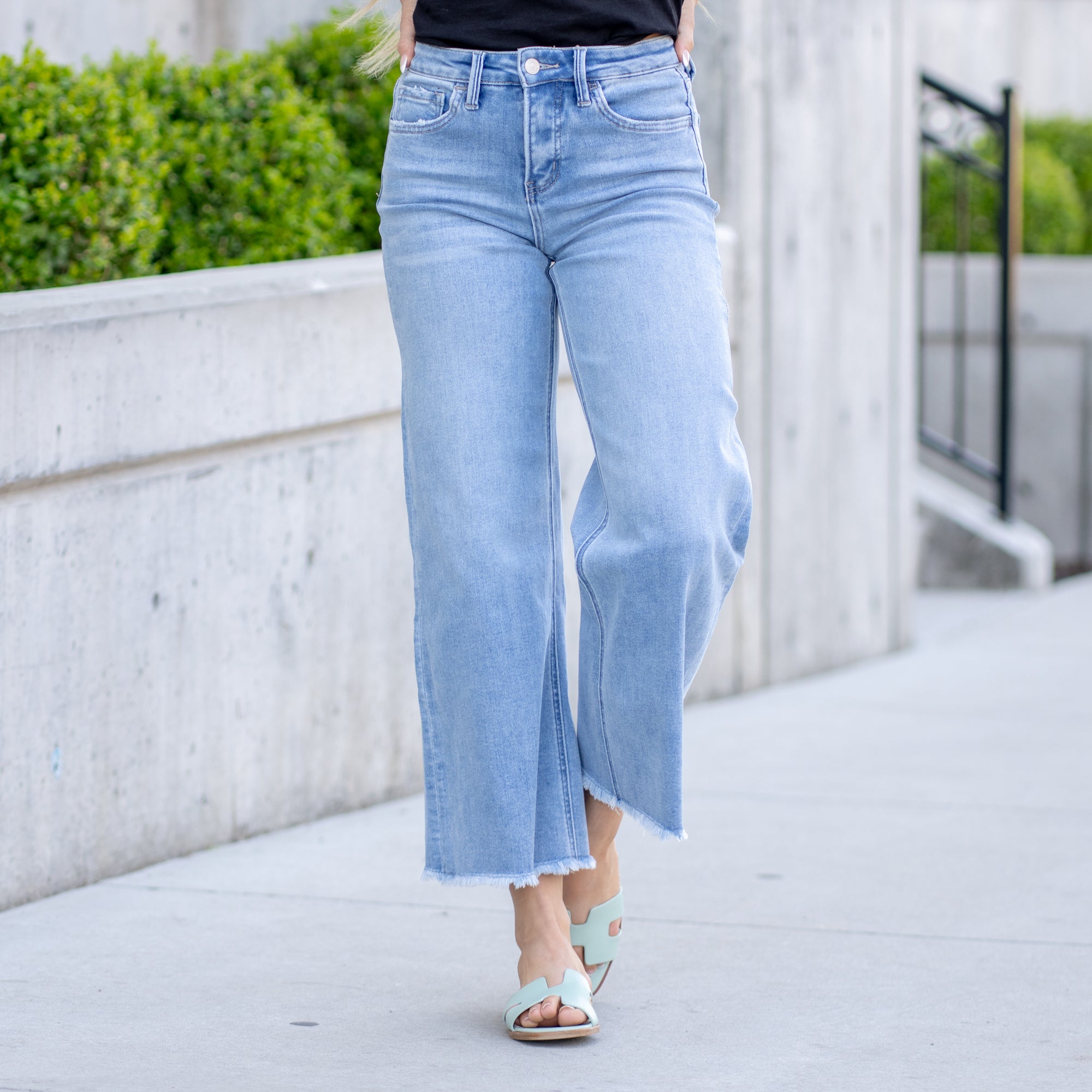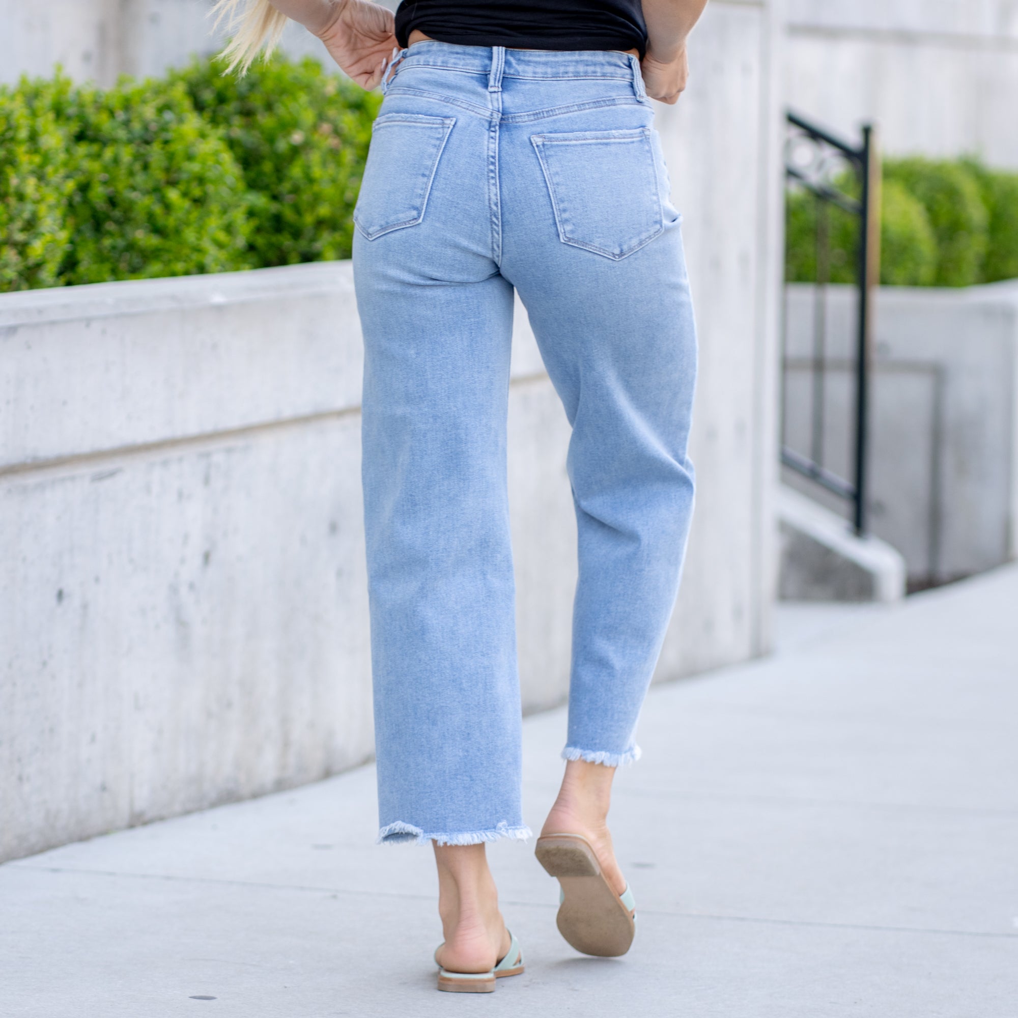 The Resilient jeans do the heavy lifting—so you don’t have to. Built with hidden tummy control panels and a seamless waistband, they smooth and support in all the right places. The high rise waist, wide leg fit, and ankle-length frayed hem bring the fashion, while the comfort stretch denim makes them an everyday go-to. Confidence, built in.