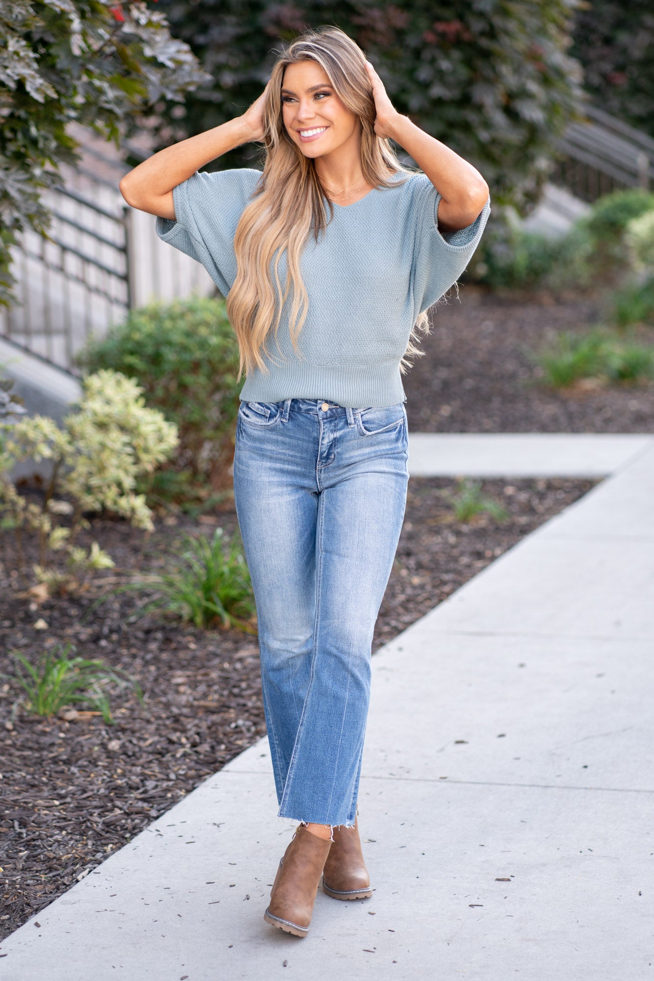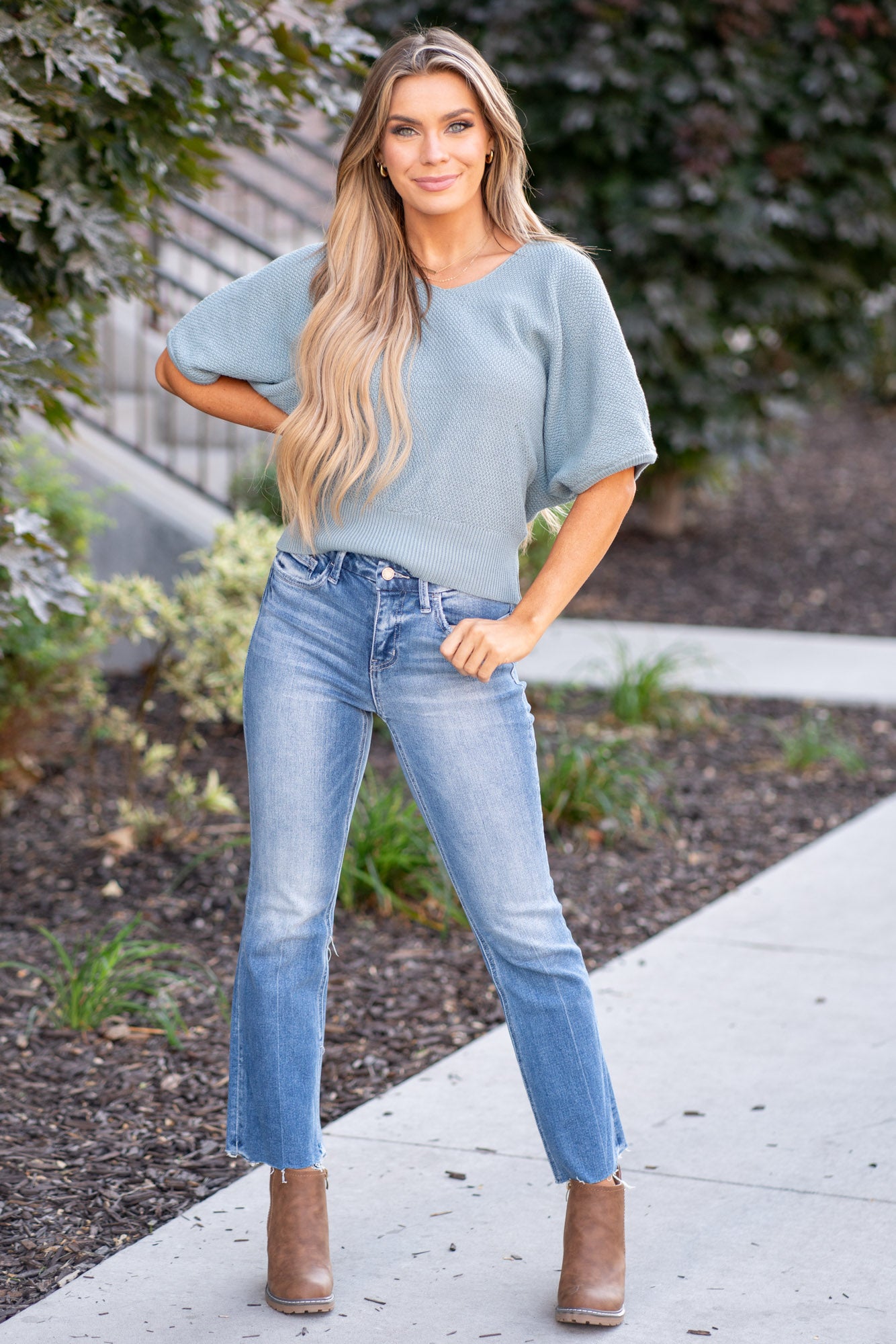 VERVET Divine High Rise Distressed Hem Kick Flare Jeans Medium Blue
