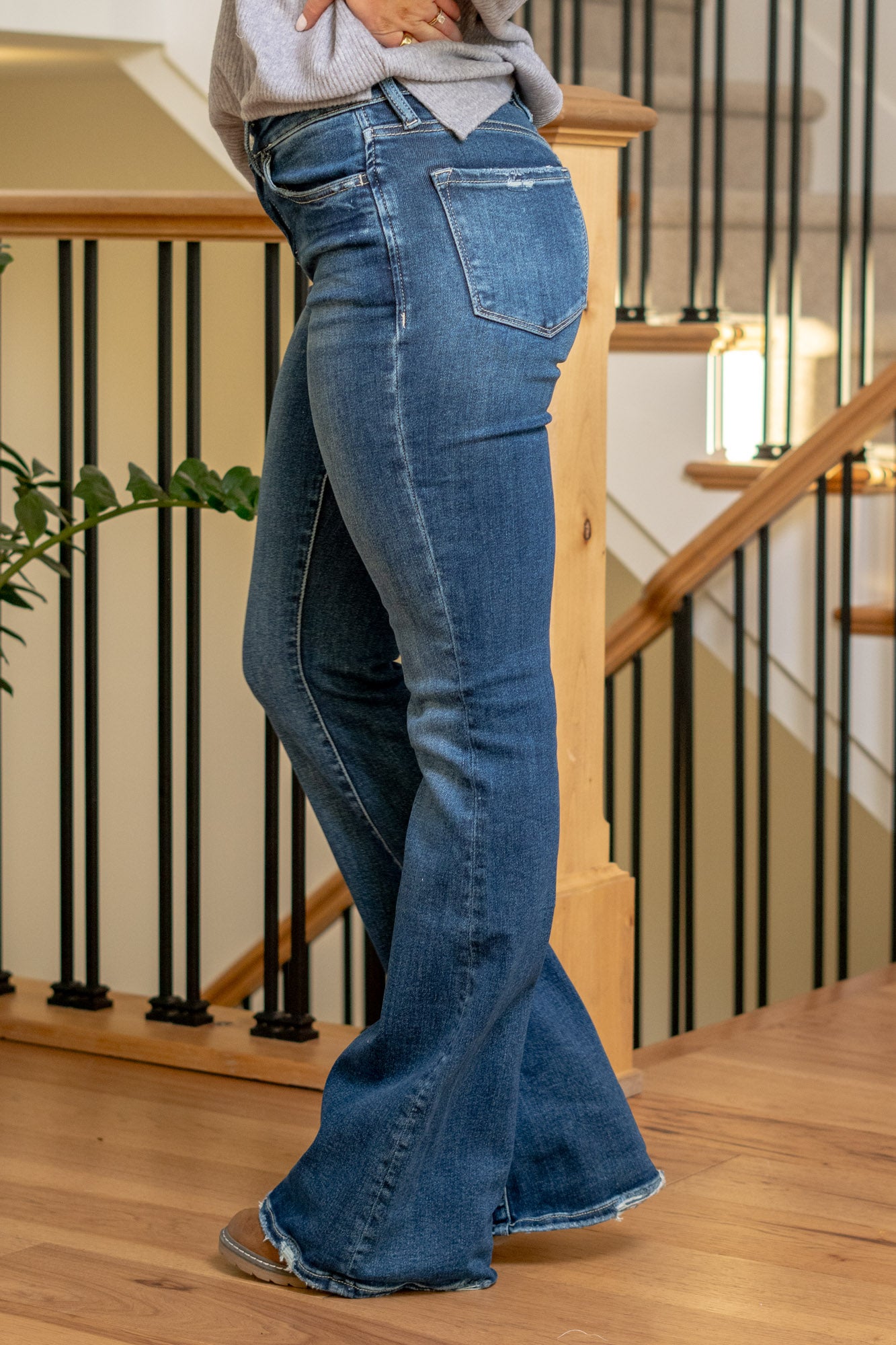 VERVET Inspirational High Rise Raw Hem Kick Flare Jeans Regular & Plus Sizes Dark Blue Wash