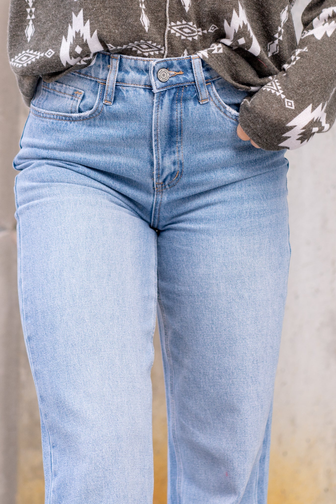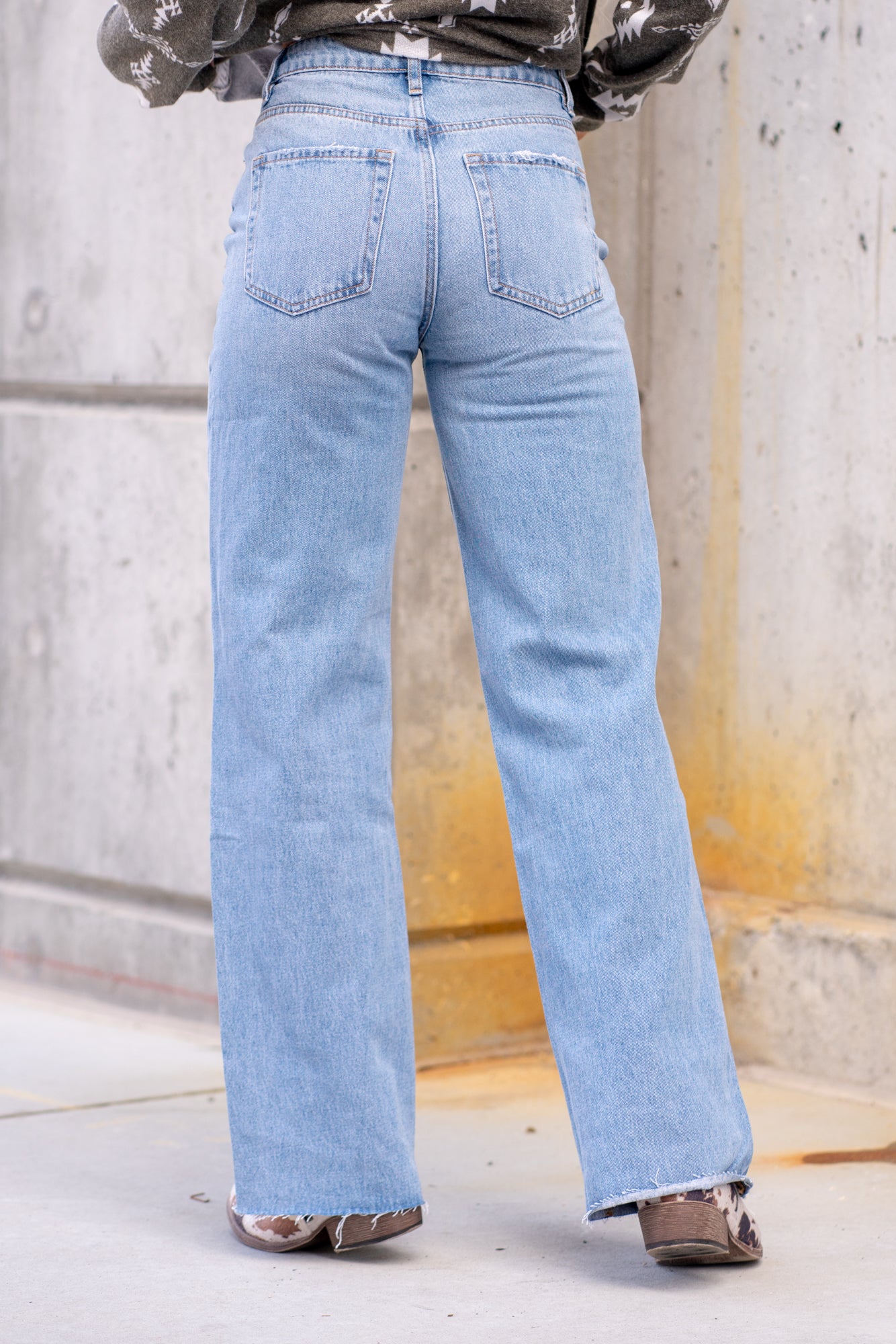These jeans feature a high waist with a button fly and loose-fitted legs.