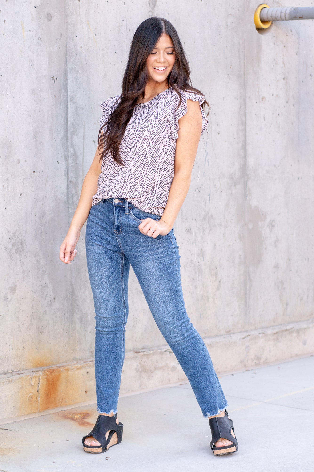 Jori wears a size 25 in jeans, a small in tops, and 7 in shoes. She is wearing size 25 in these jeans.