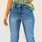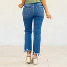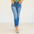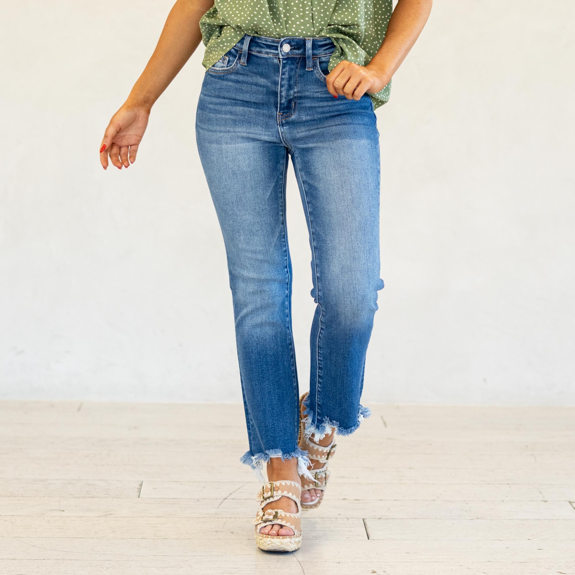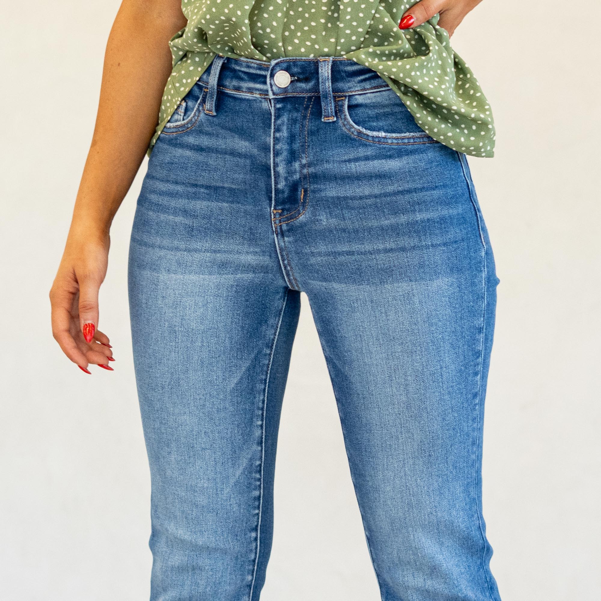 VERVET Divine High Rise Distressed Hem Kick Flare Jeans Medium Blue