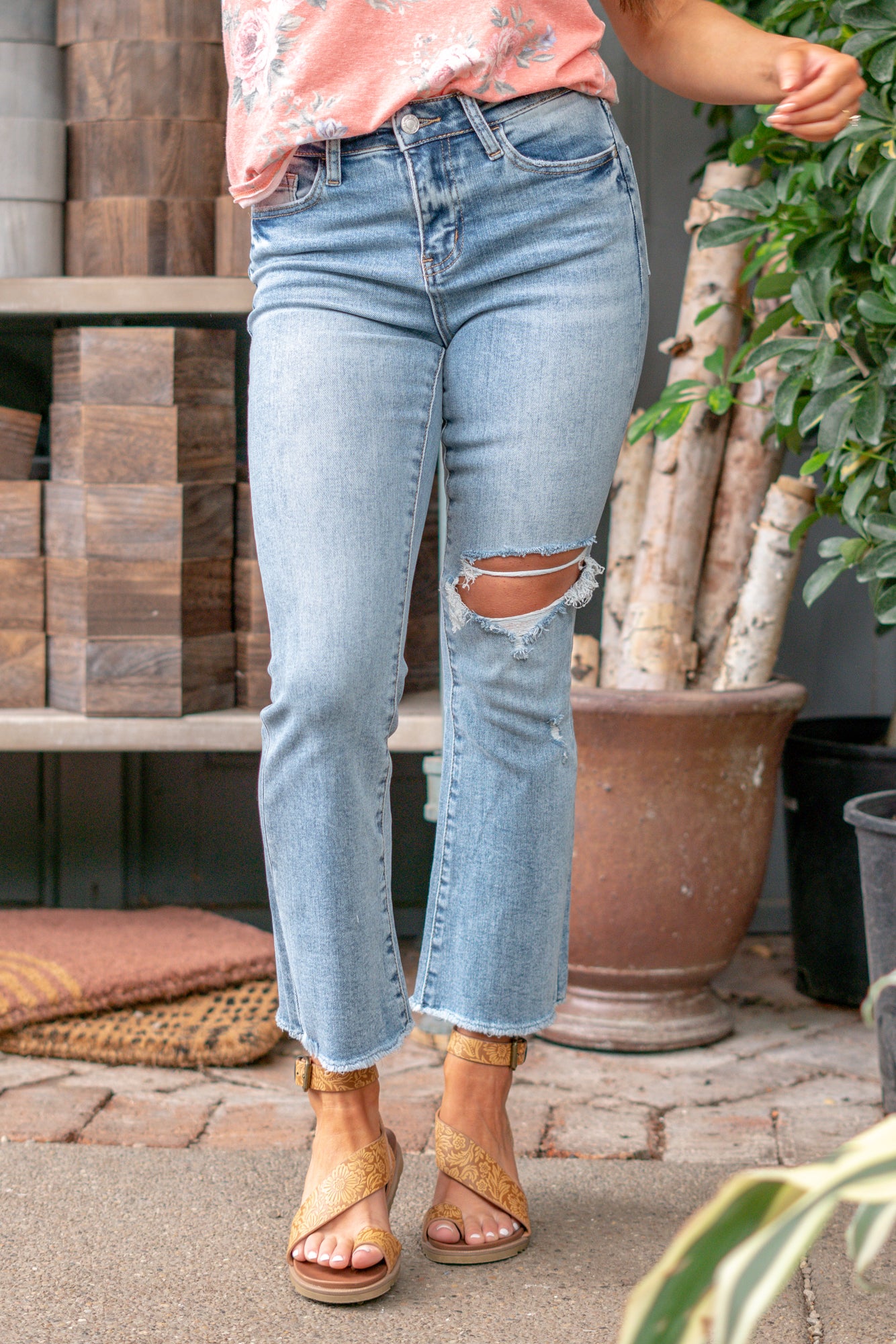 Comfort-stretch denim, high rise waist, kick flare style, zipper fly closure, whiskering, and a fray hem.- Kick Flare, 26.5" Inseam*